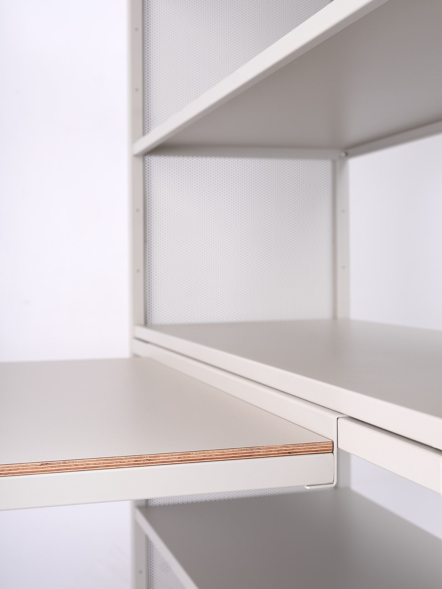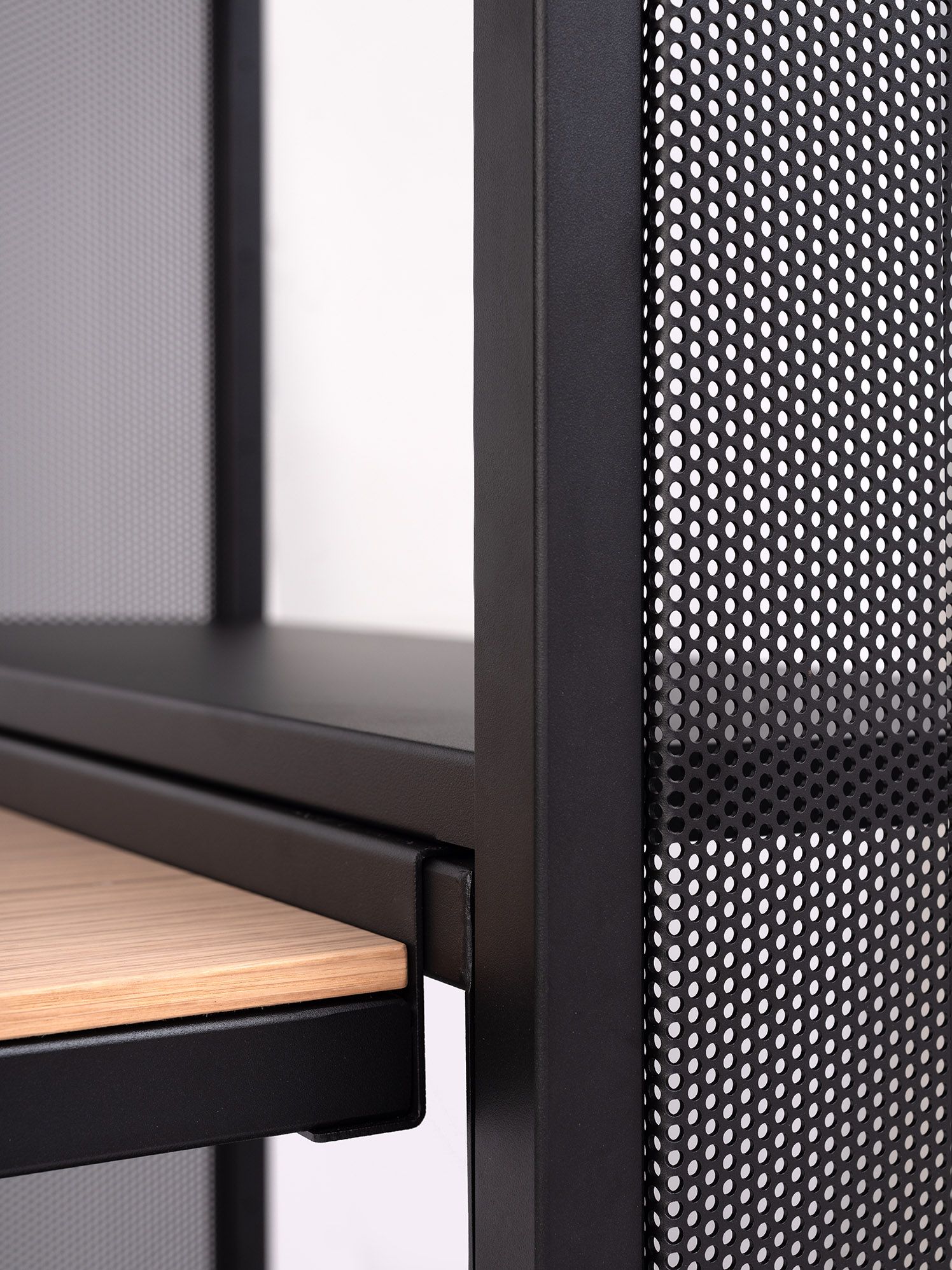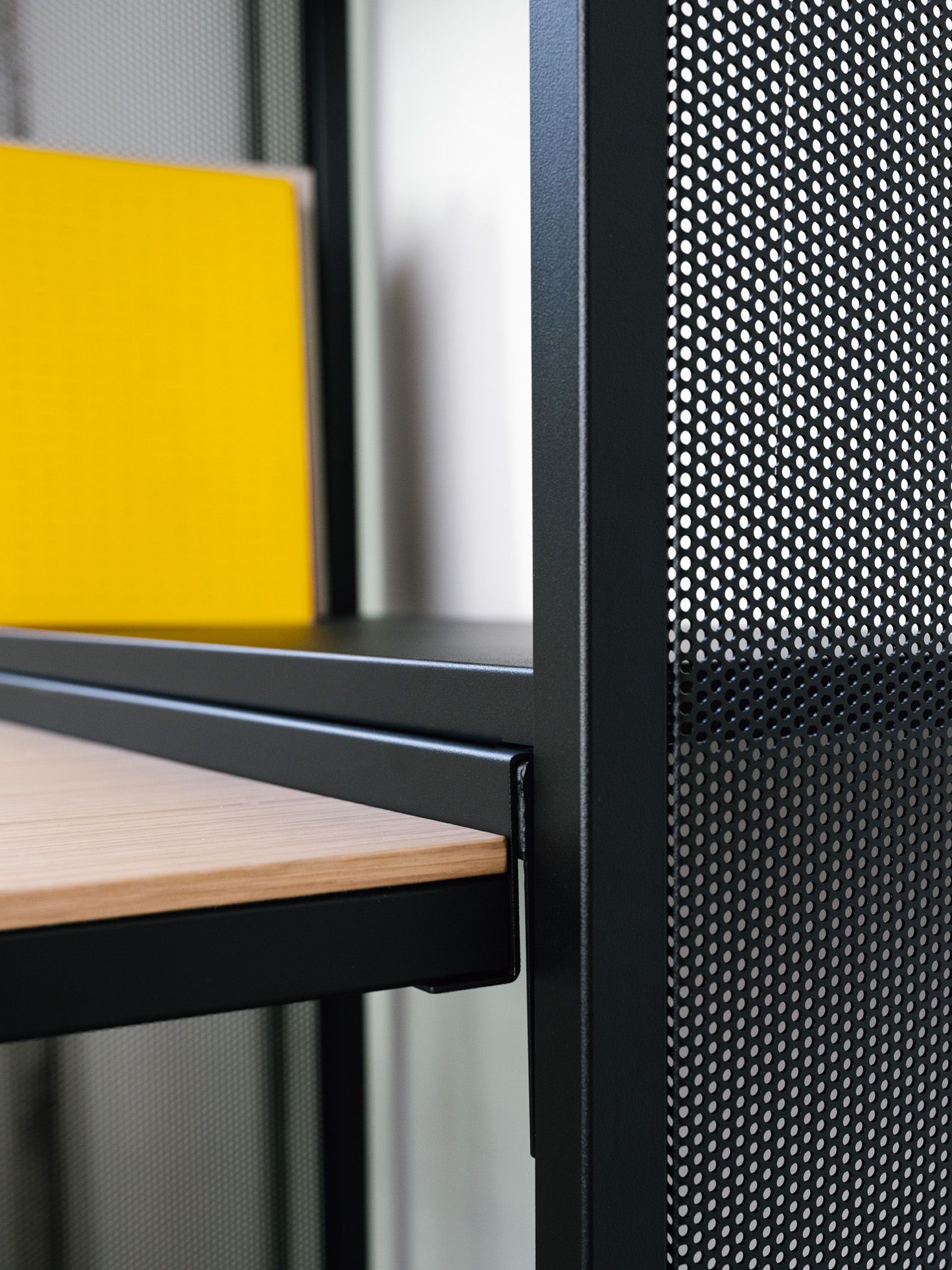 Struktur aus präzisionsgefertigten quadratischen Stahlrohren mit 30 mm Seitenlänge und 2 mm Dicke, aus recyceltem kaltgewalztem Stahl. Die Regale bestehen aus 1,5 mm dickem Stahlblech mit Epoxidbeschichtung.