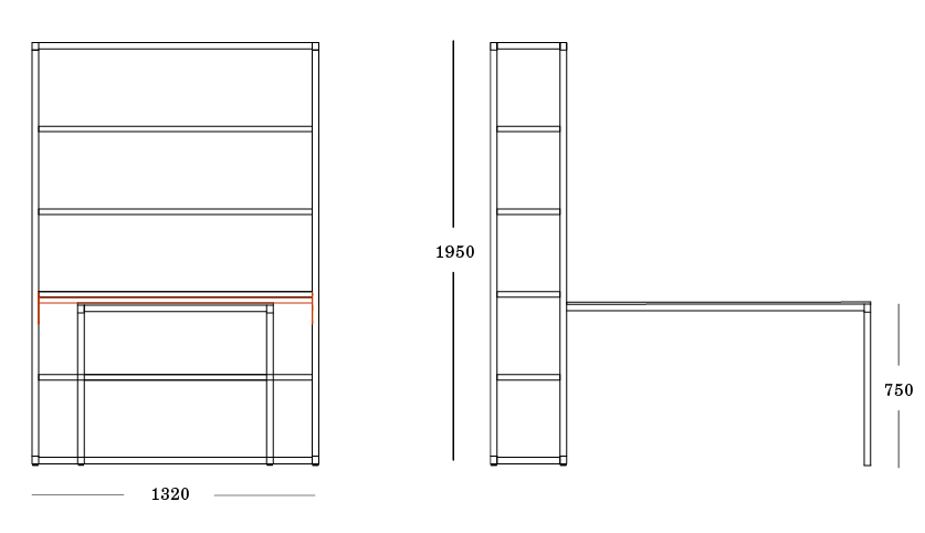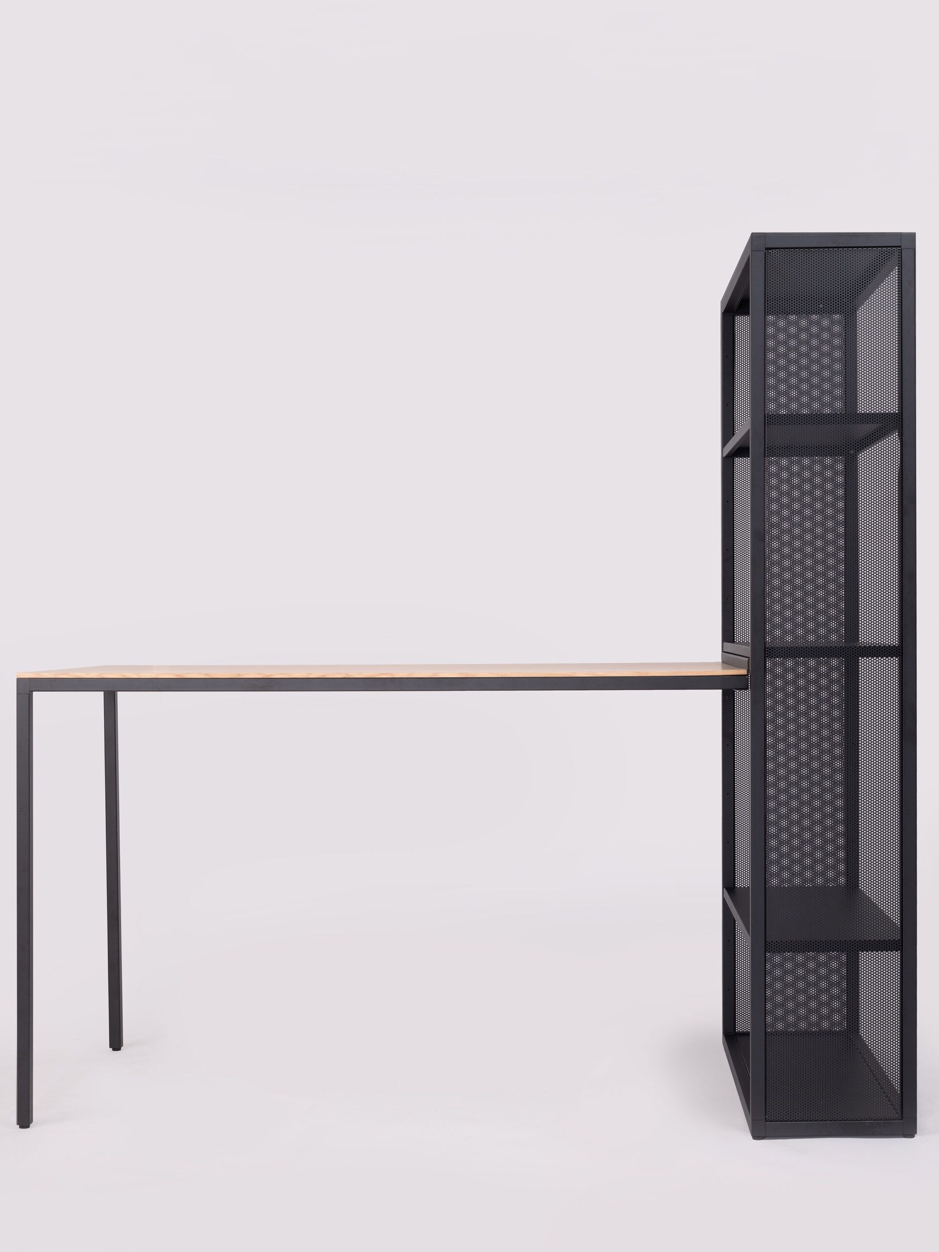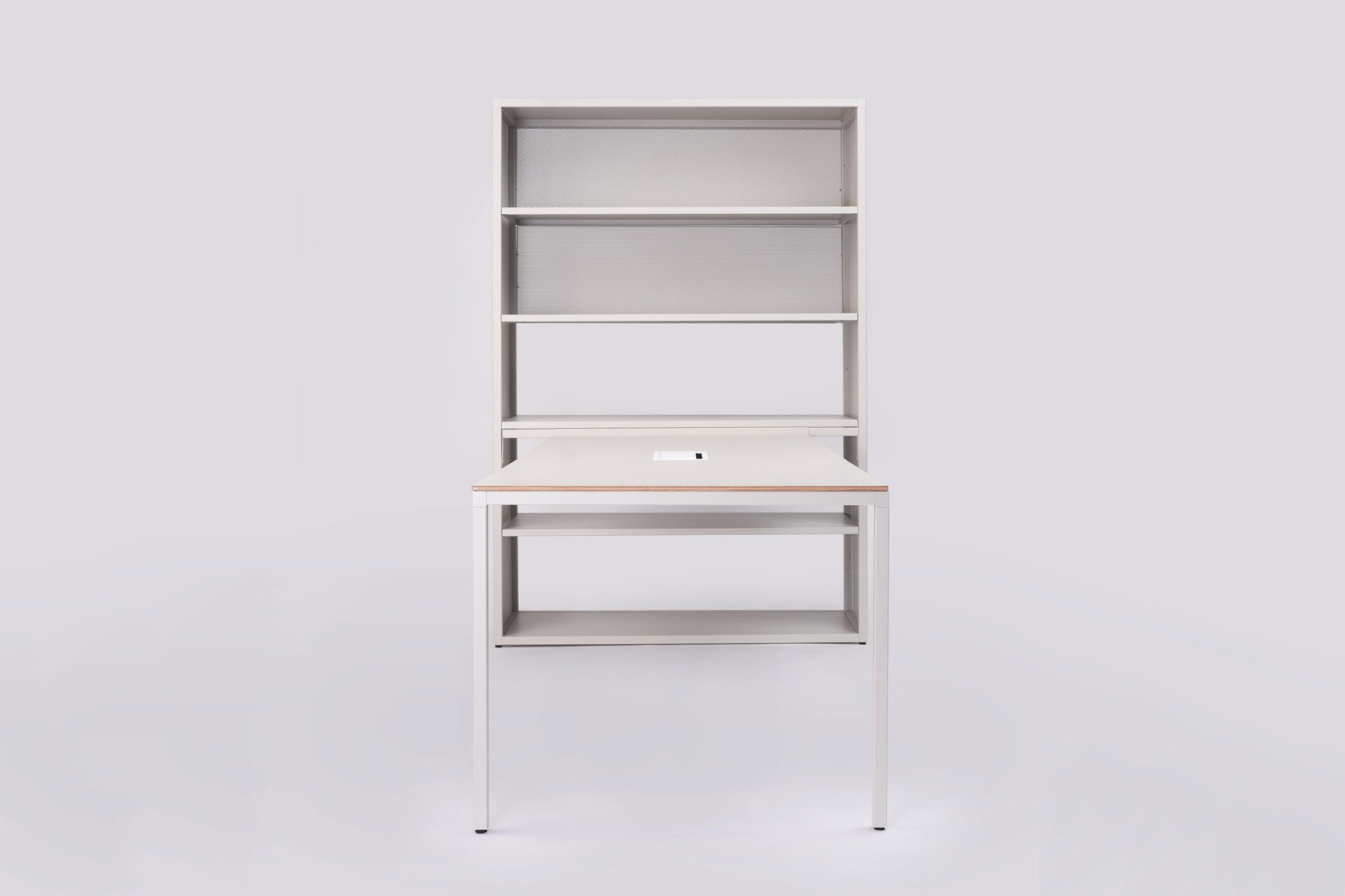 Struktur aus präzisionsgefertigten quadratischen Stahlrohren mit 30 mm Seitenlänge und 2 mm Dicke, aus recyceltem kaltgewalztem Stahl. Die Regale bestehen aus 1,5 mm dickem Stahlblech mit Epoxidbeschichtung.