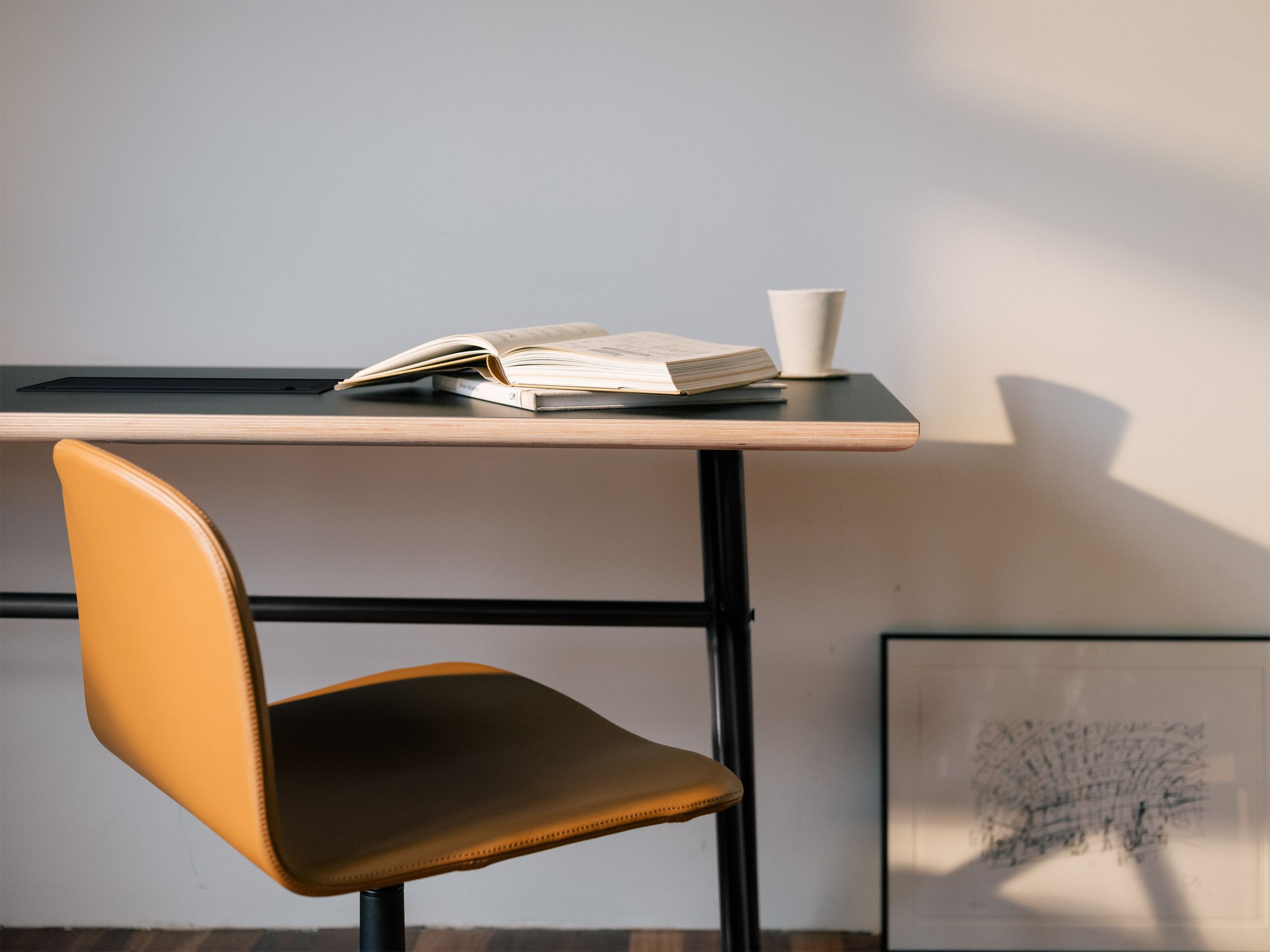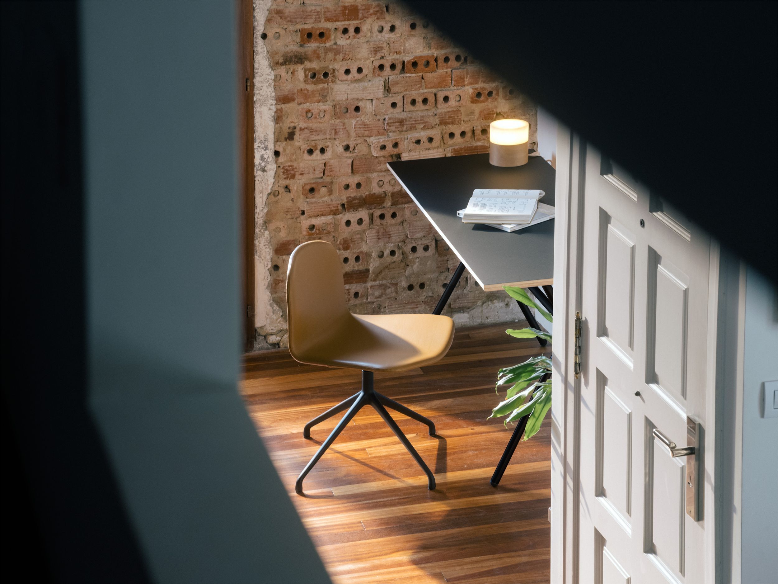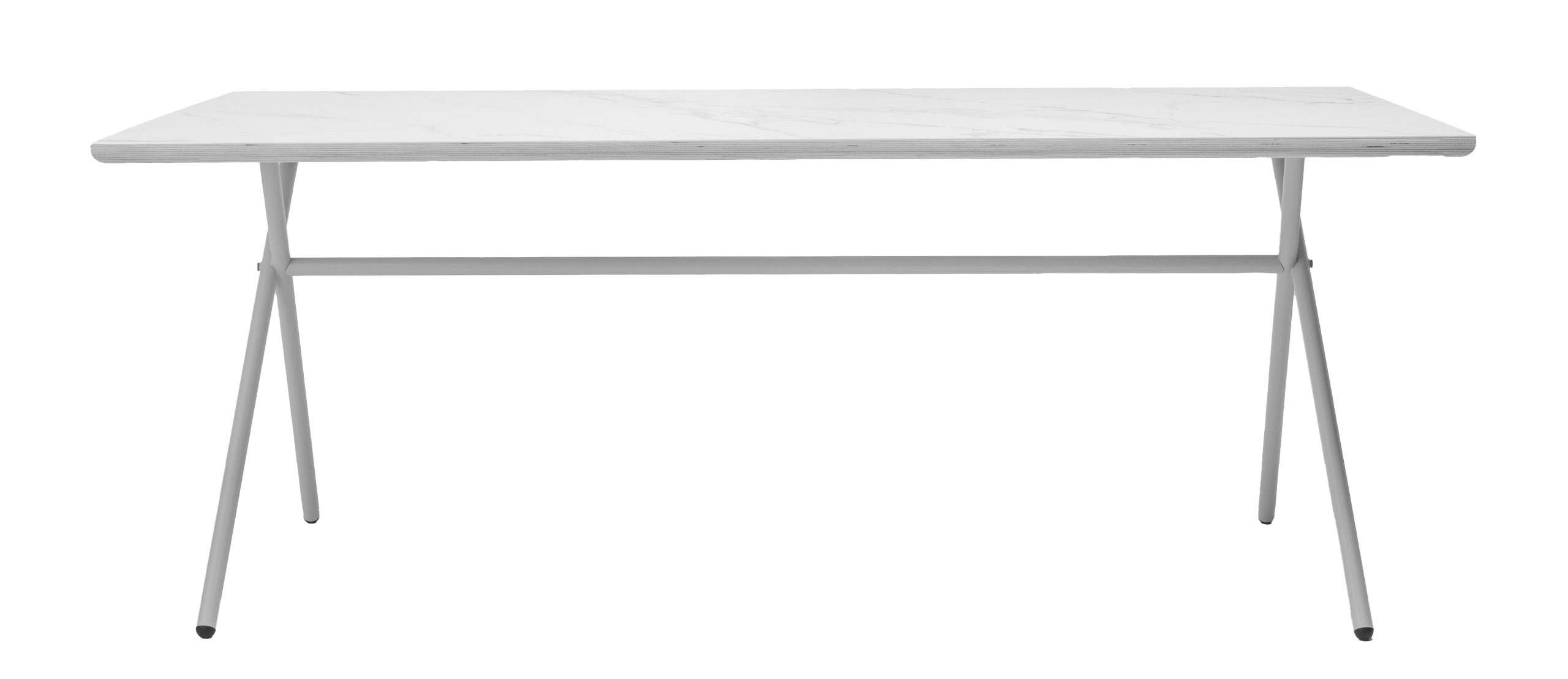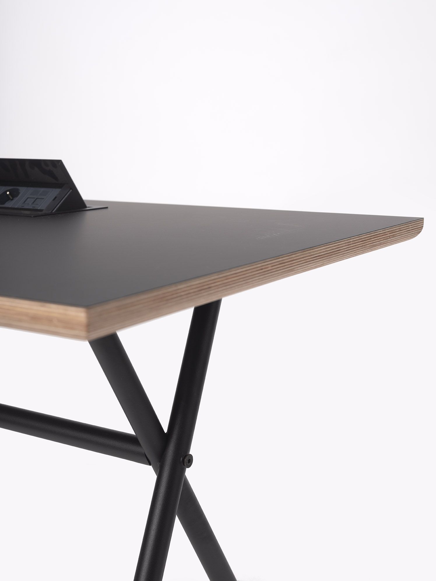 Beine aus präzisionszylindrischem Stahlrohr mit einem Durchmesser von 30 mm und einer Dicke von 2 mm, aus recyceltem kaltgewalztem Stahl. Optionen für die Tischplatte umfassen laminiertes Birkenholz und Arpa Fenix + Birkenholz. Für weitere Informationen konsultieren Sie das technische Datenblatt.