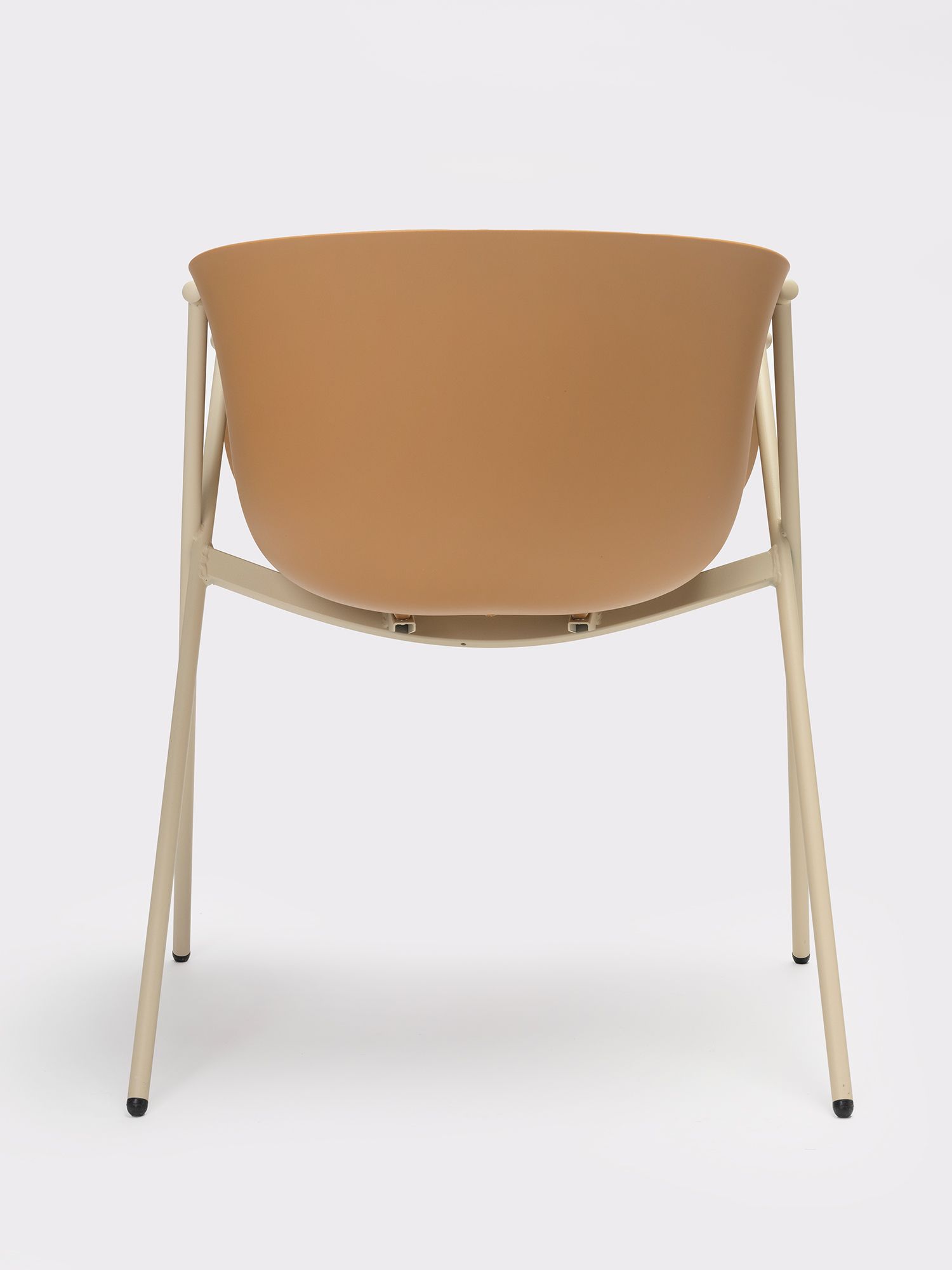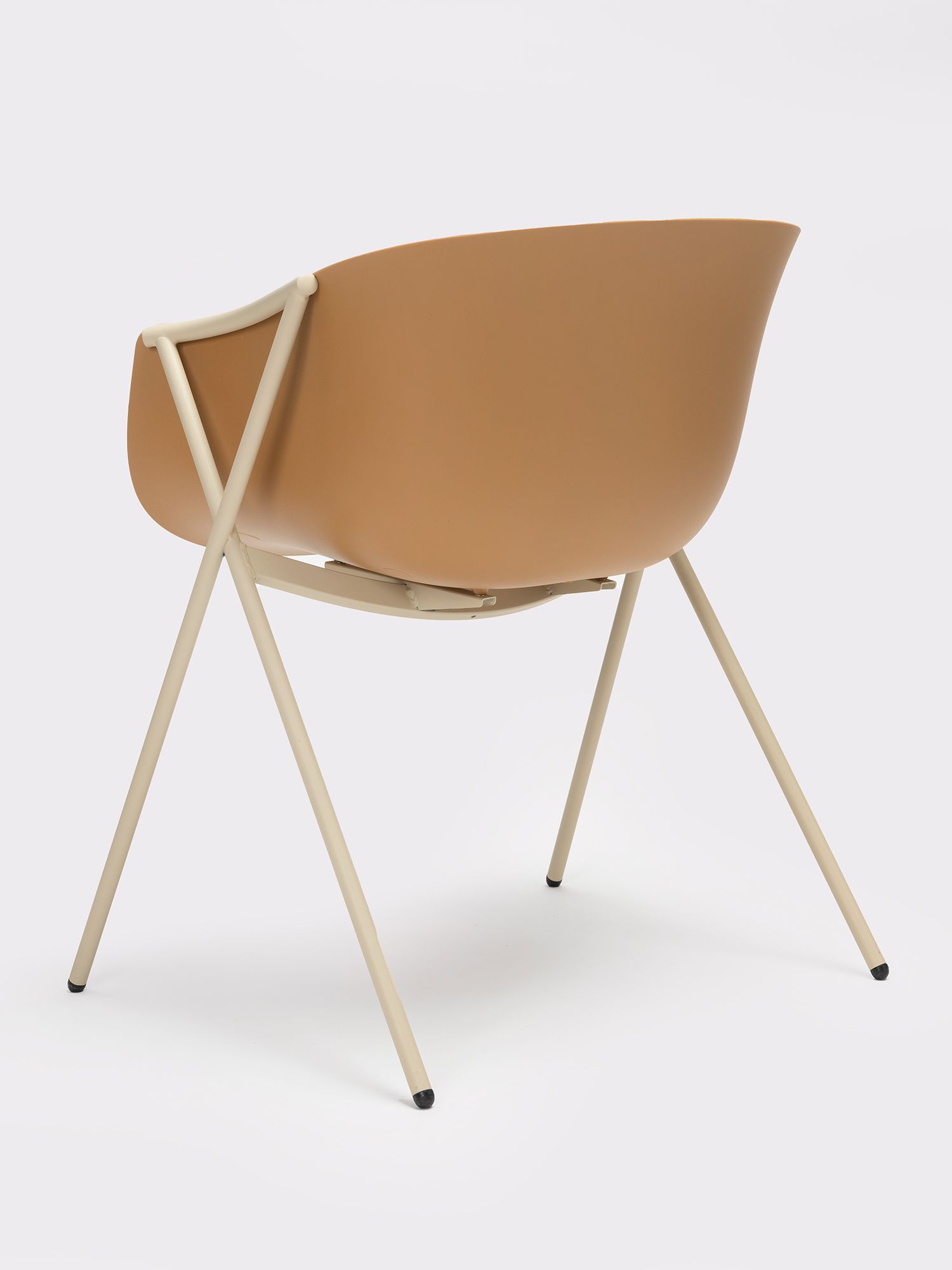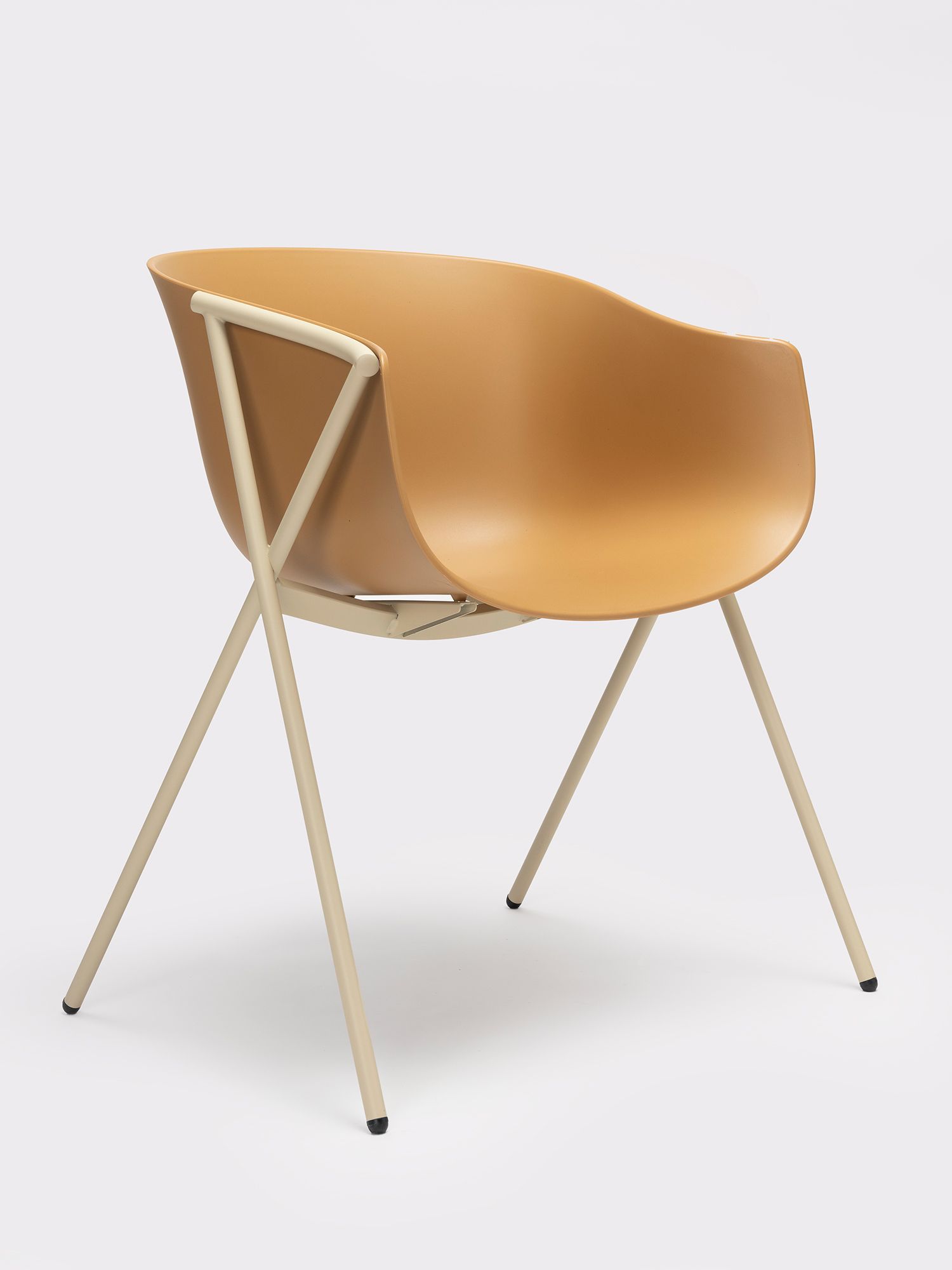 Ein multifunktionales Möbelstück in einer edlen, warmen Optik mit großzügigen Proportionen und umhüllenden Linien. Der Stuhl Bai weist eine Stahlstruktur mit gekreuzten Beinen auf, die eine in weichen und organischen Formen gehaltene Sitzschale aus Polypropylen oder mit Polsterung tragen.