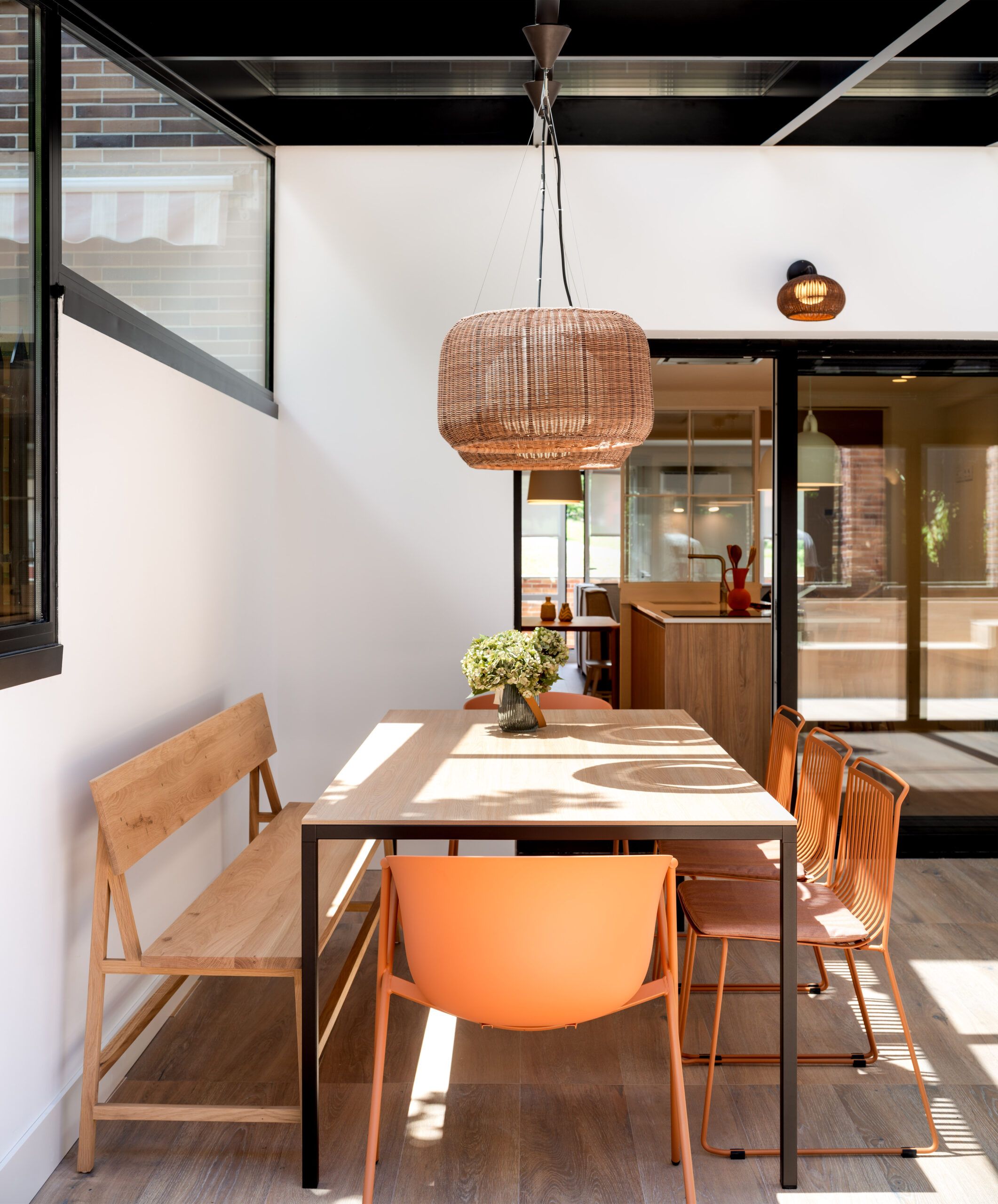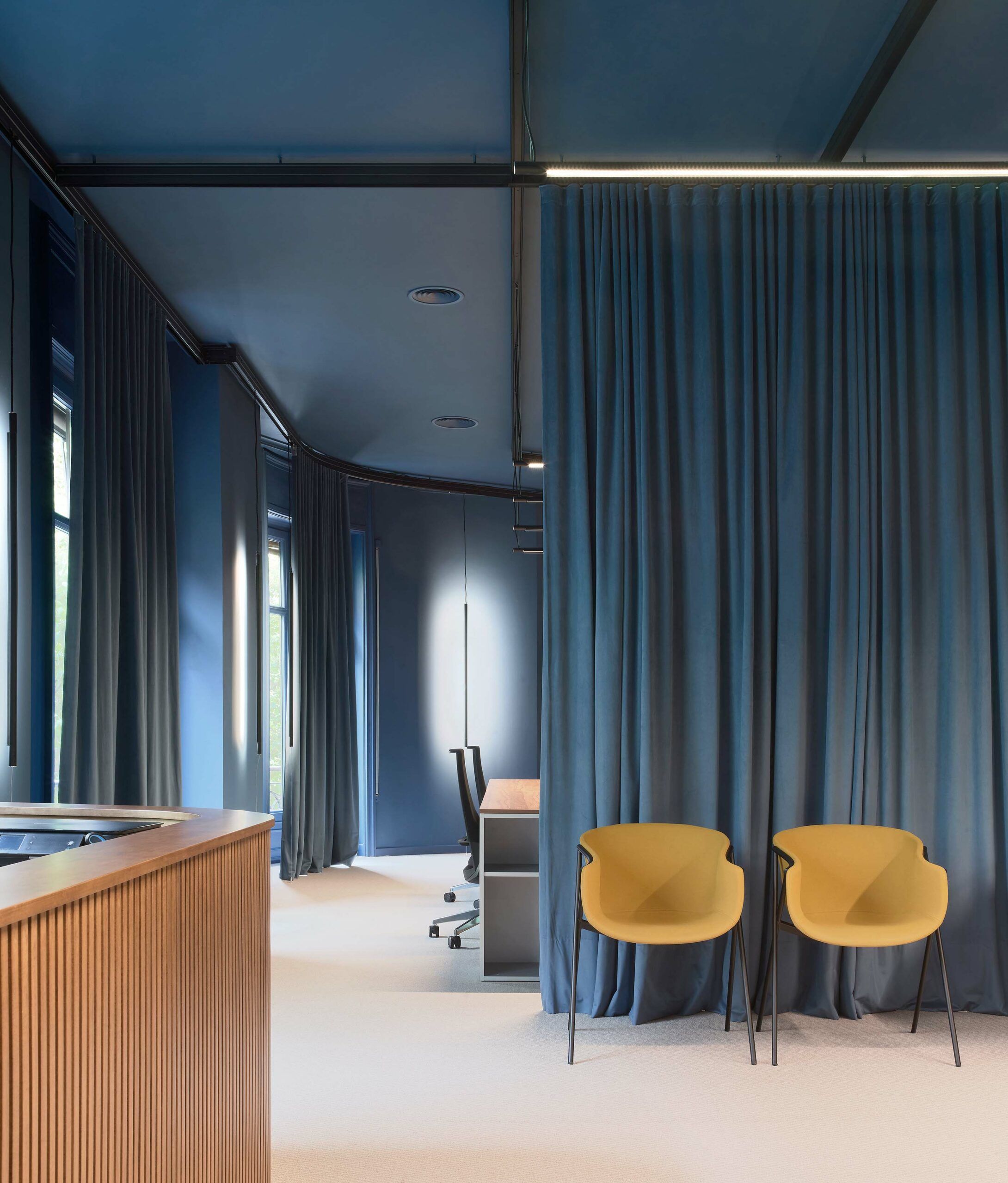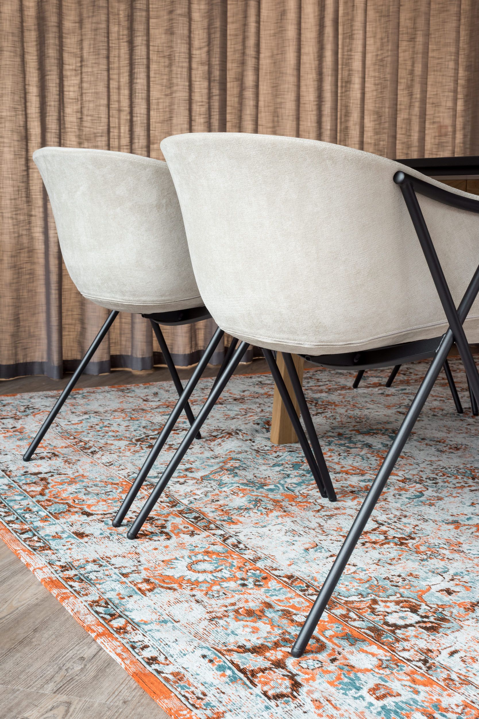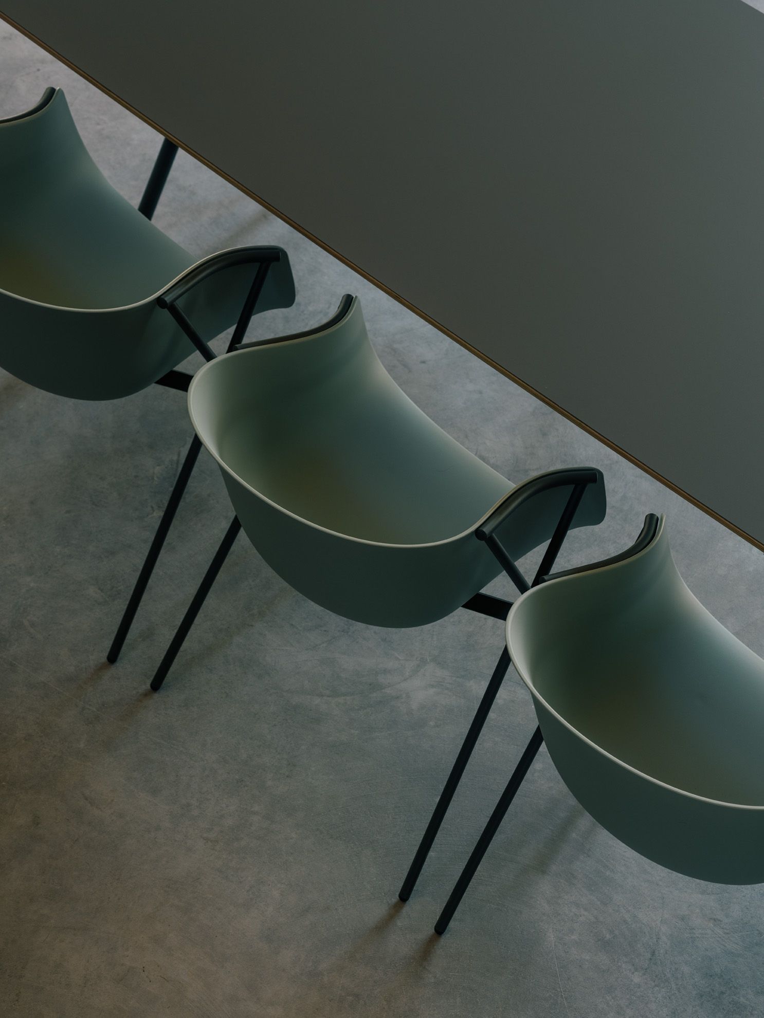 Ein multifunktionales Möbelstück in einer edlen, warmen Optik mit großzügigen Proportionen und umhüllenden Linien. Der Stuhl Bai weist eine Stahlstruktur mit gekreuzten Beinen auf, die eine in weichen und organischen Formen gehaltene Sitzschale aus Polypropylen oder mit Polsterung tragen.