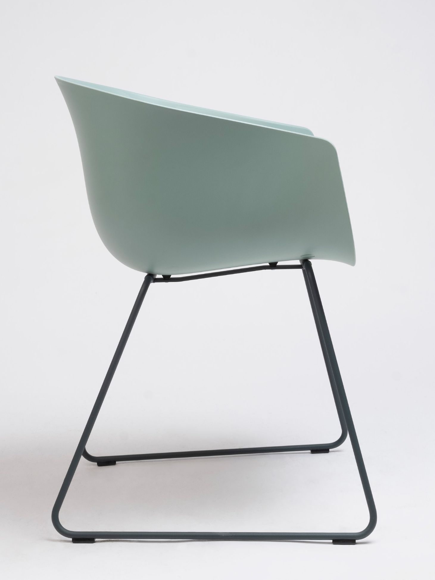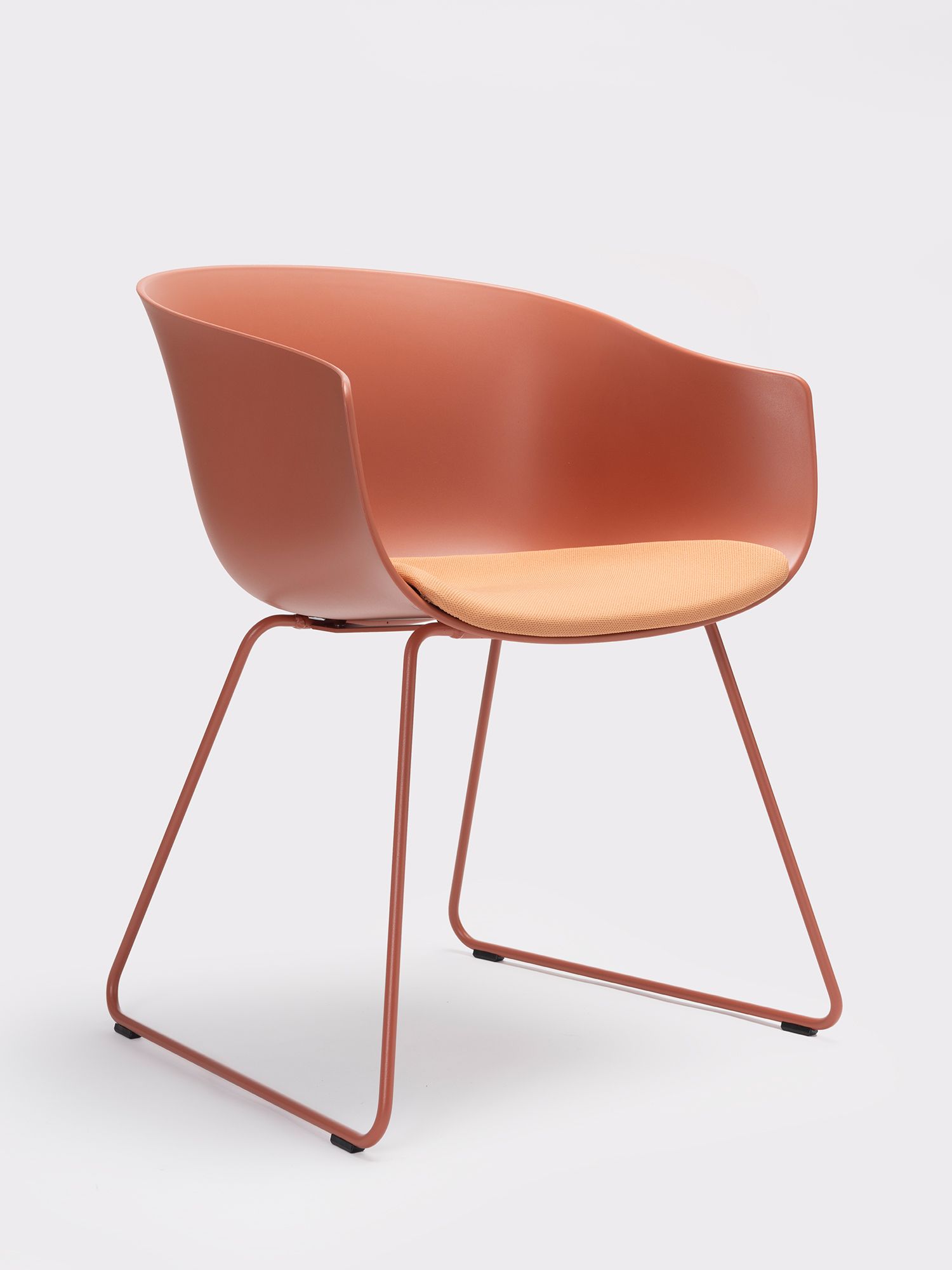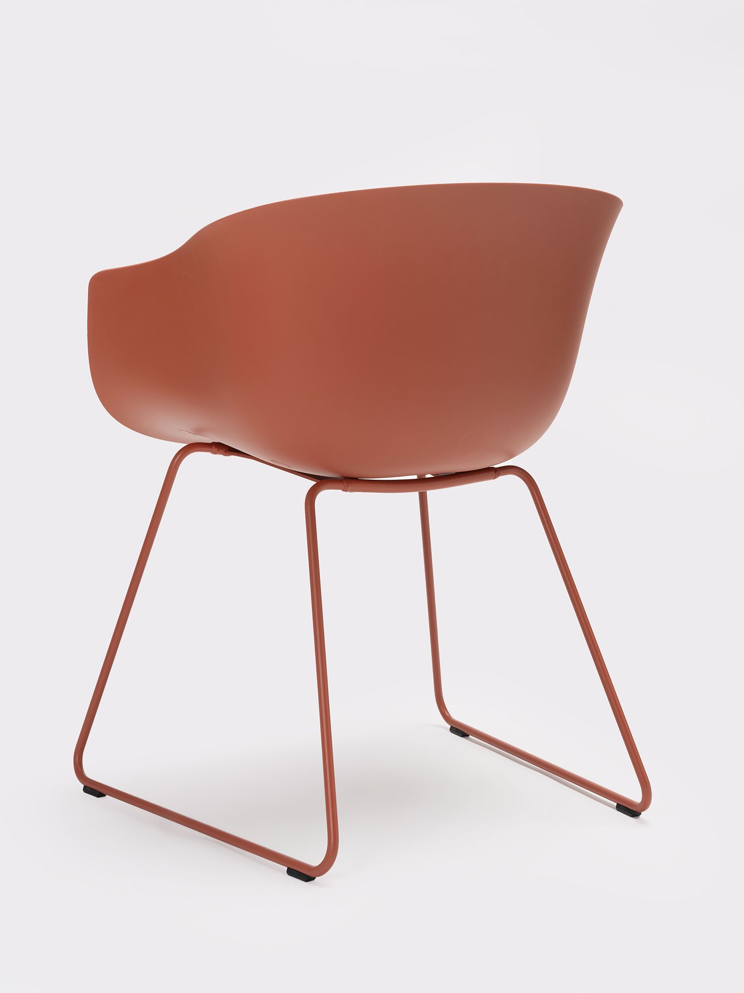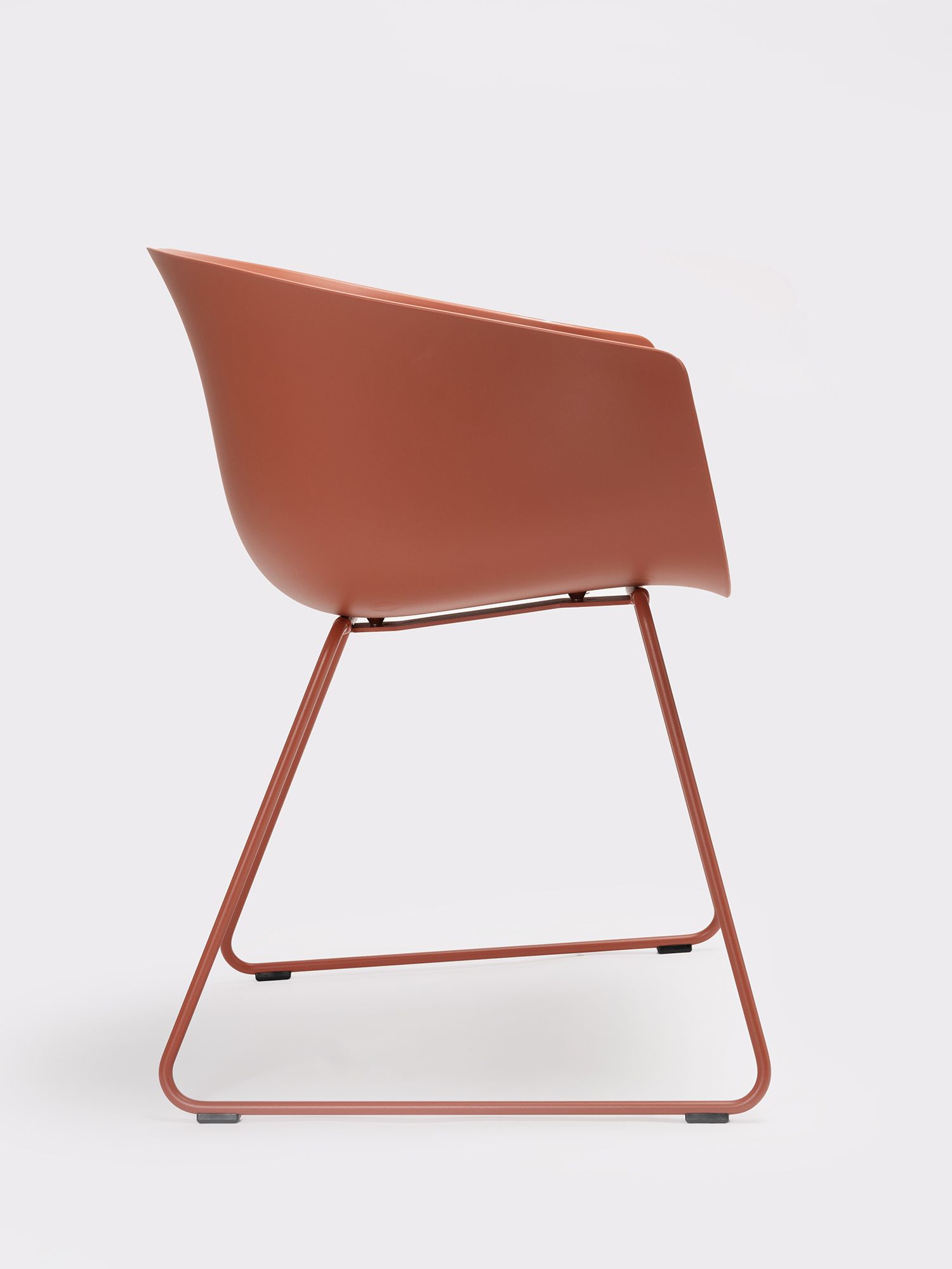 Generous proportions and wraparound lines, a versatile piece that has a noble and welcoming appearance. The Bai sled chair, with its steel structure that holds up the seat with its soft and organic curves in polypropylene or upholstered.