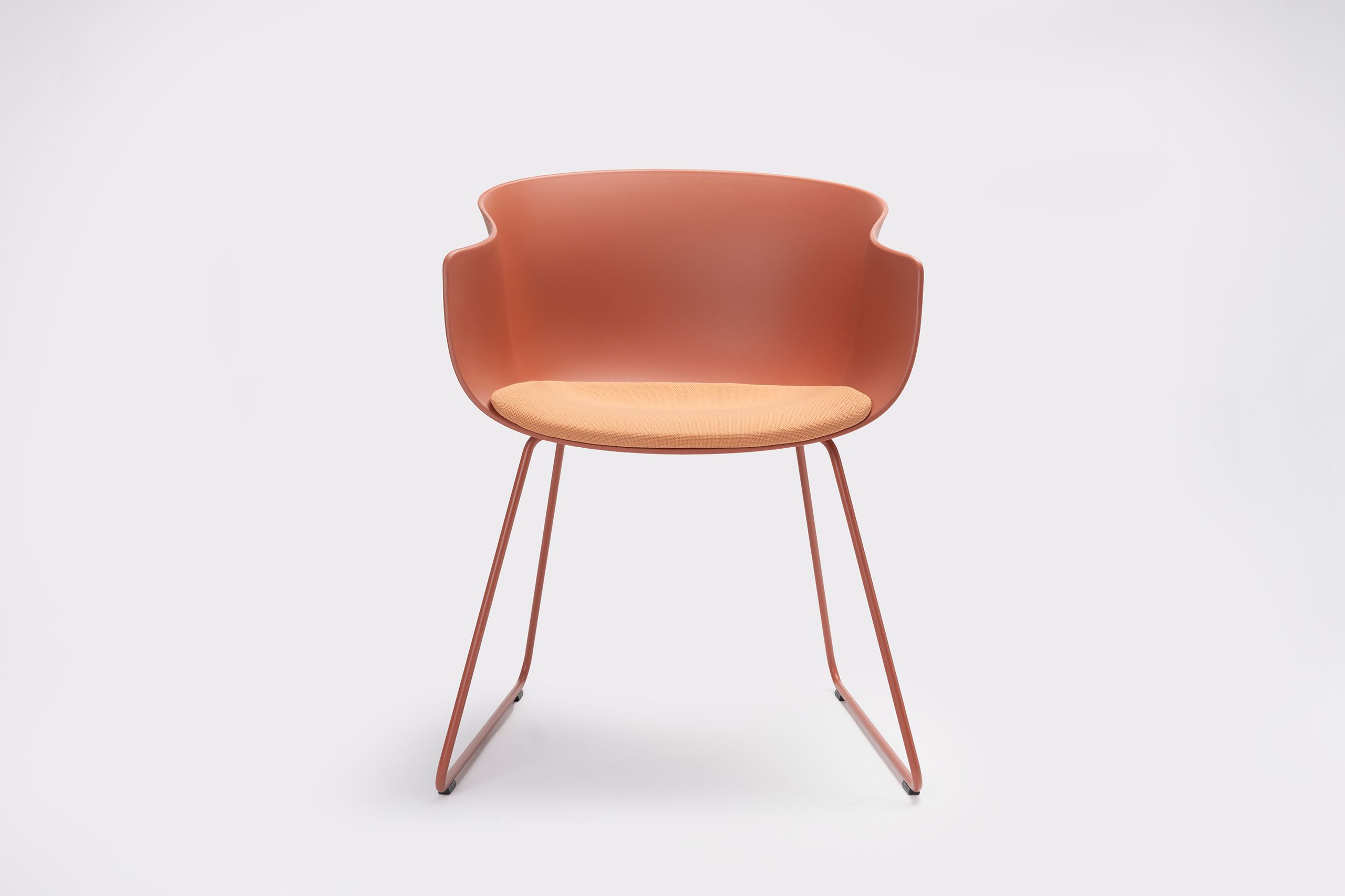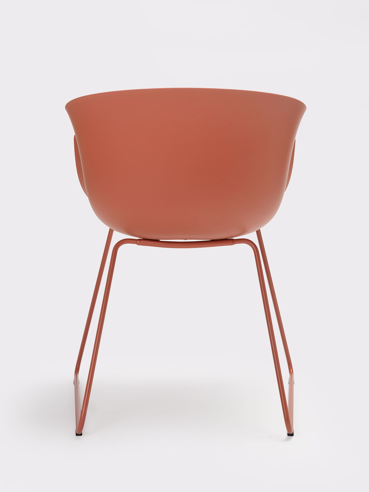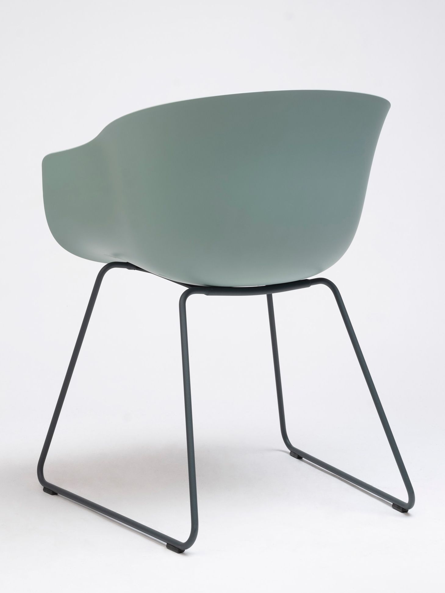 Generous proportions and wraparound lines, a versatile piece that has a noble and welcoming appearance. The Bai sled chair, with its steel structure that holds up the seat with its soft and organic curves in polypropylene or upholstered.