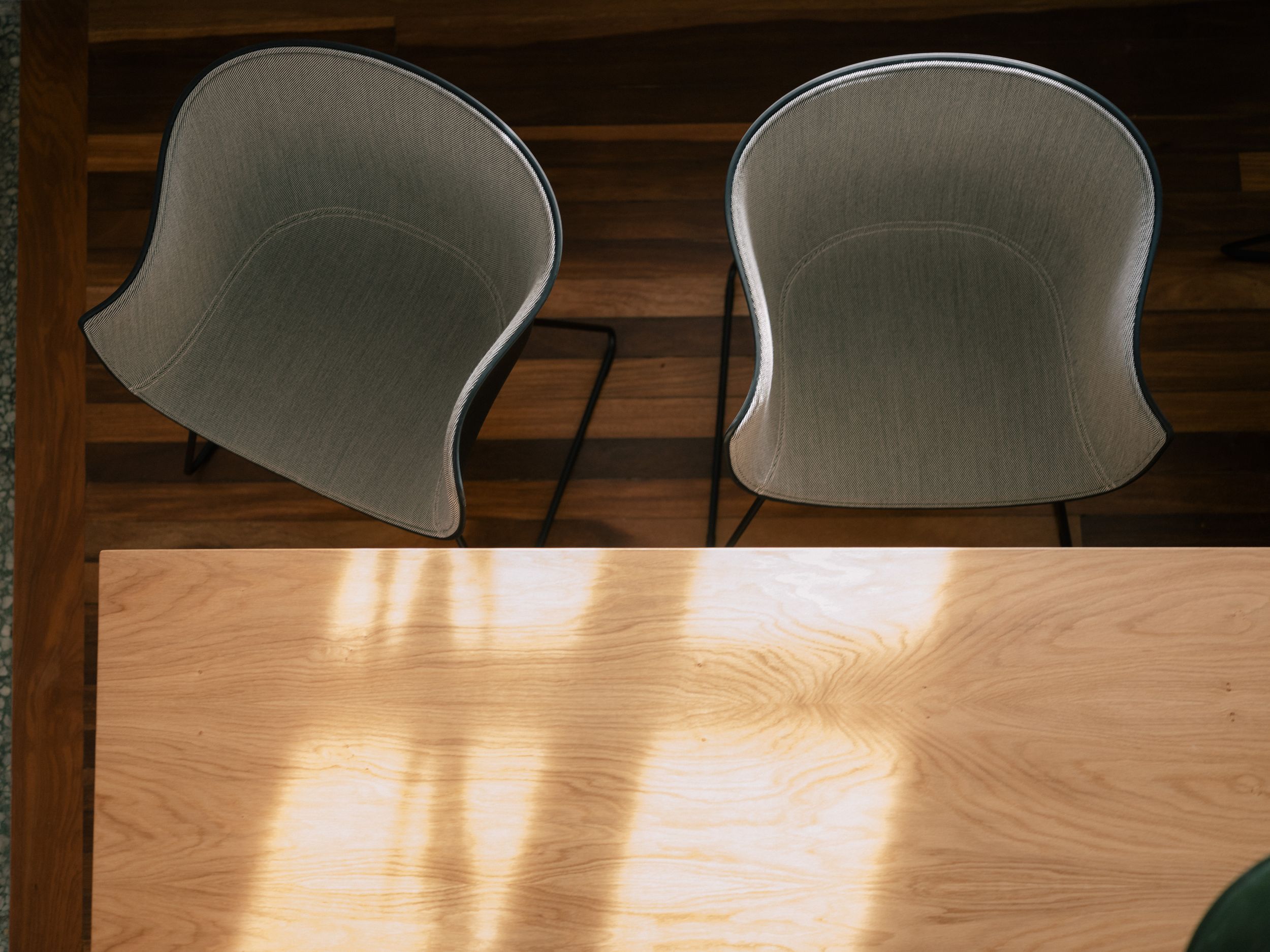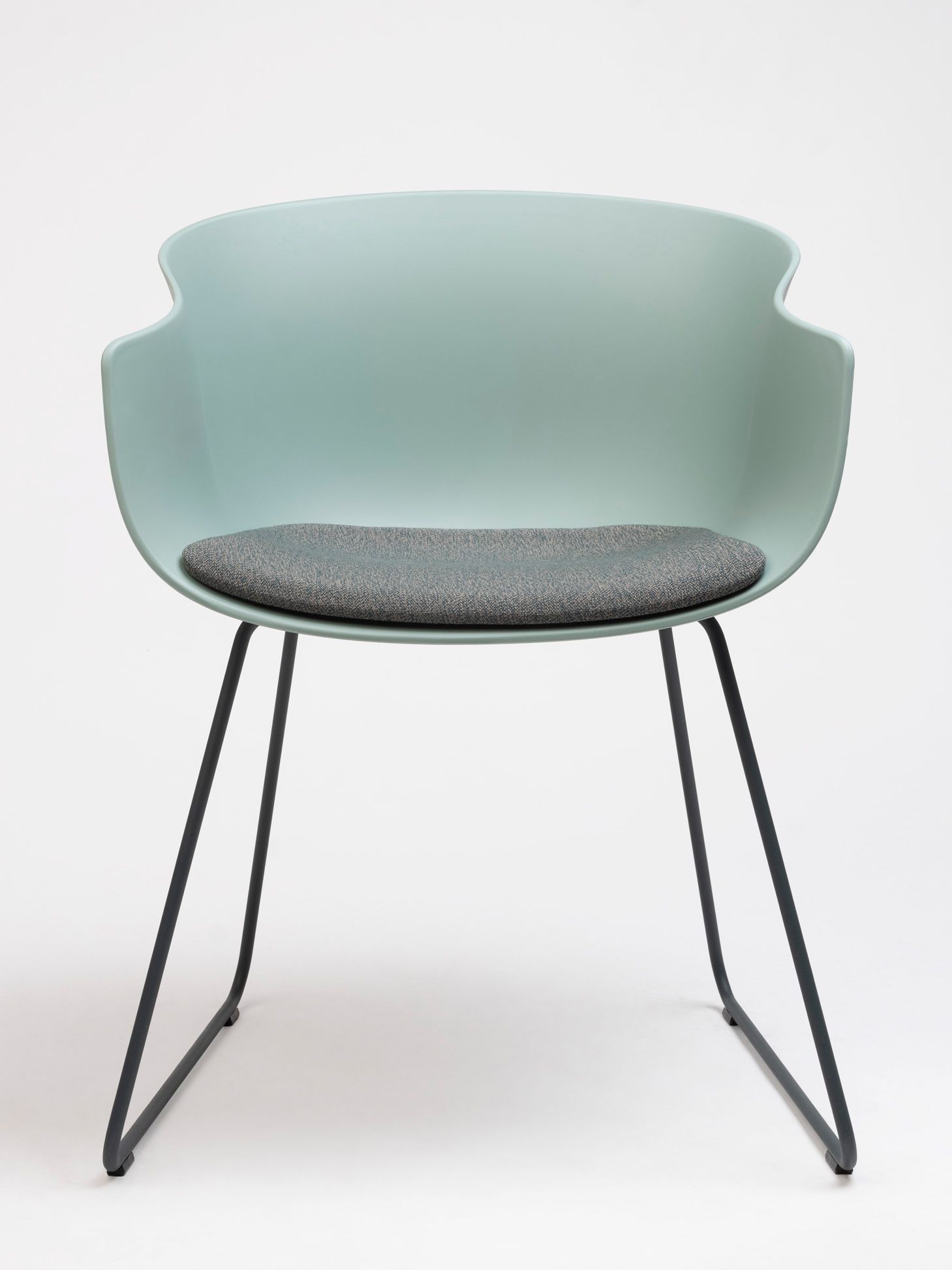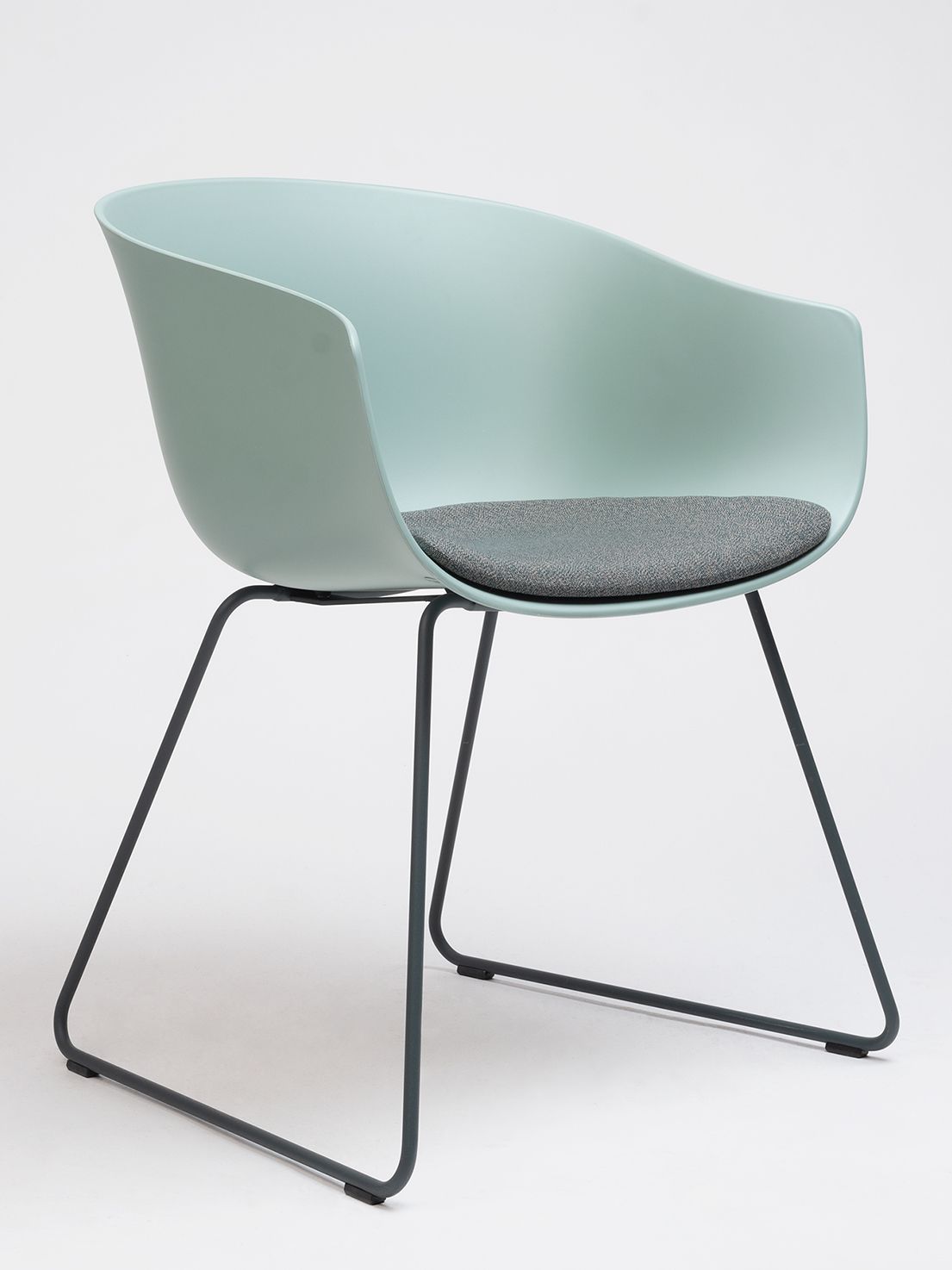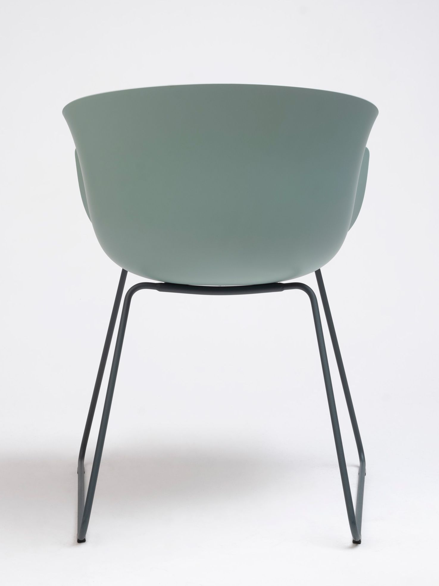 Generous proportions and wraparound lines, a versatile piece that has a noble and welcoming appearance. The Bai sled chair, with its steel structure that holds up the seat with its soft and organic curves in polypropylene or upholstered.