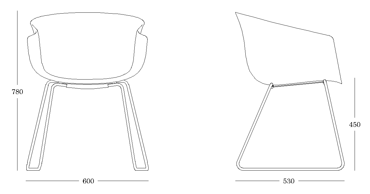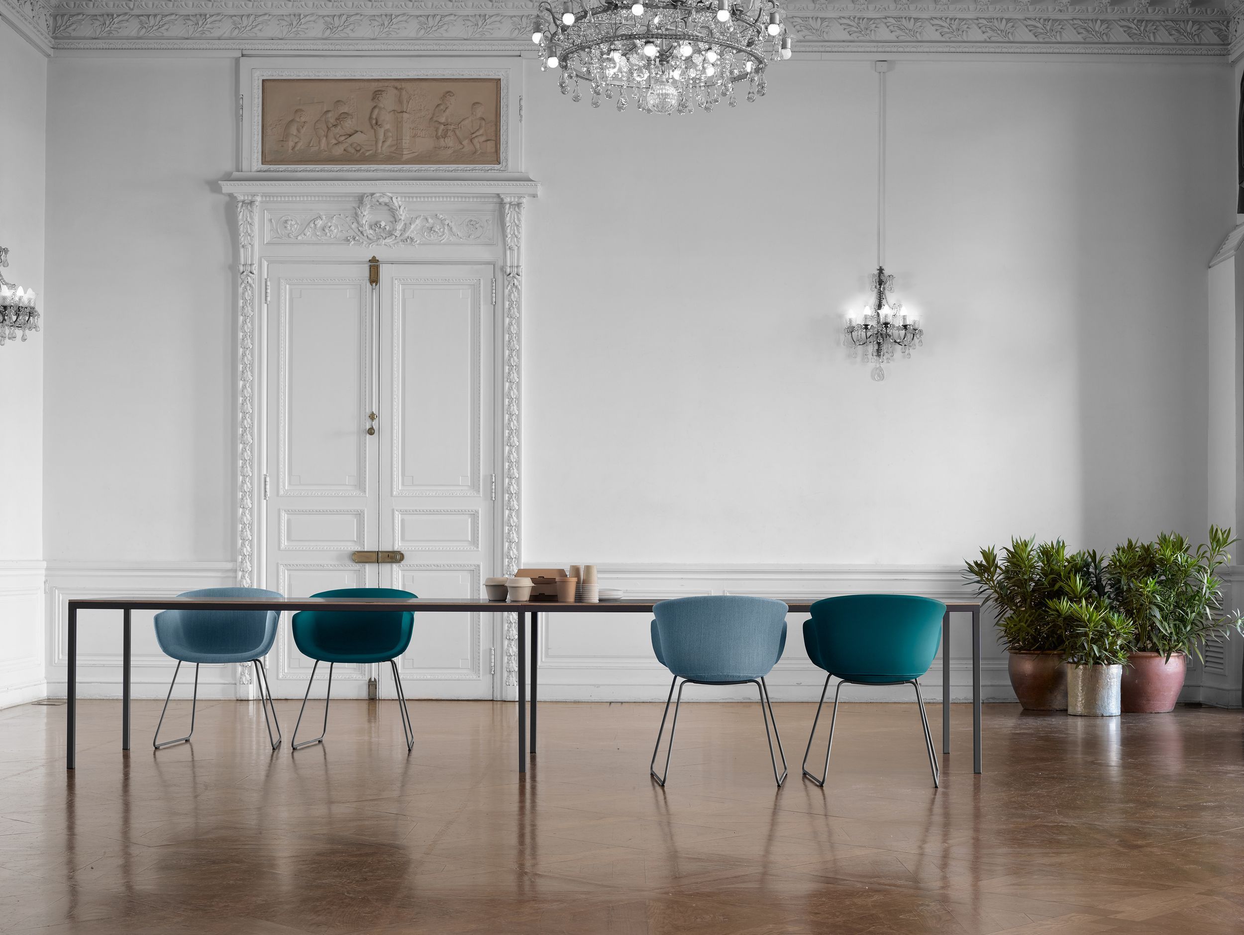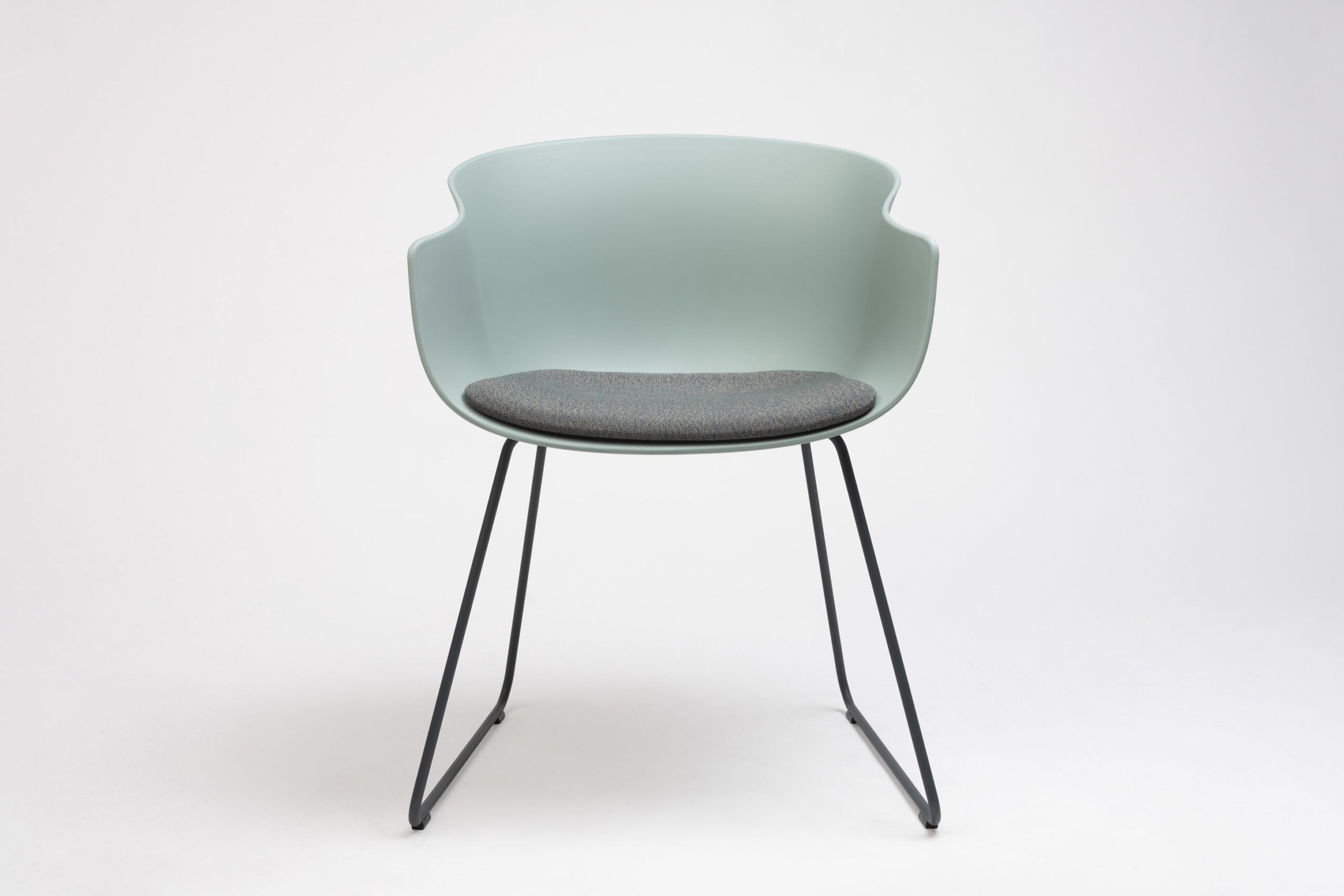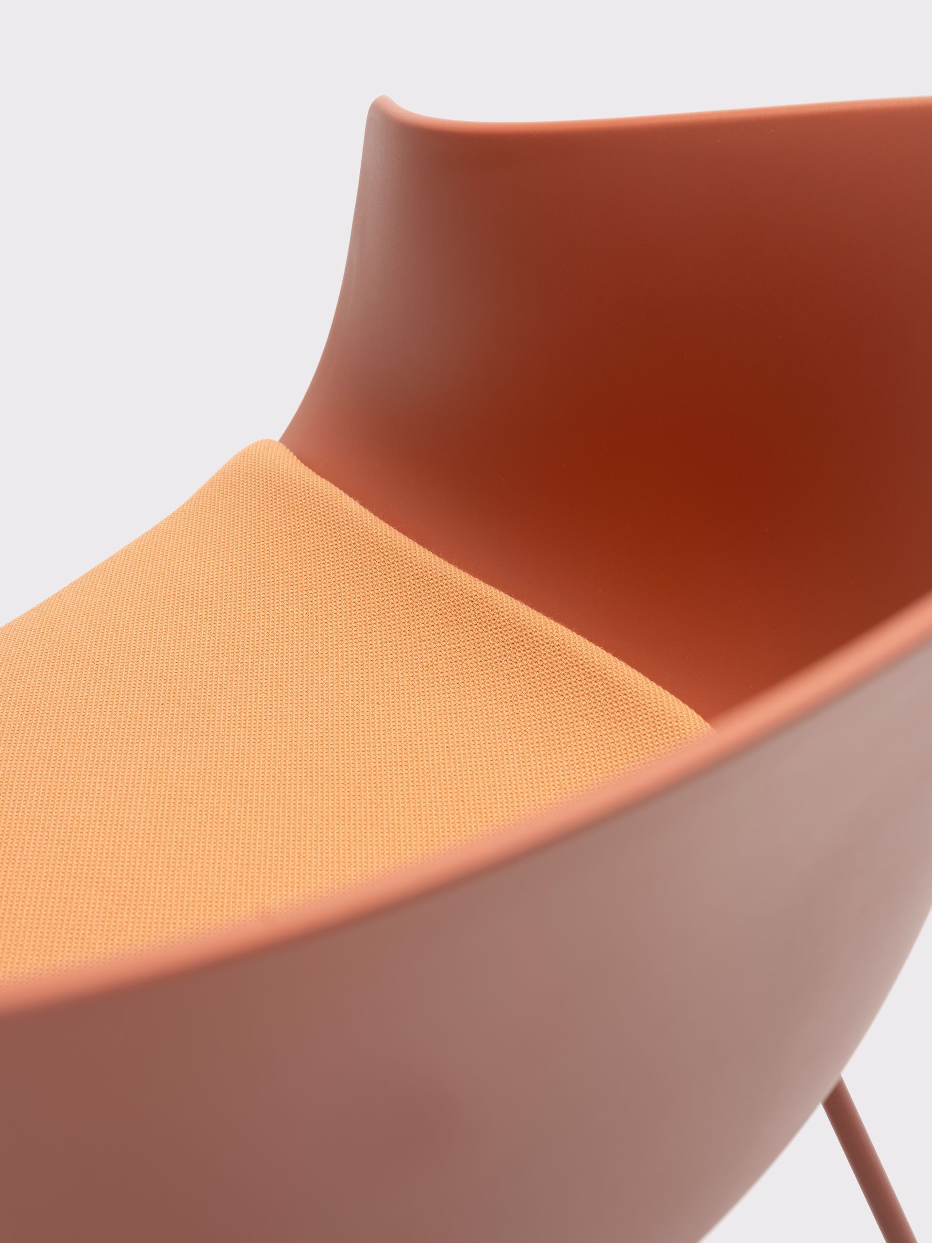 Structure made of solid cylindrical rod, 12 mm in diameter, in recycled steel. Finish options for the shell include matte textured polypropylene, upholstered seat, and fully upholstered options. For more information, consult the technical sheet.