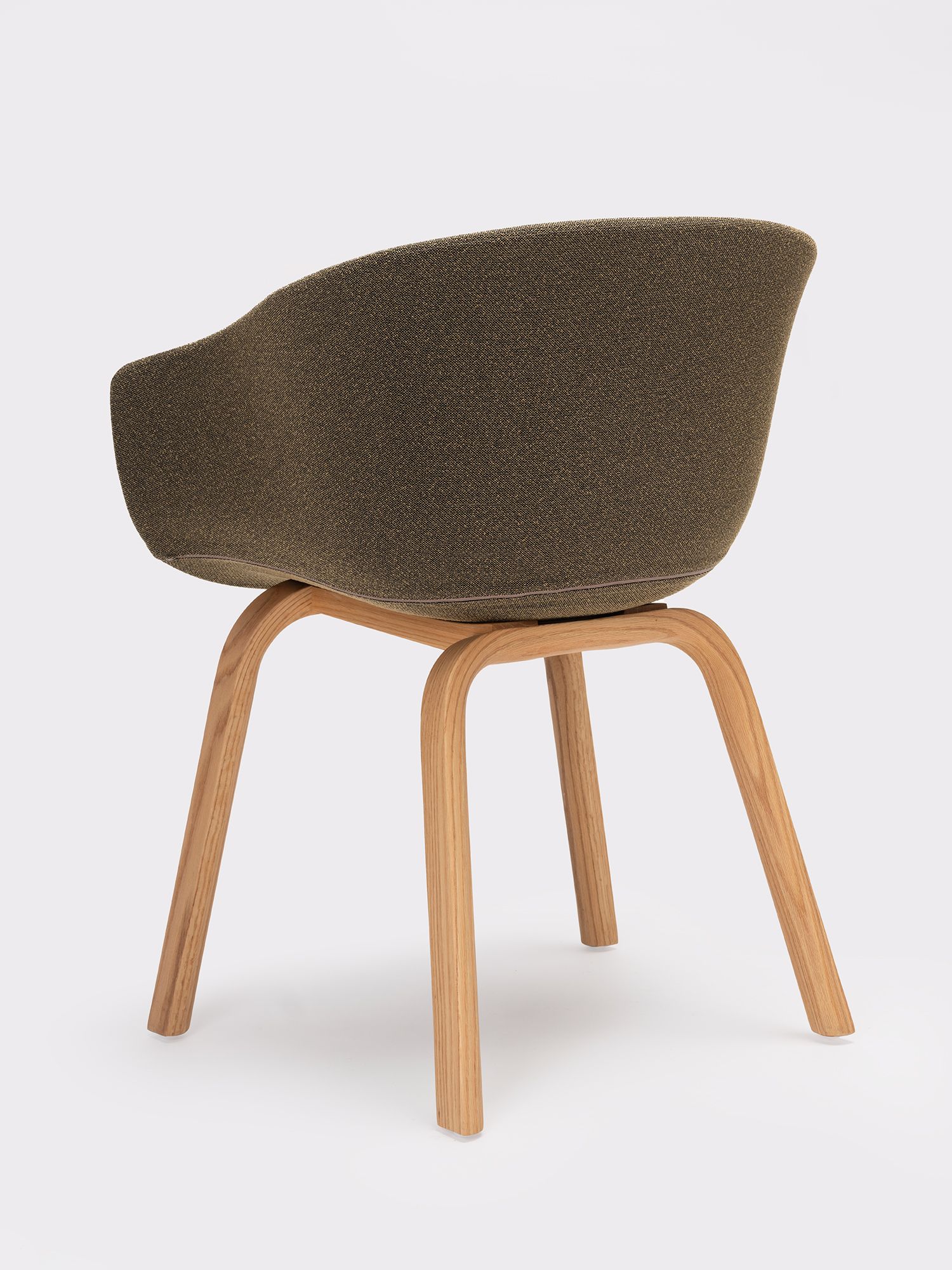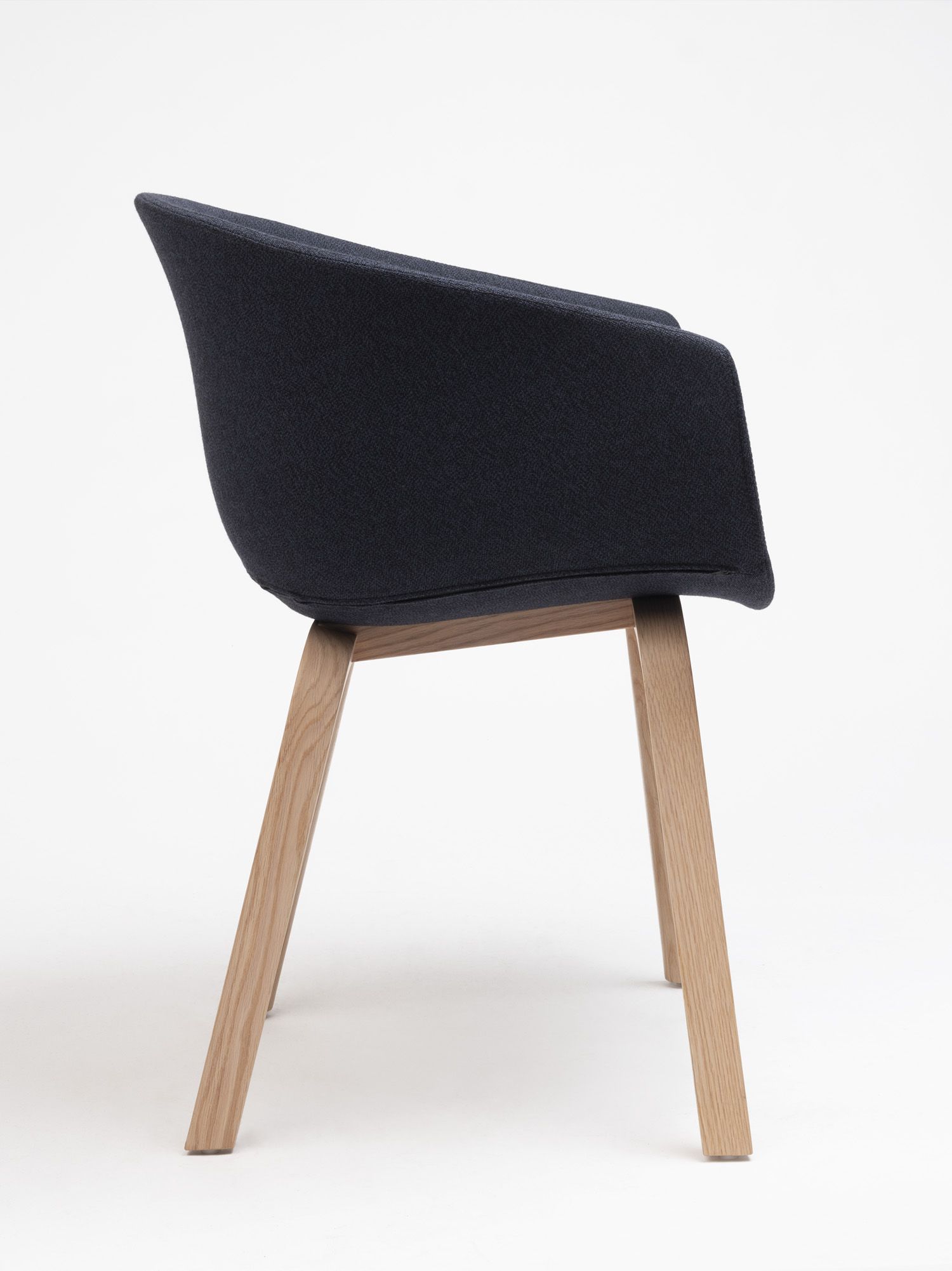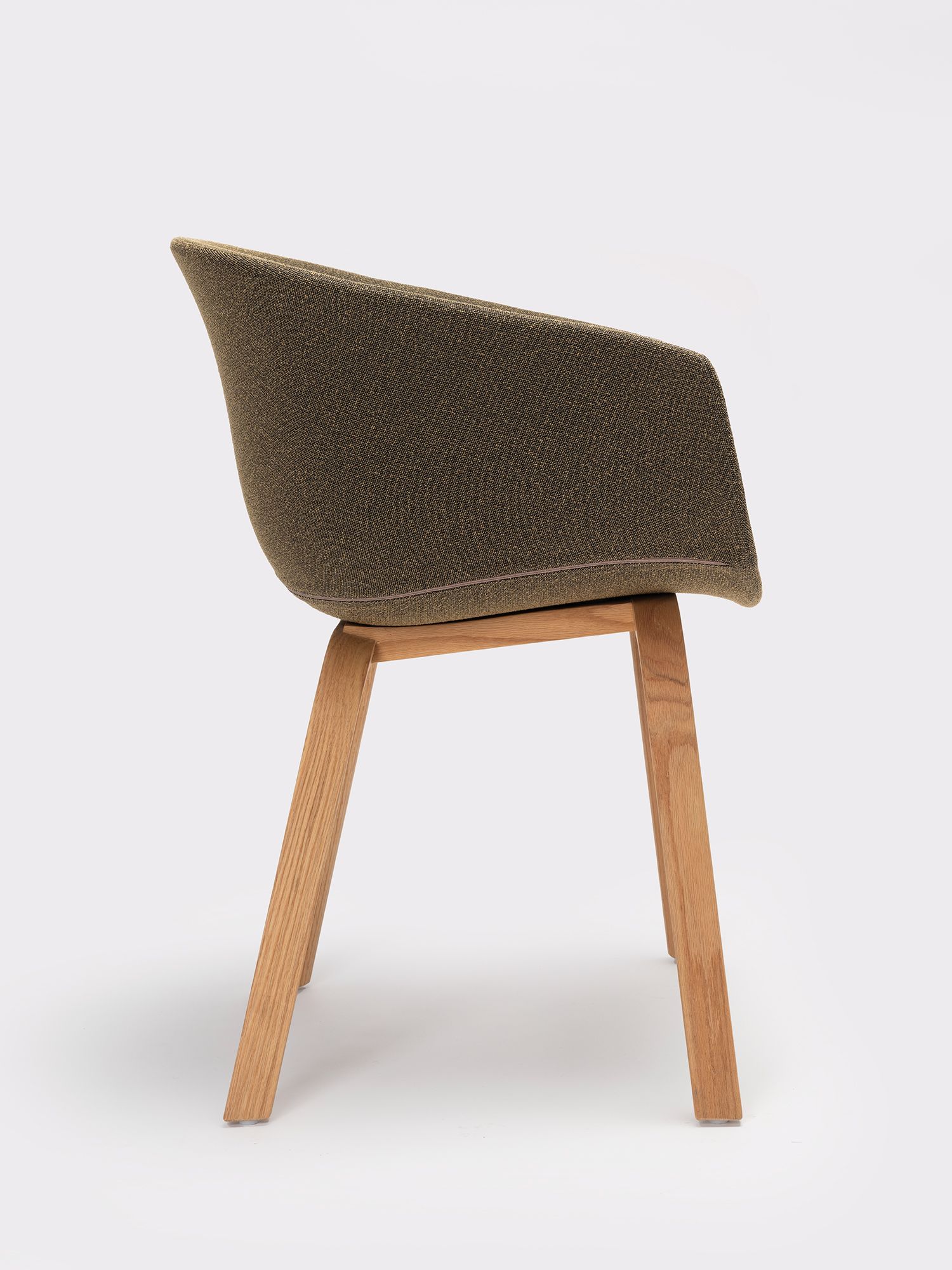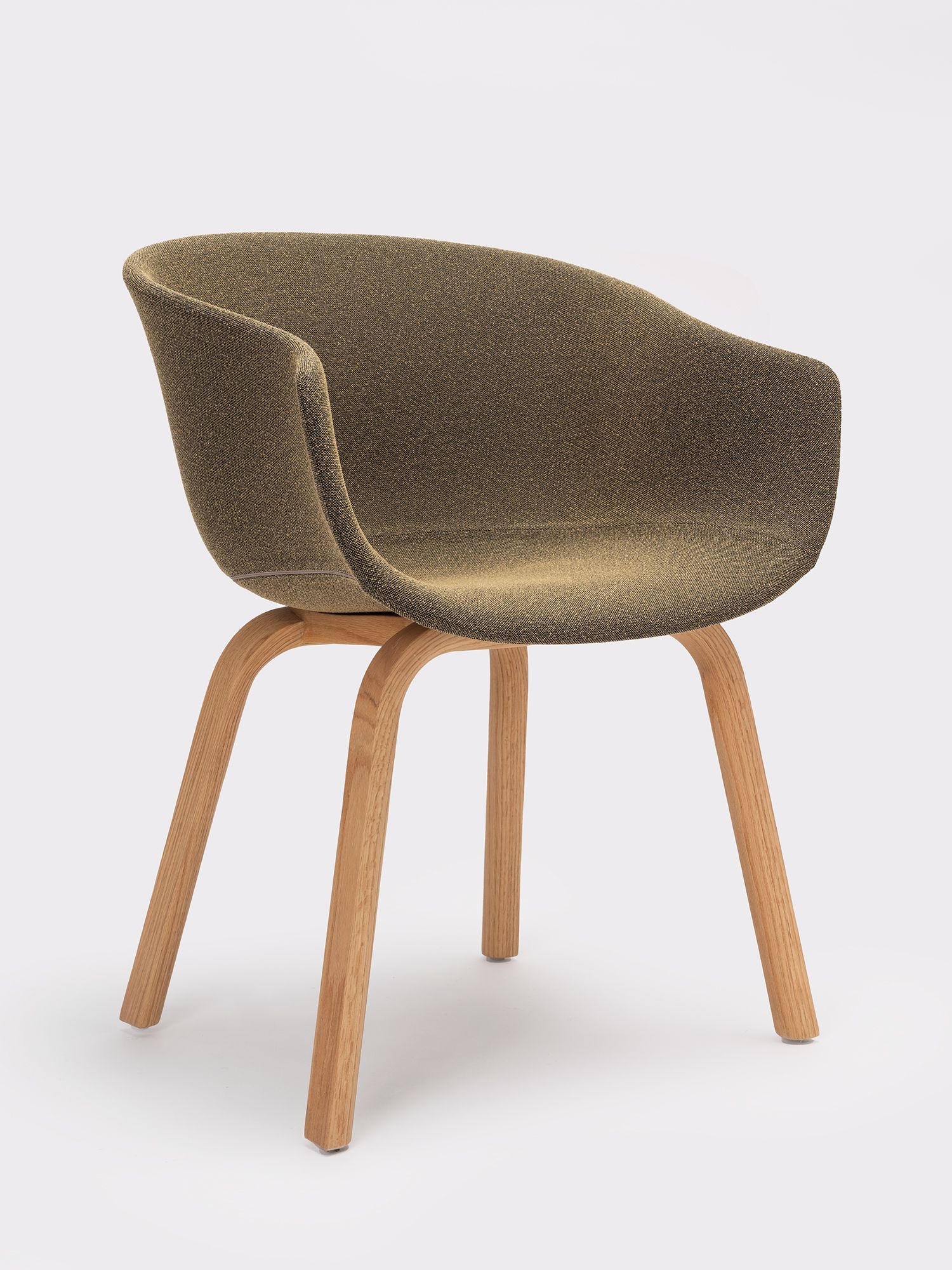 Structure in solid beech or oak wood, machined and curved through a specialized steaming and pressing process. Finish options for the shell include matte textured polypropylene, upholstered seat, or fully upholstered options. For more information, consult the technical sheet.