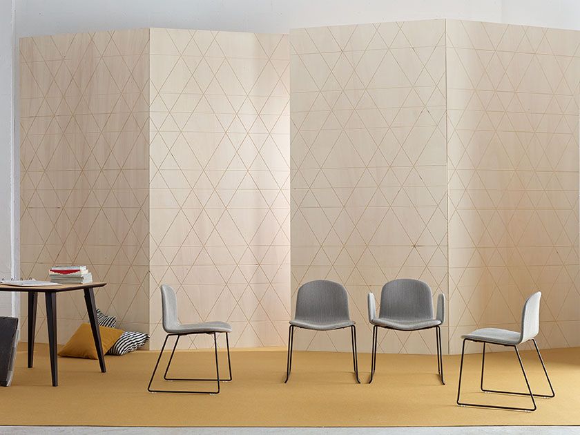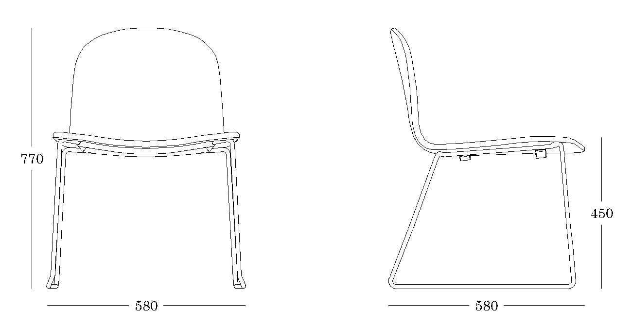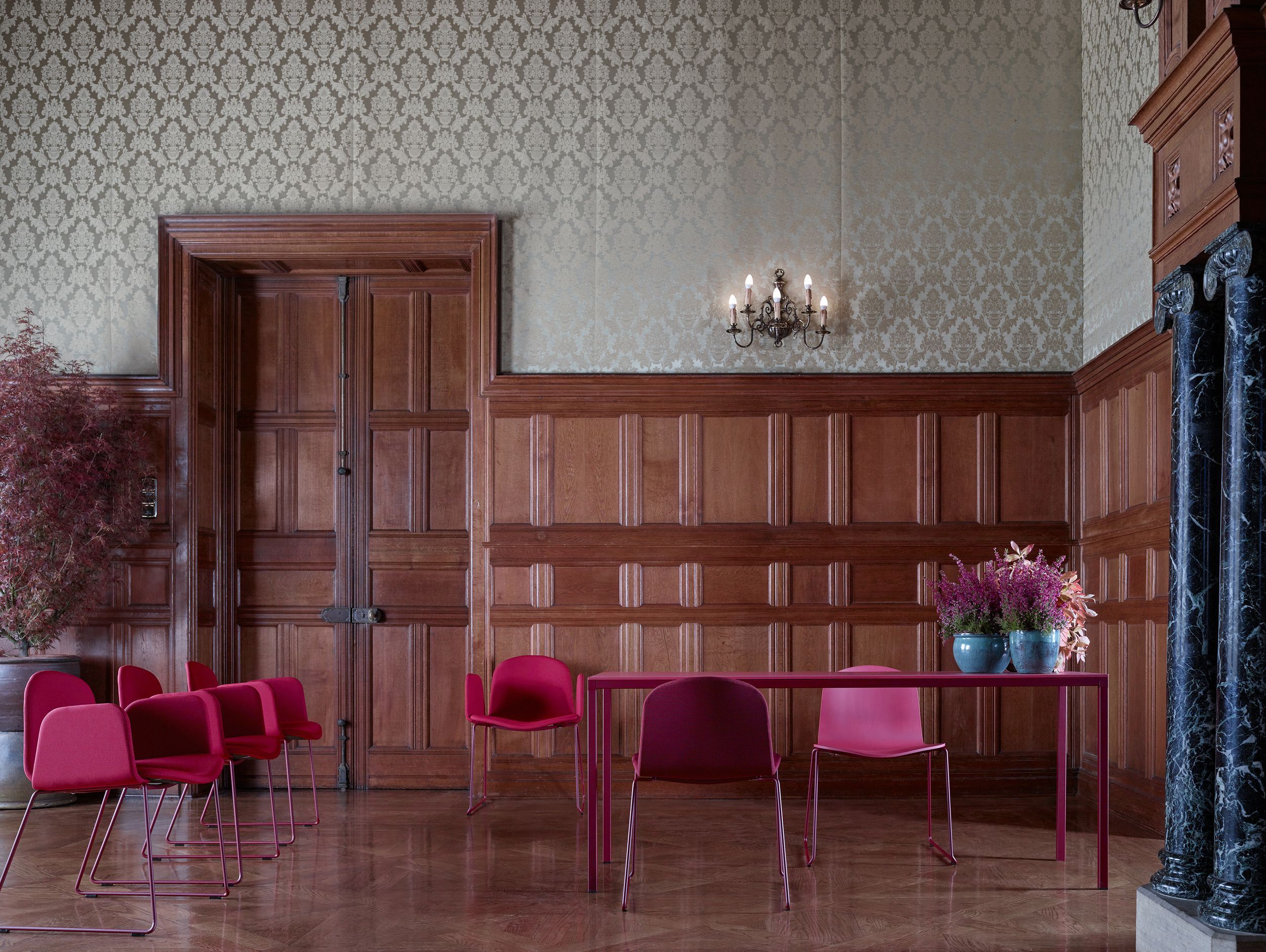 Structure made of solid cylindrical rod, 12 mm in diameter, in recycled steel. Finish options for the seat include beech and fully upholstered options. For more information, consult the technical sheet.