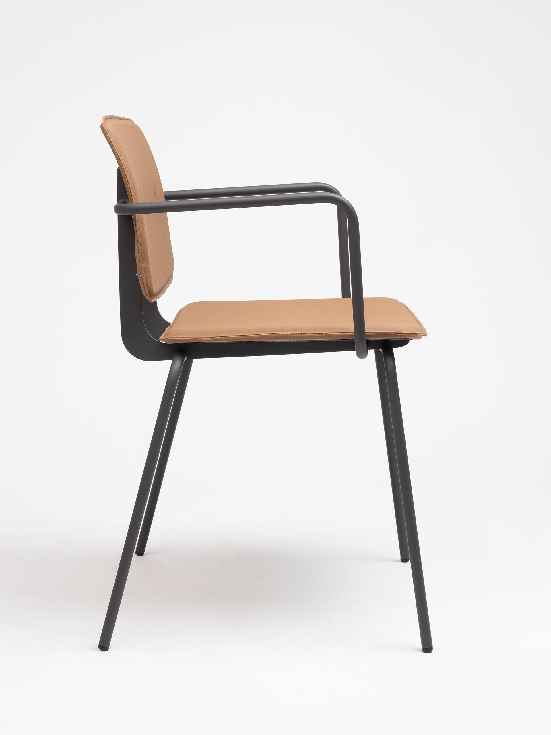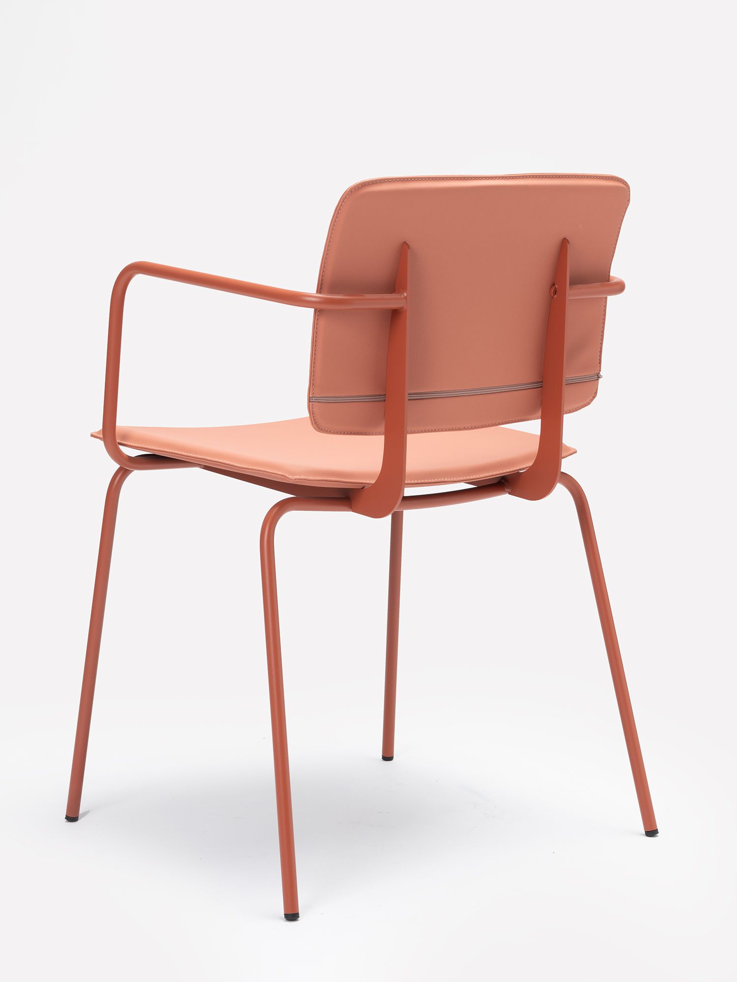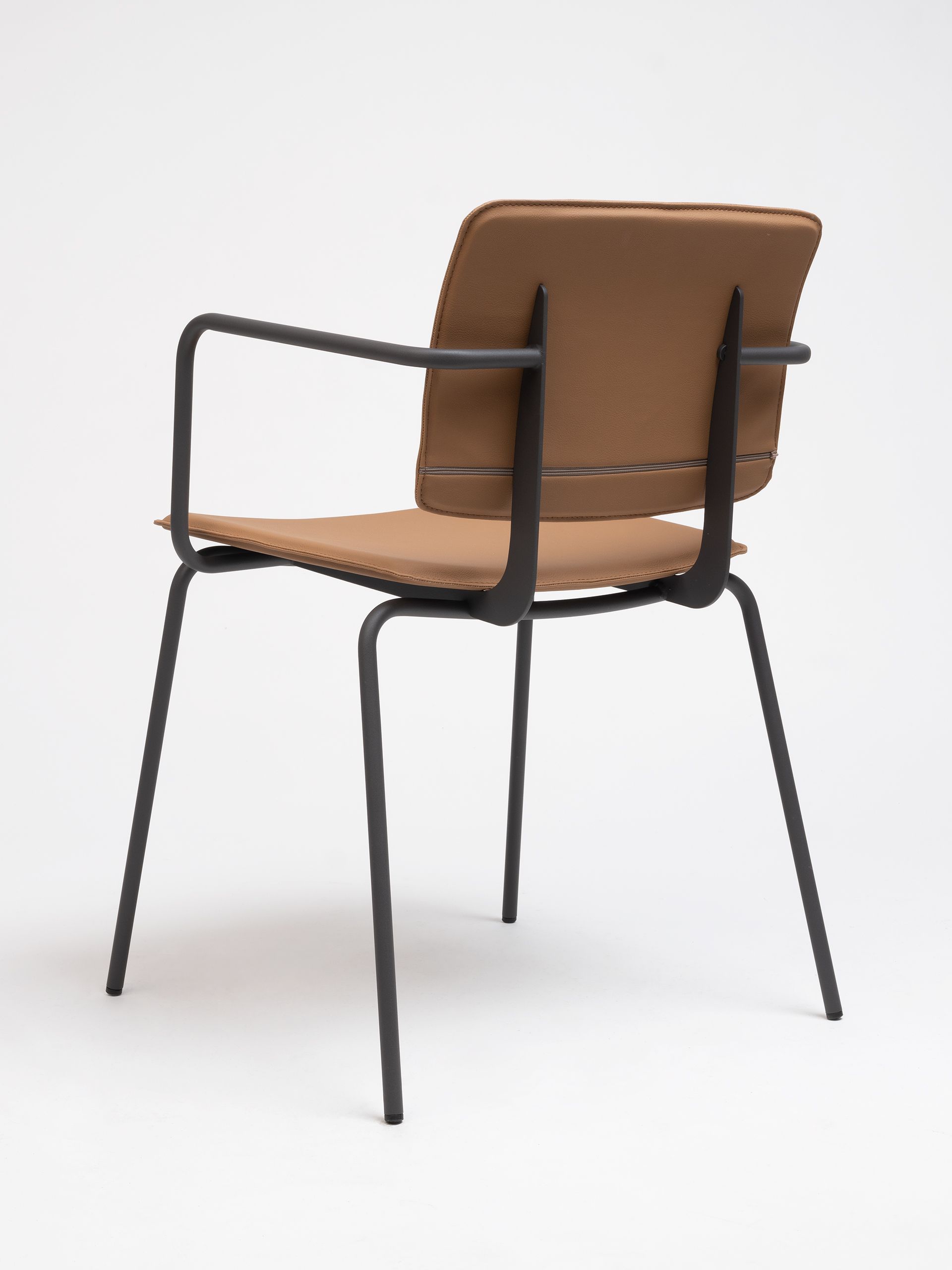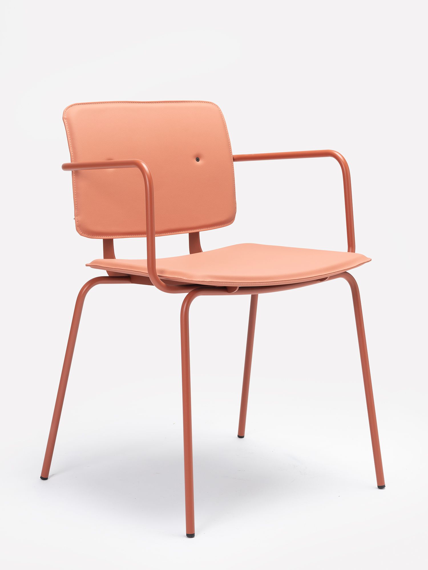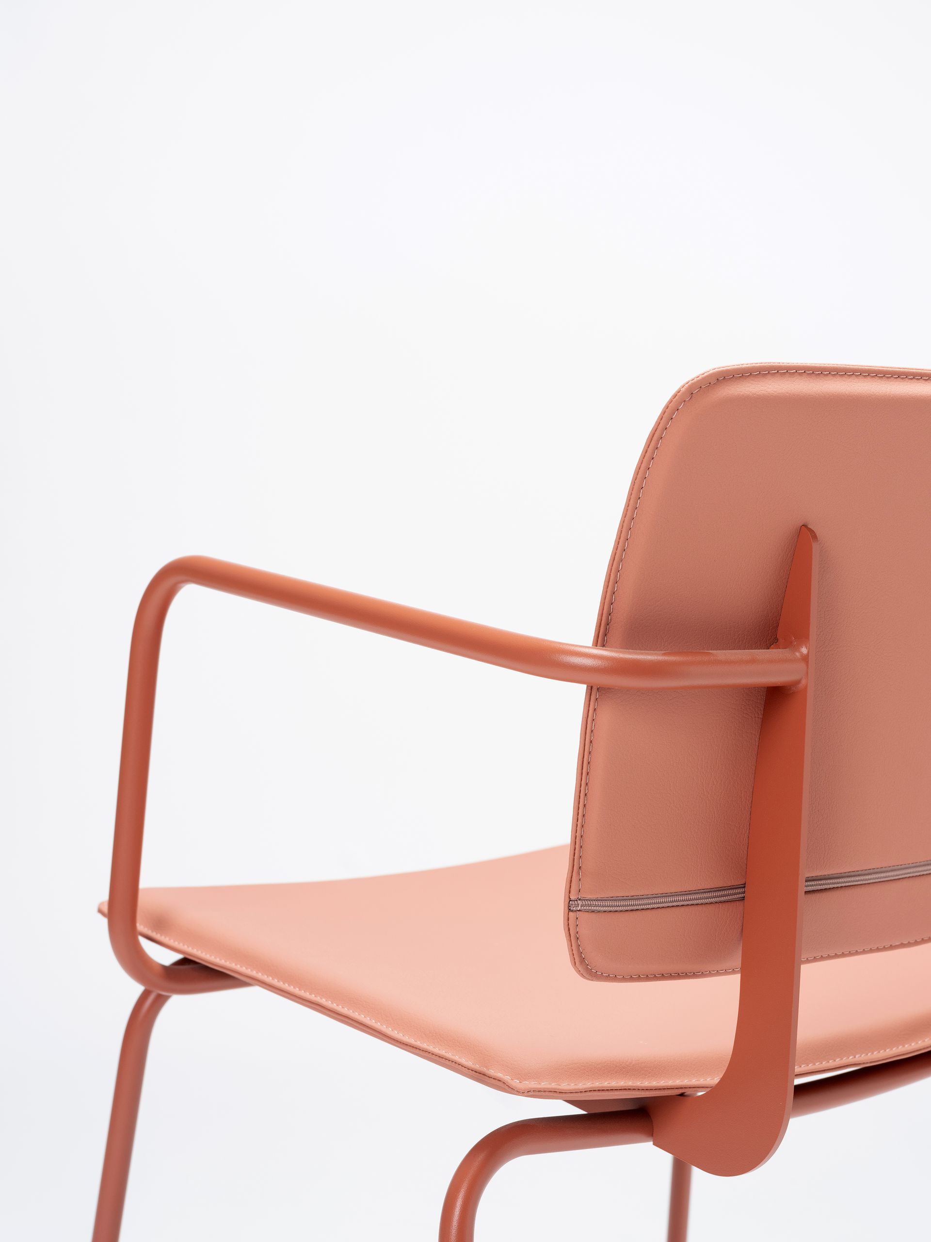 Structure composed of precision cylindrical tubing, 16 mm in diameter and 2 mm thick, in recycled cold-rolled steel. Finish options for the seat and backrest include phenolic laminate and upholstery. For more information, consult the technical sheet.