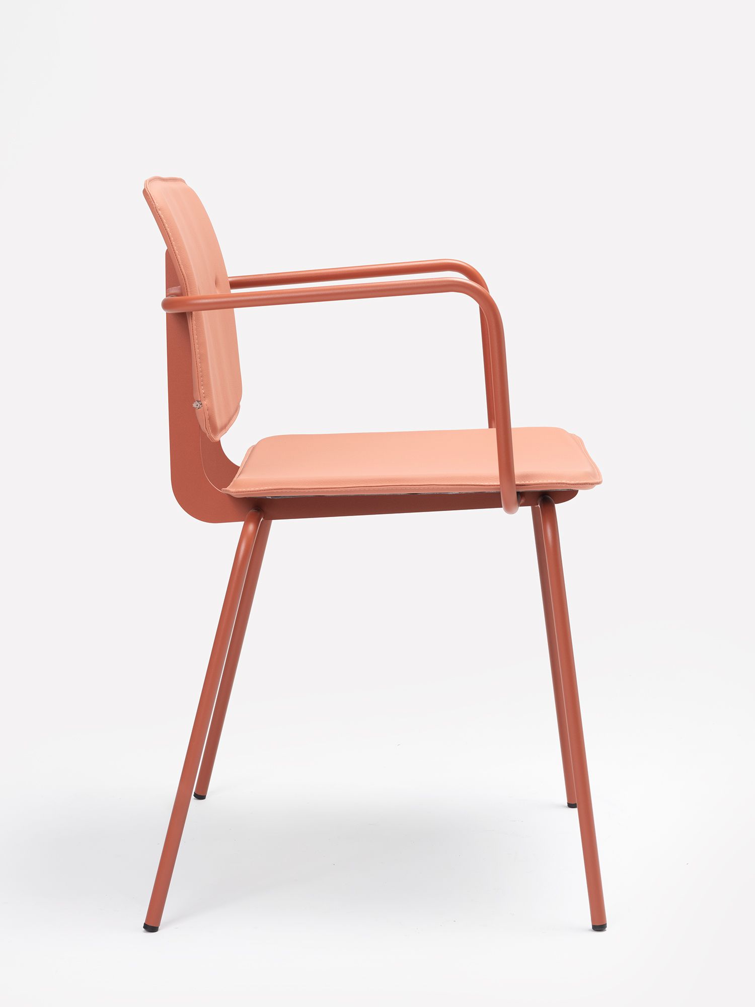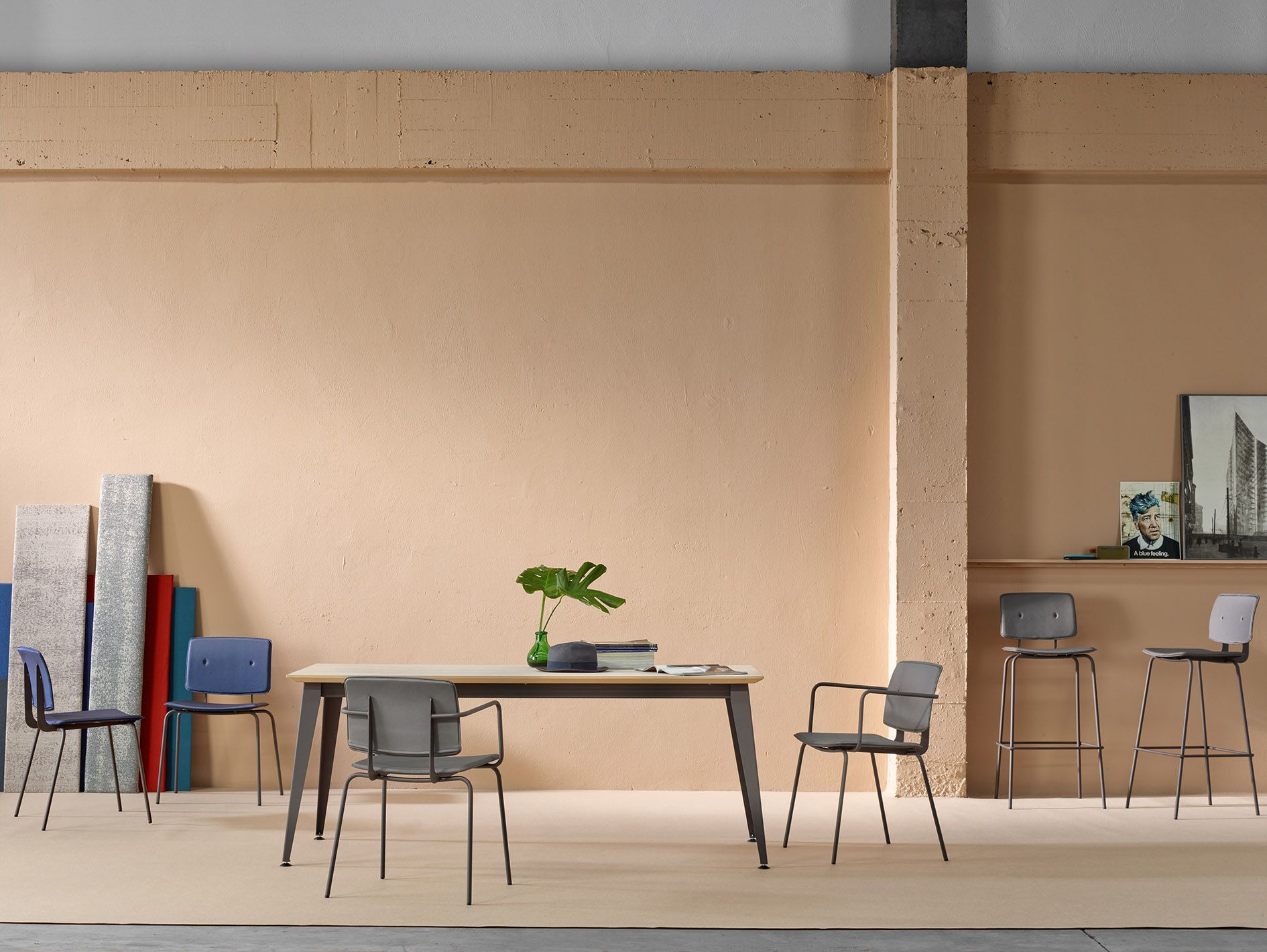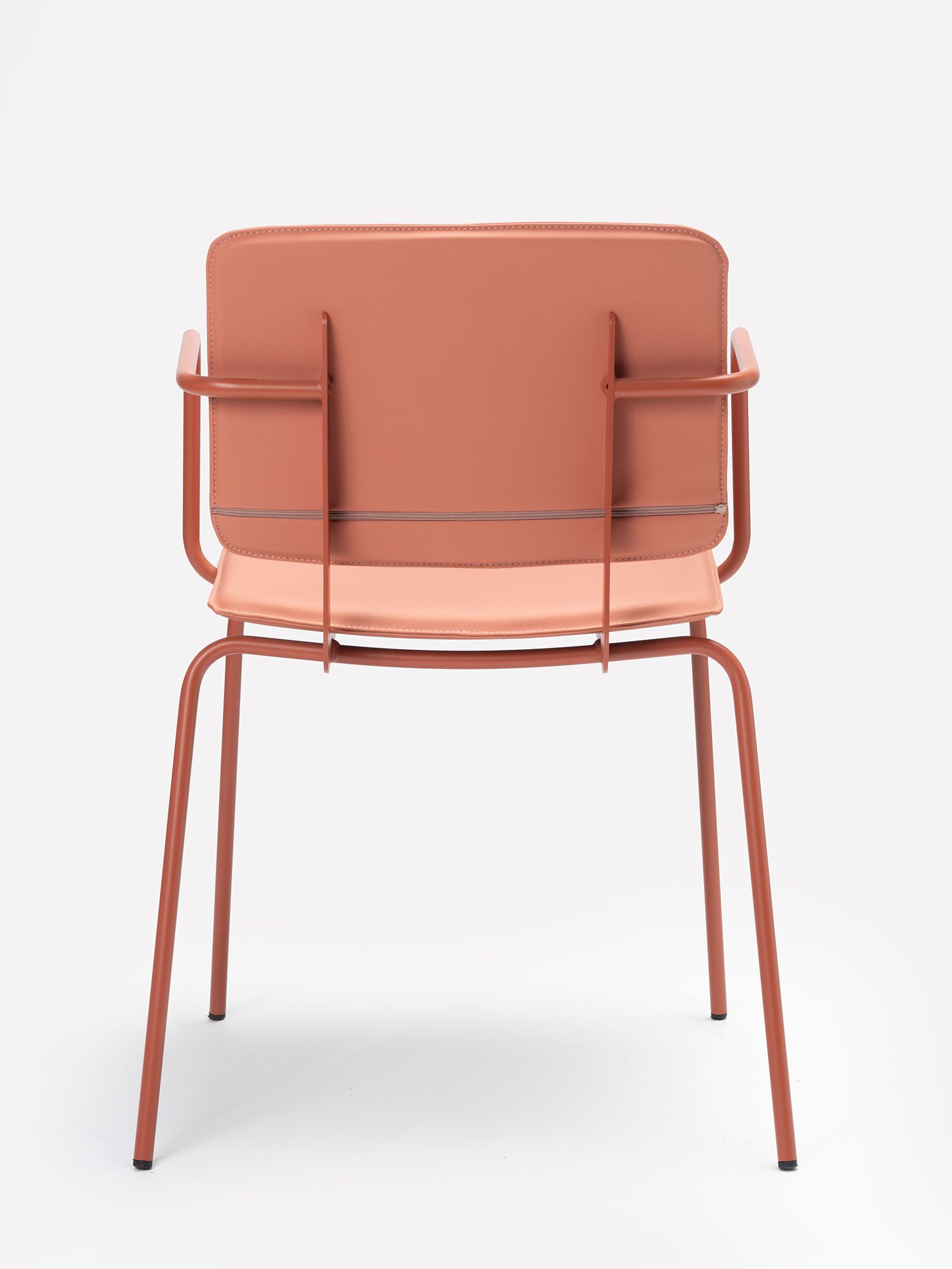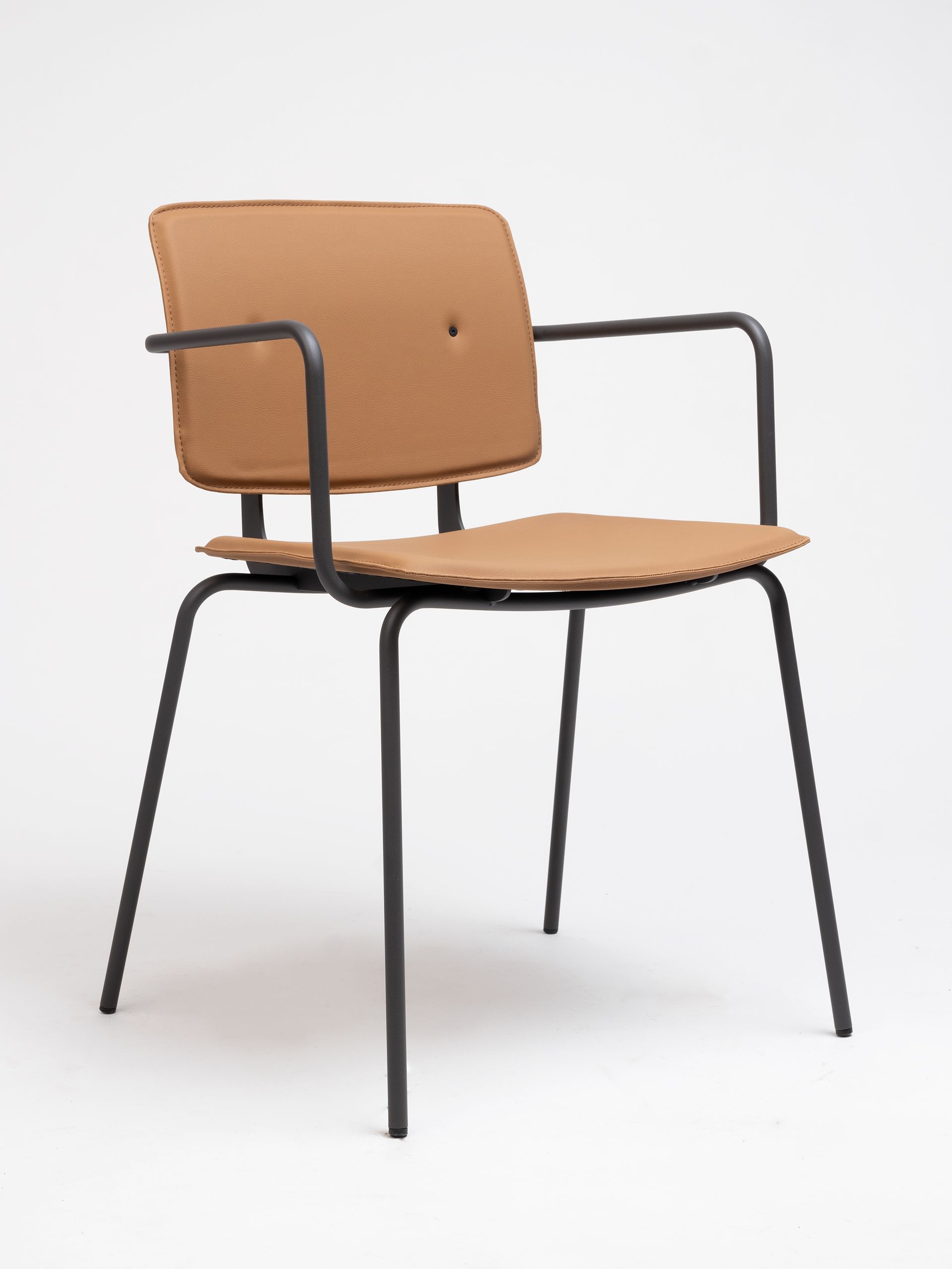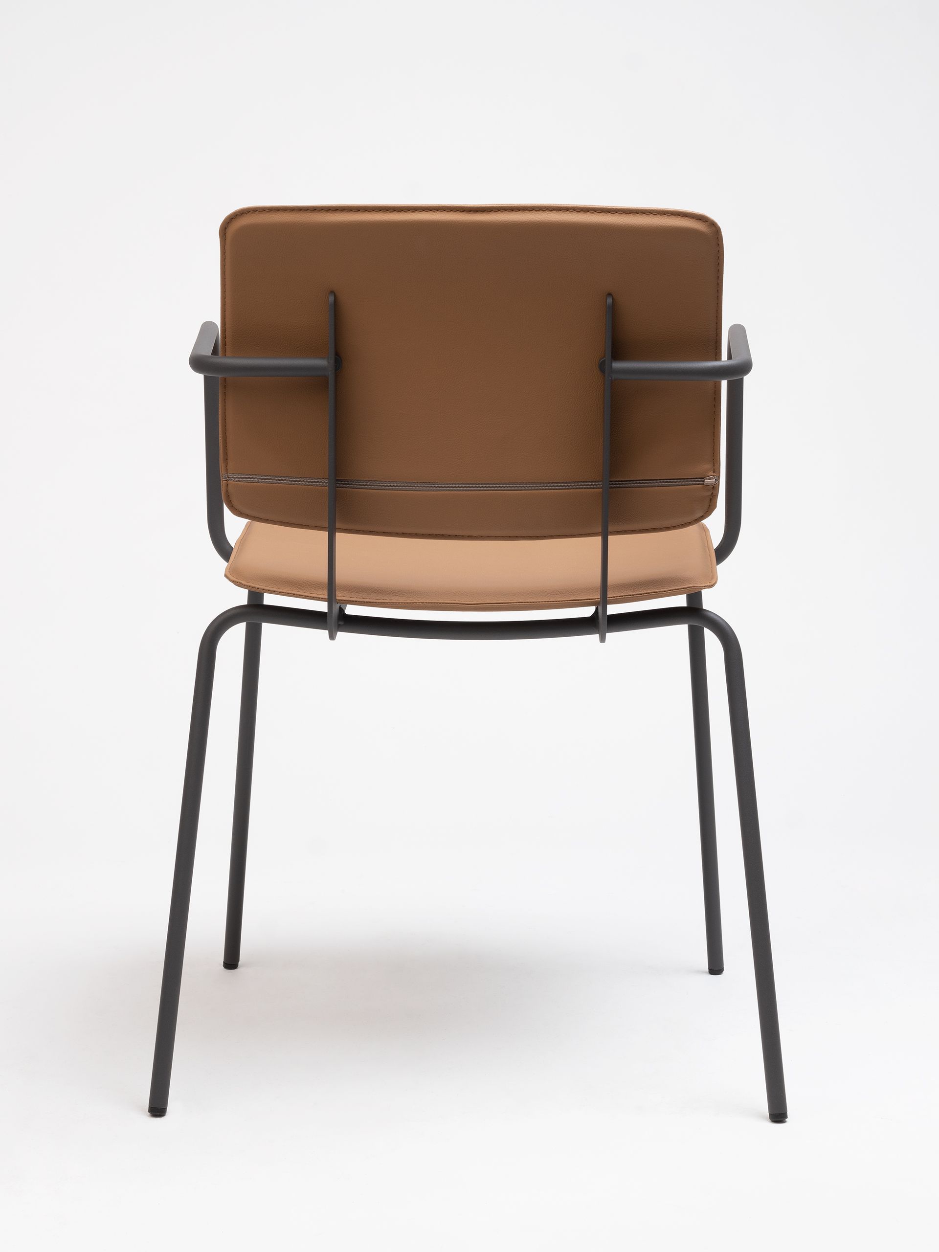 Structure composed of precision cylindrical tubing, 16 mm in diameter and 2 mm thick, in recycled cold-rolled steel. Finish options for the seat and backrest include phenolic laminate and upholstery. For more information, consult the technical sheet.