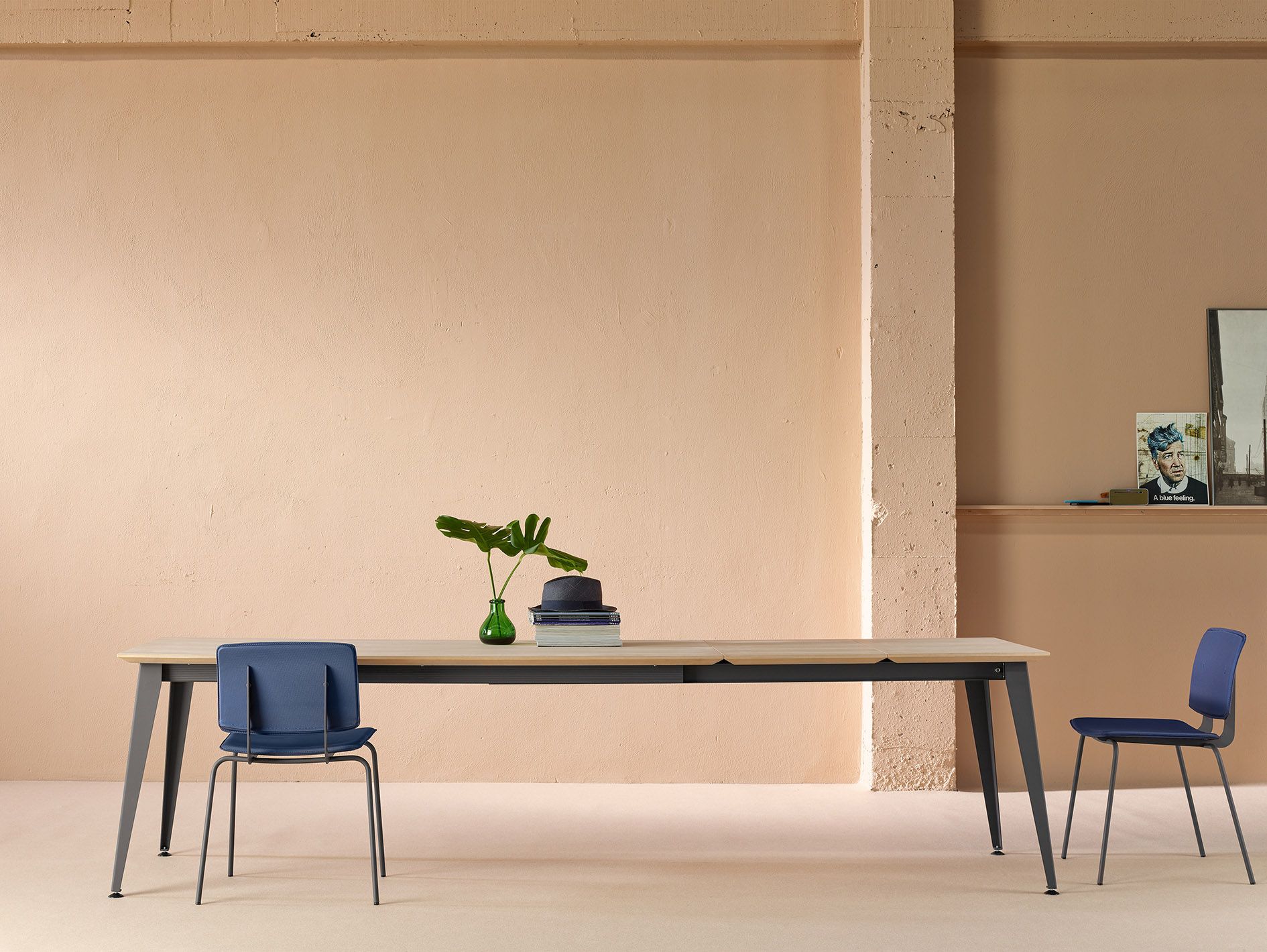 A steel-structure table that bursts into the space, filling it with industrial airs. It may be combined with tabletops made of different woods or laminates. With a fixed or extendable design, the Don table is a blend of its own identity, full of strength, creating radically different spaces.