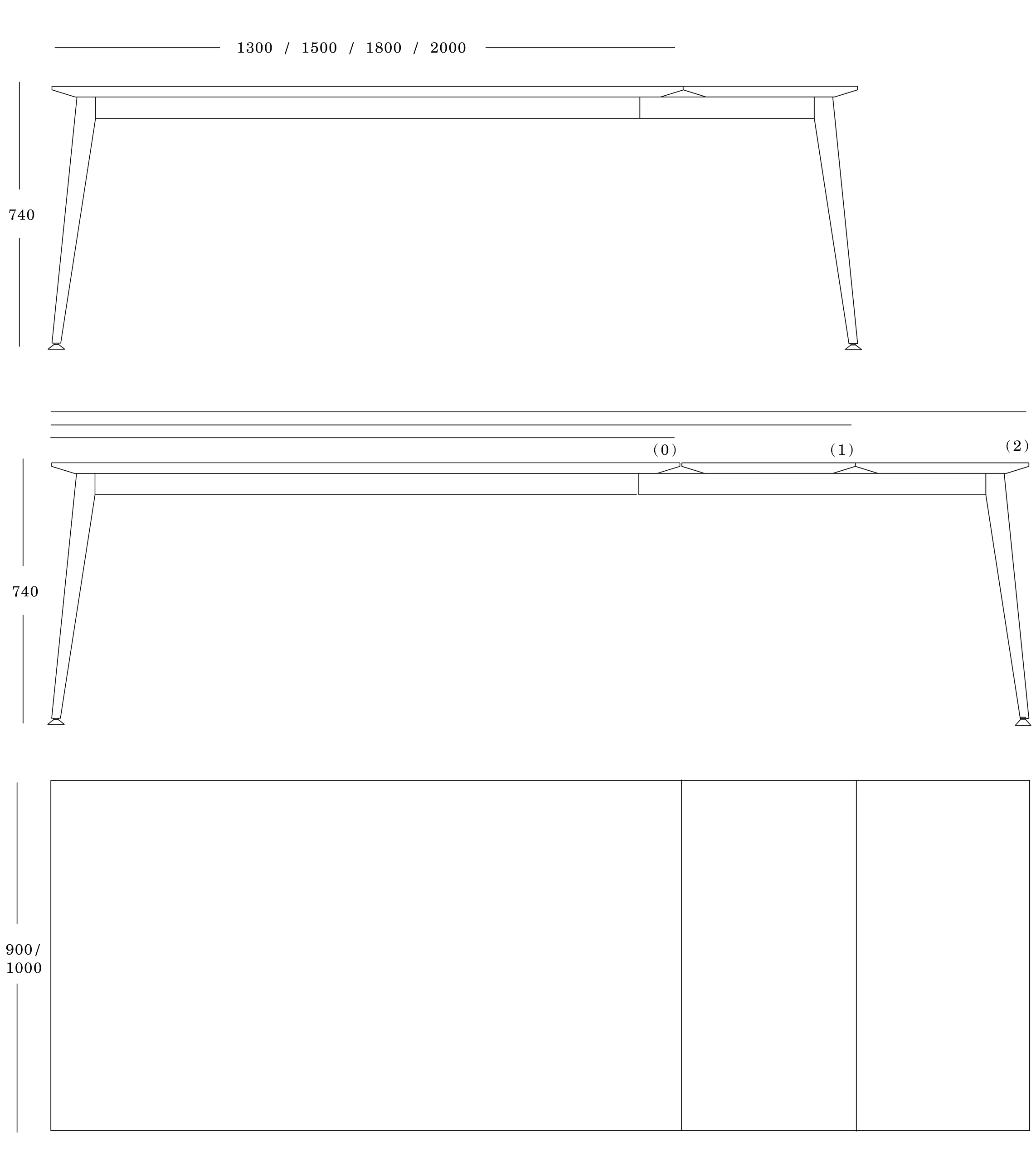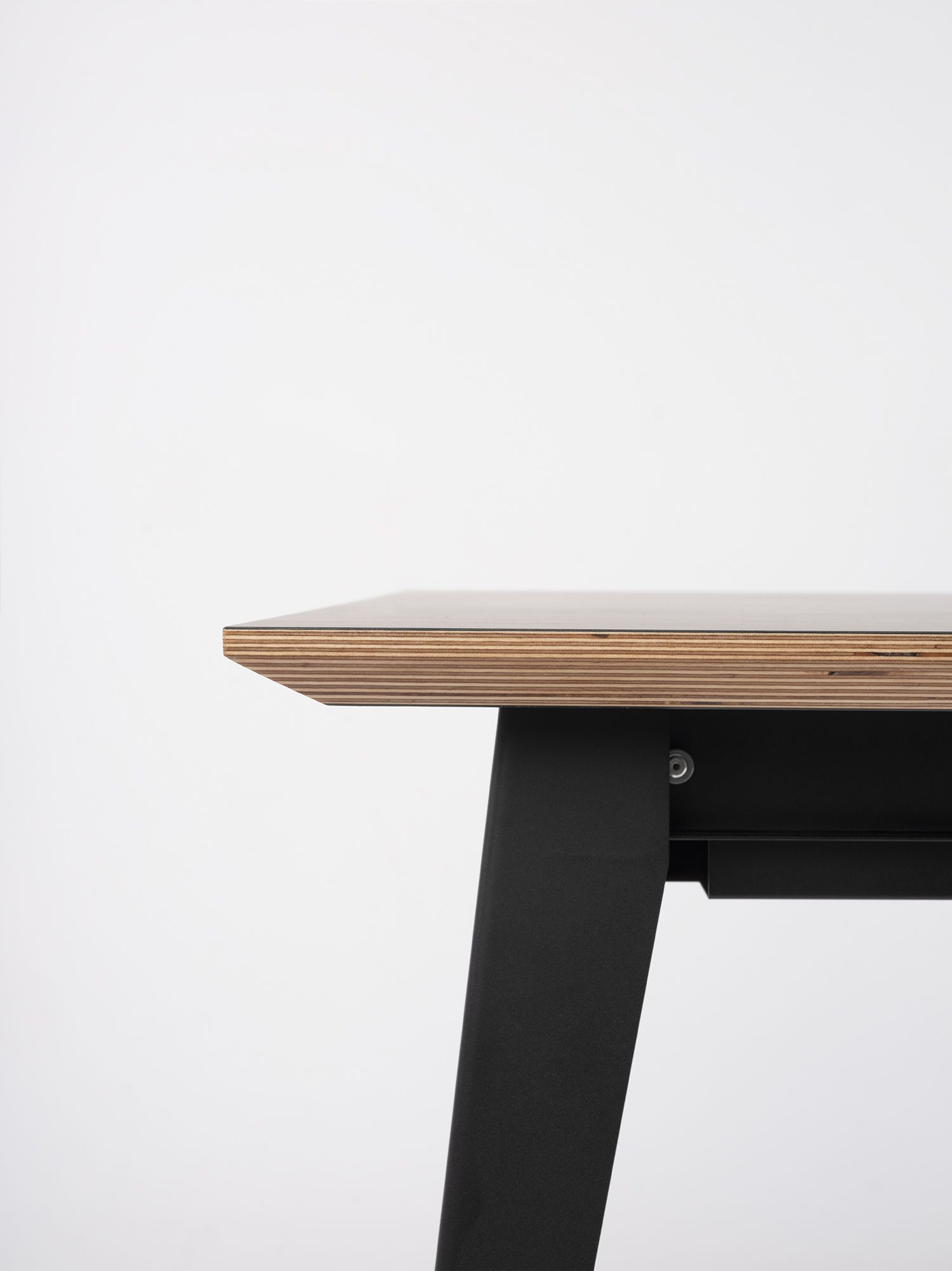 Frame with aluminum sliding system. Legs made of 3 mm thick steel sheet, laser-cut and bent at 90 degrees. Finish options for the tabletop include laminated birch plywood, Arpa Fenix + birch plywood. For more information, consult the technical sheet.