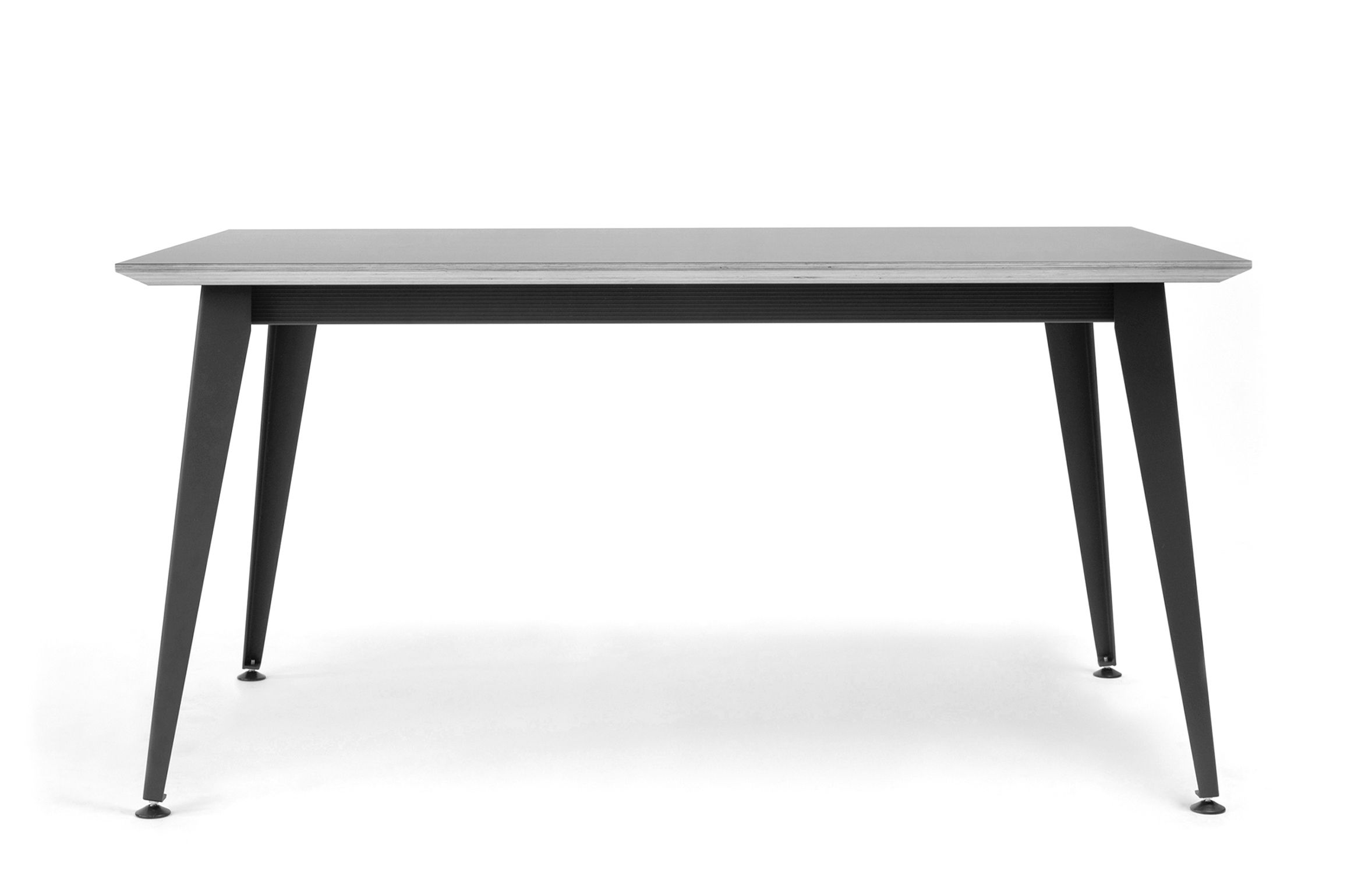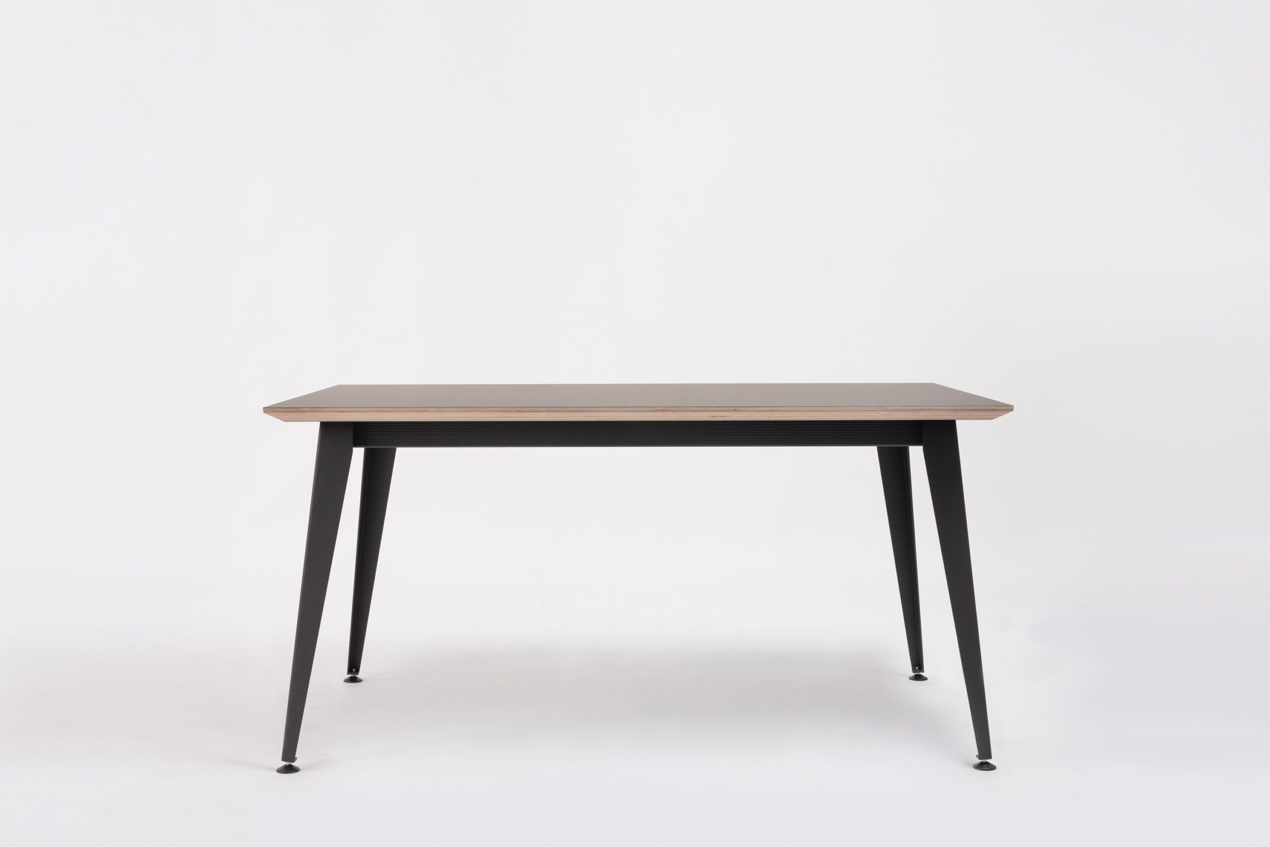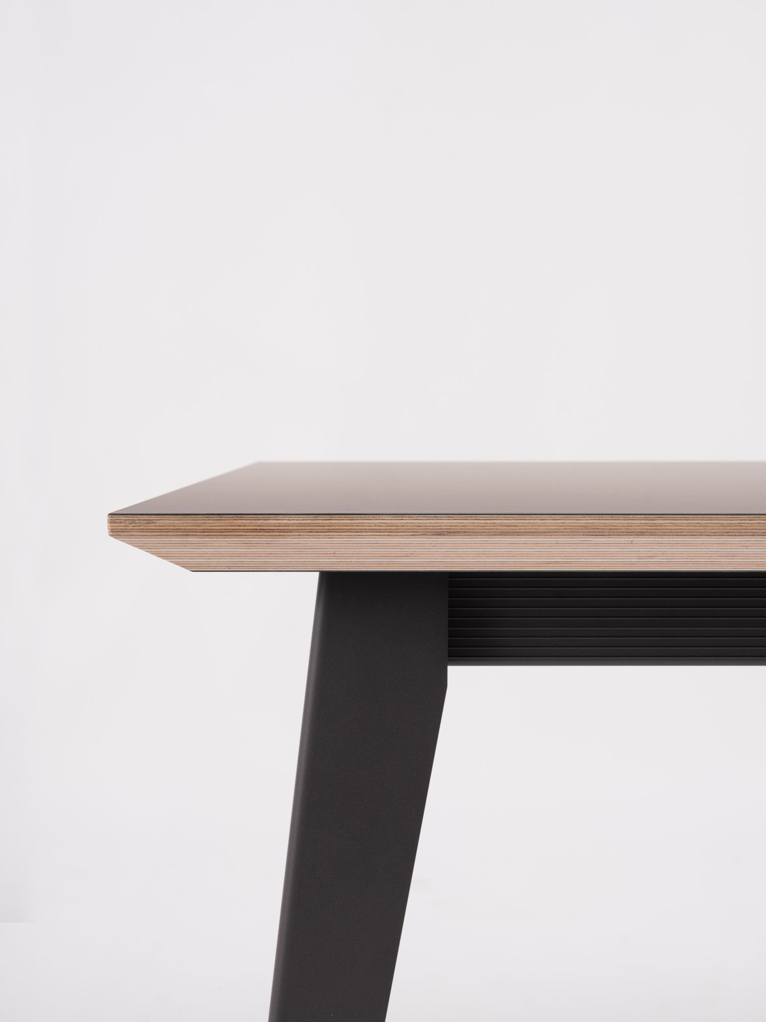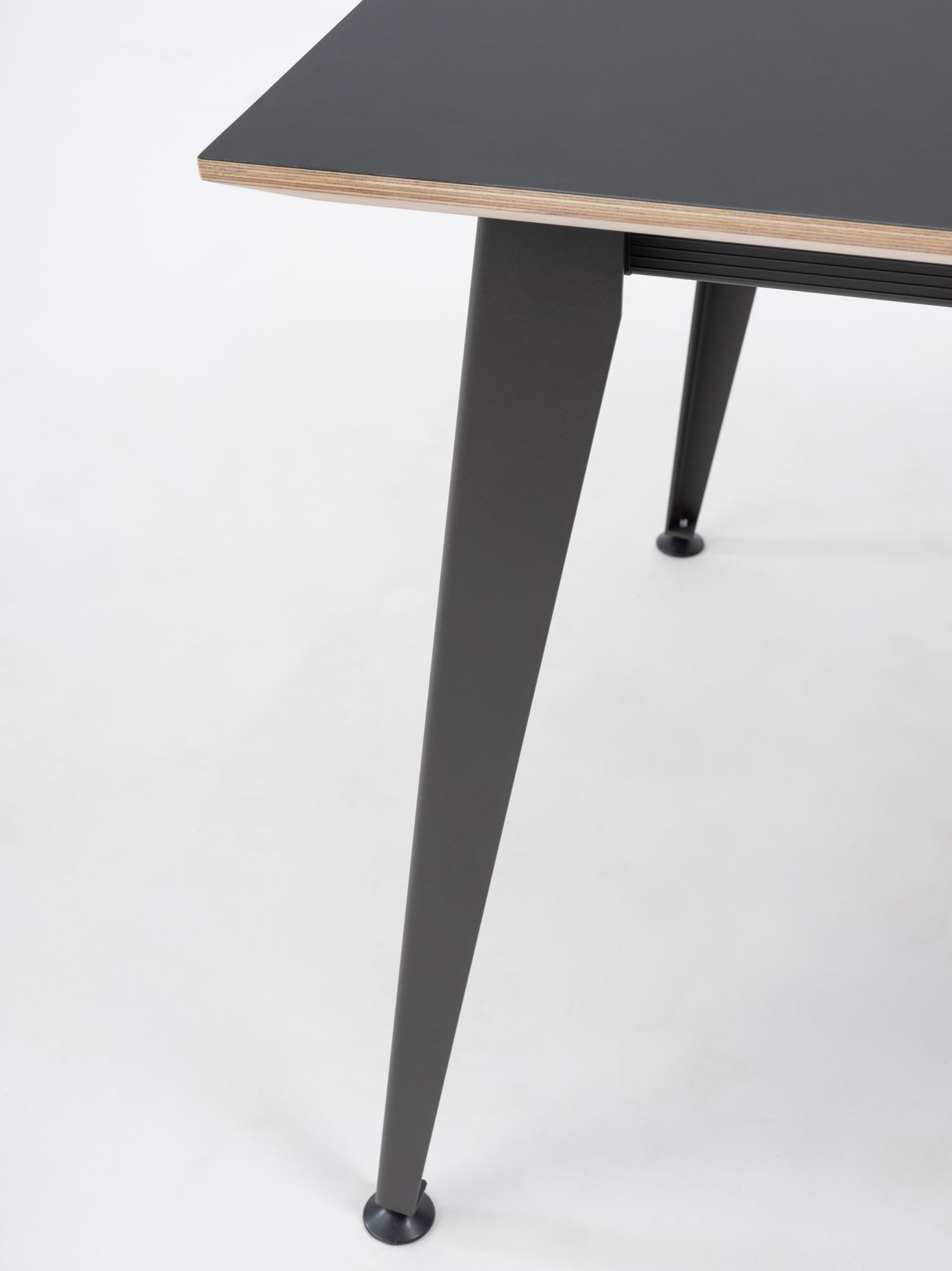 Legs made of 3 mm thick steel sheet, laser-cut and bent at 90 degrees and aluminum frame.. Finish options for the tabletop include laminated birch plywood, Arpa Fenix + birch plywood, stained oak + MDF, and stained beech + MDF. For more information, consult the technical sheet.