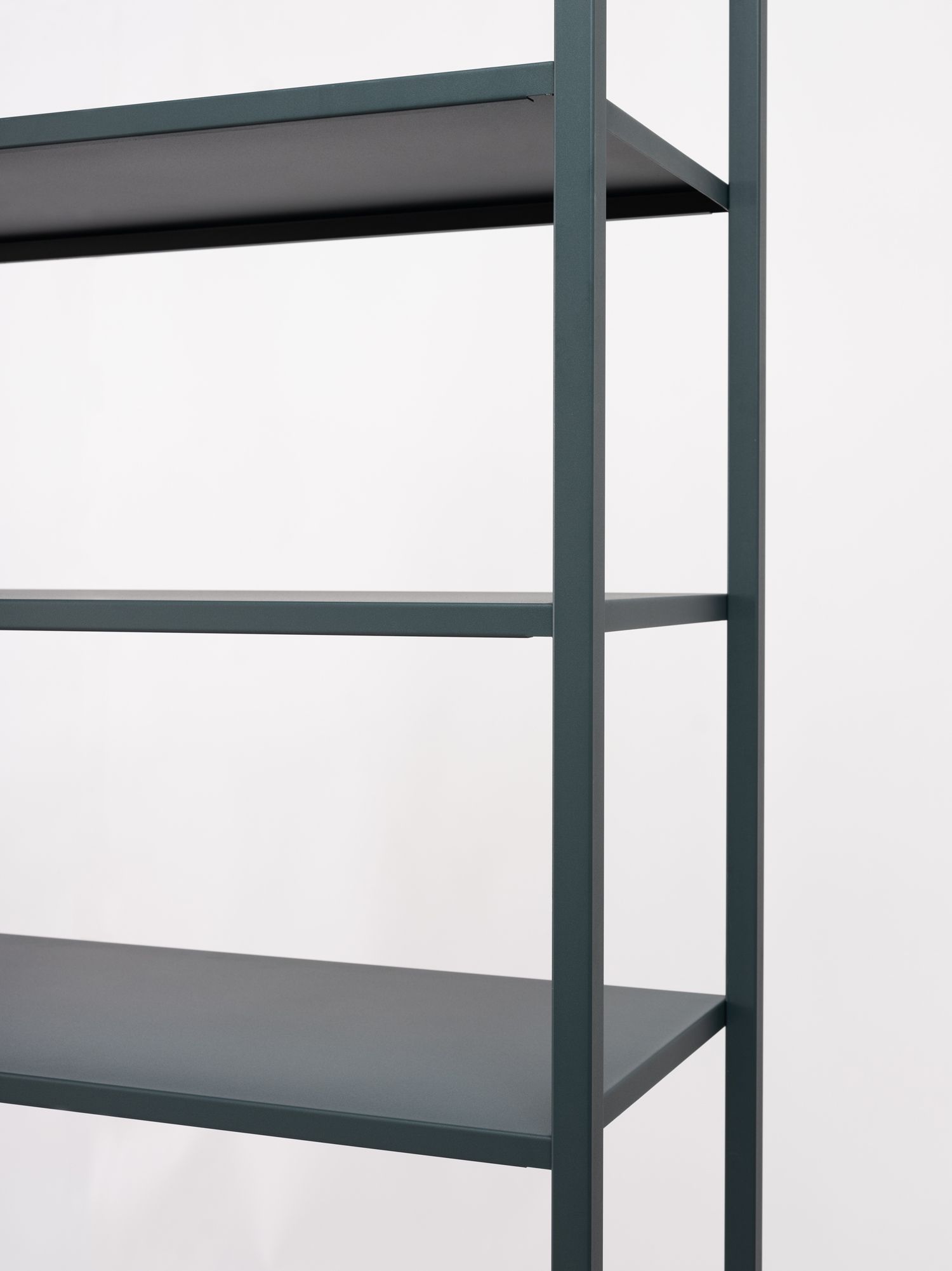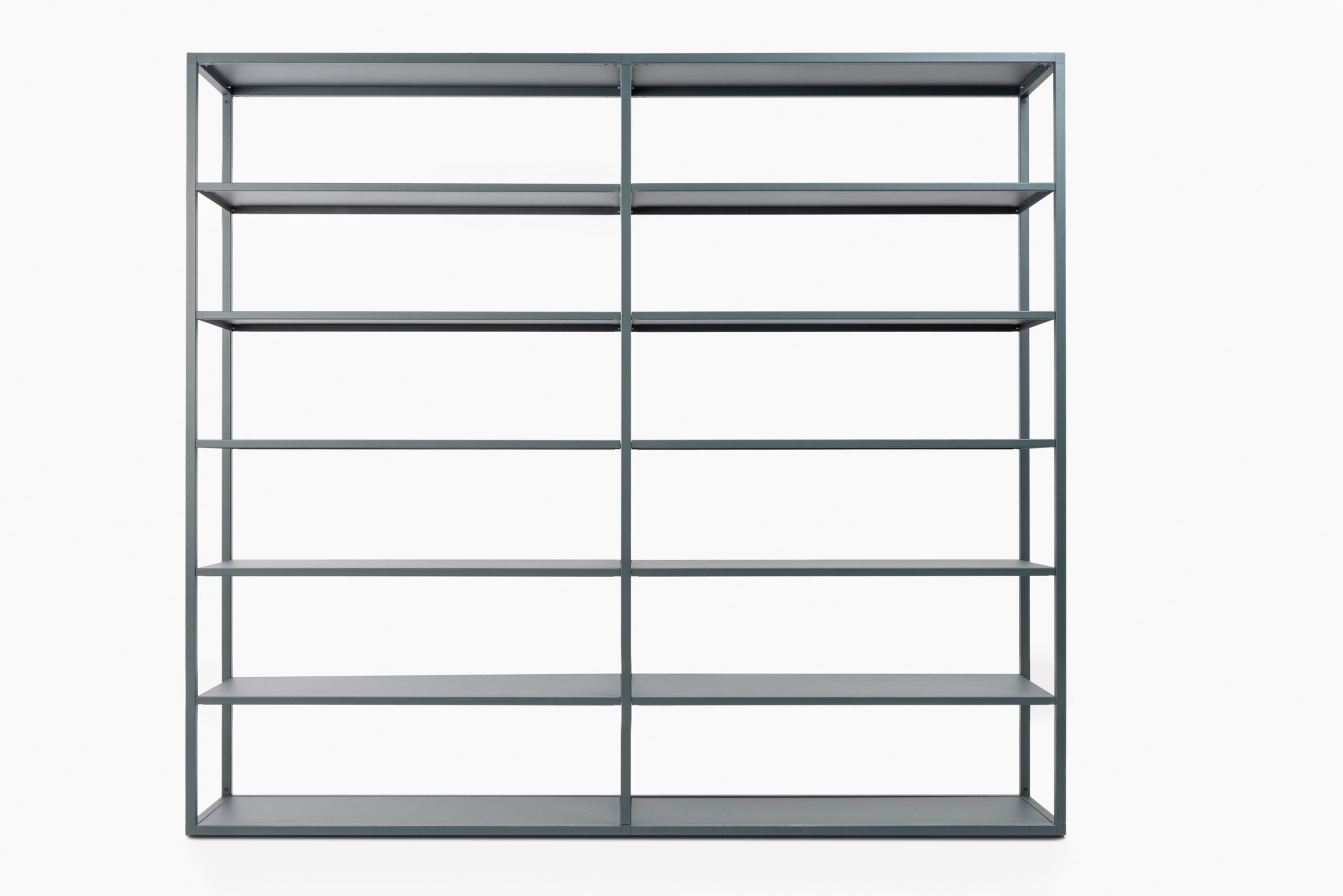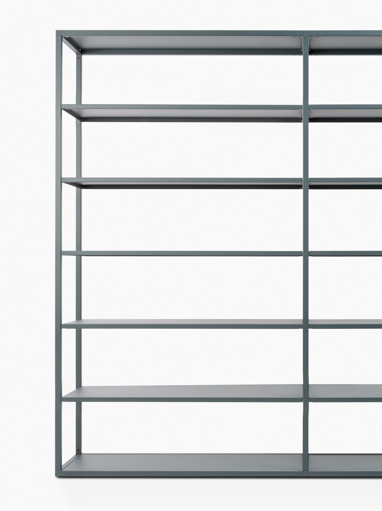 Structure composed of precision square tubing, 30 mm on each side and 2 mm thick, in recycled cold-rolled steel. Shelves are made of 1.5 mm thick cold-rolled steel sheet with epoxy color finish. For more information, consult the technical sheet.