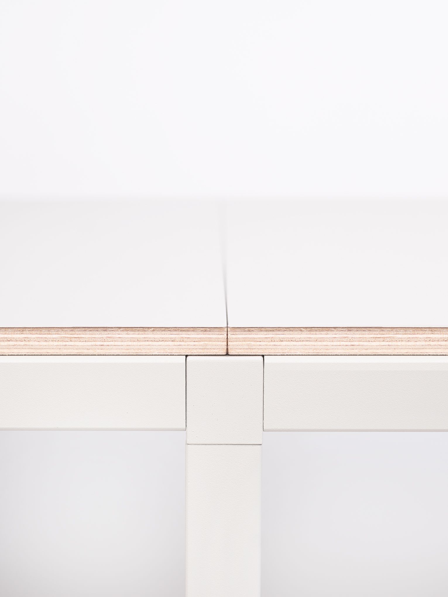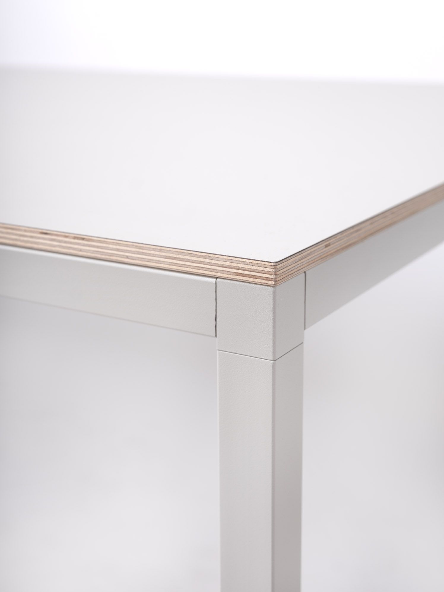 Structure composed of precision square tubing, 30 mm on each side and 2 mm thick, in recycled cold-rolled steel. Options for the tabletop include laminate, laminated birch plywood, Arpa Fenix + birch plywood, beech, and stained oak. For more information, consult the technical sheet.