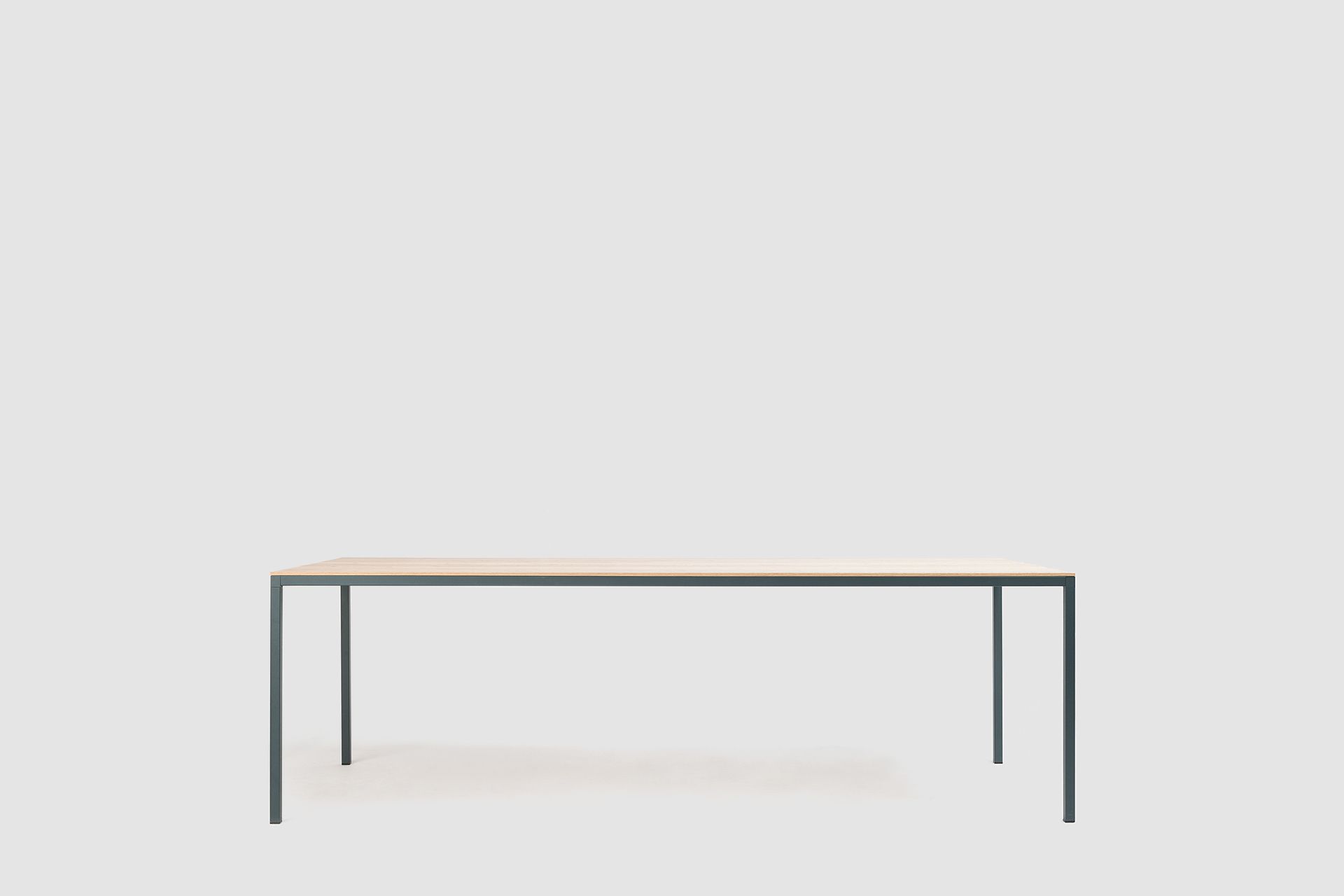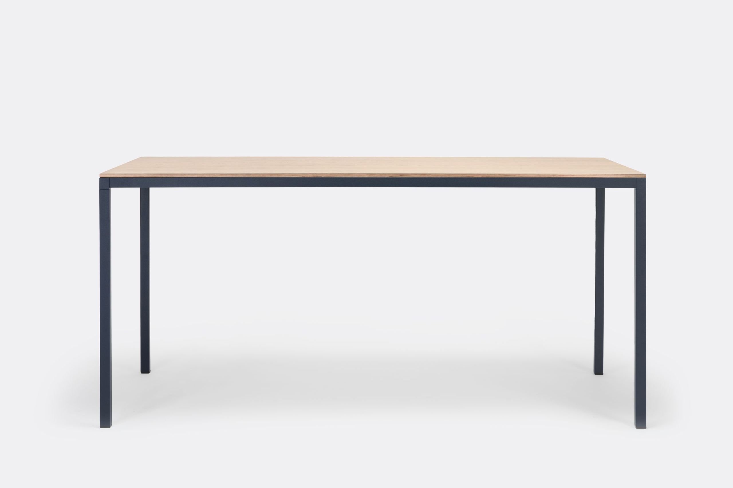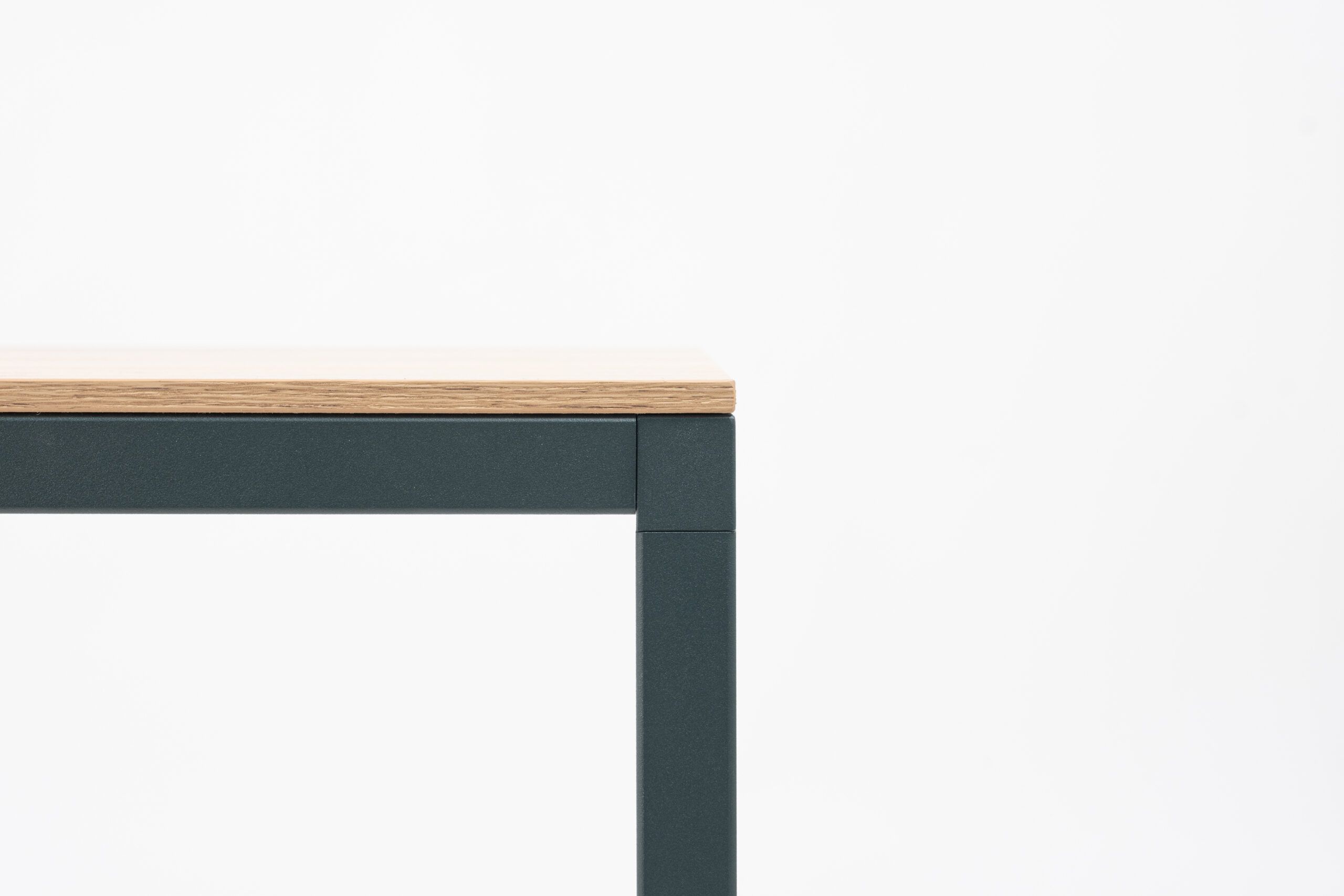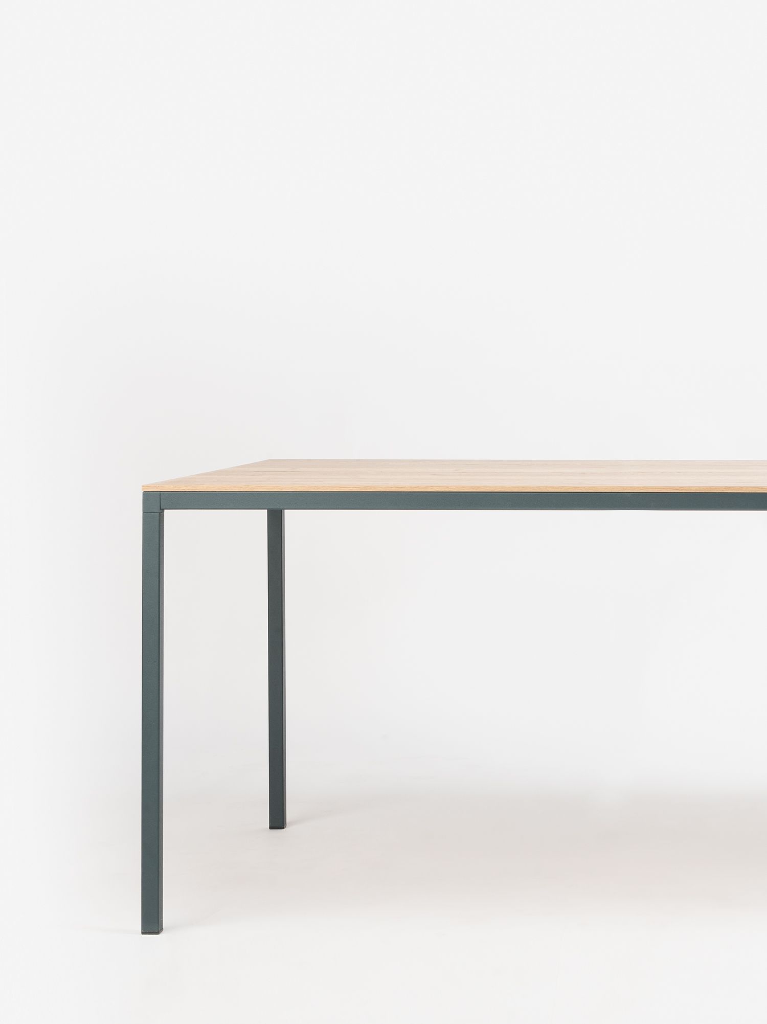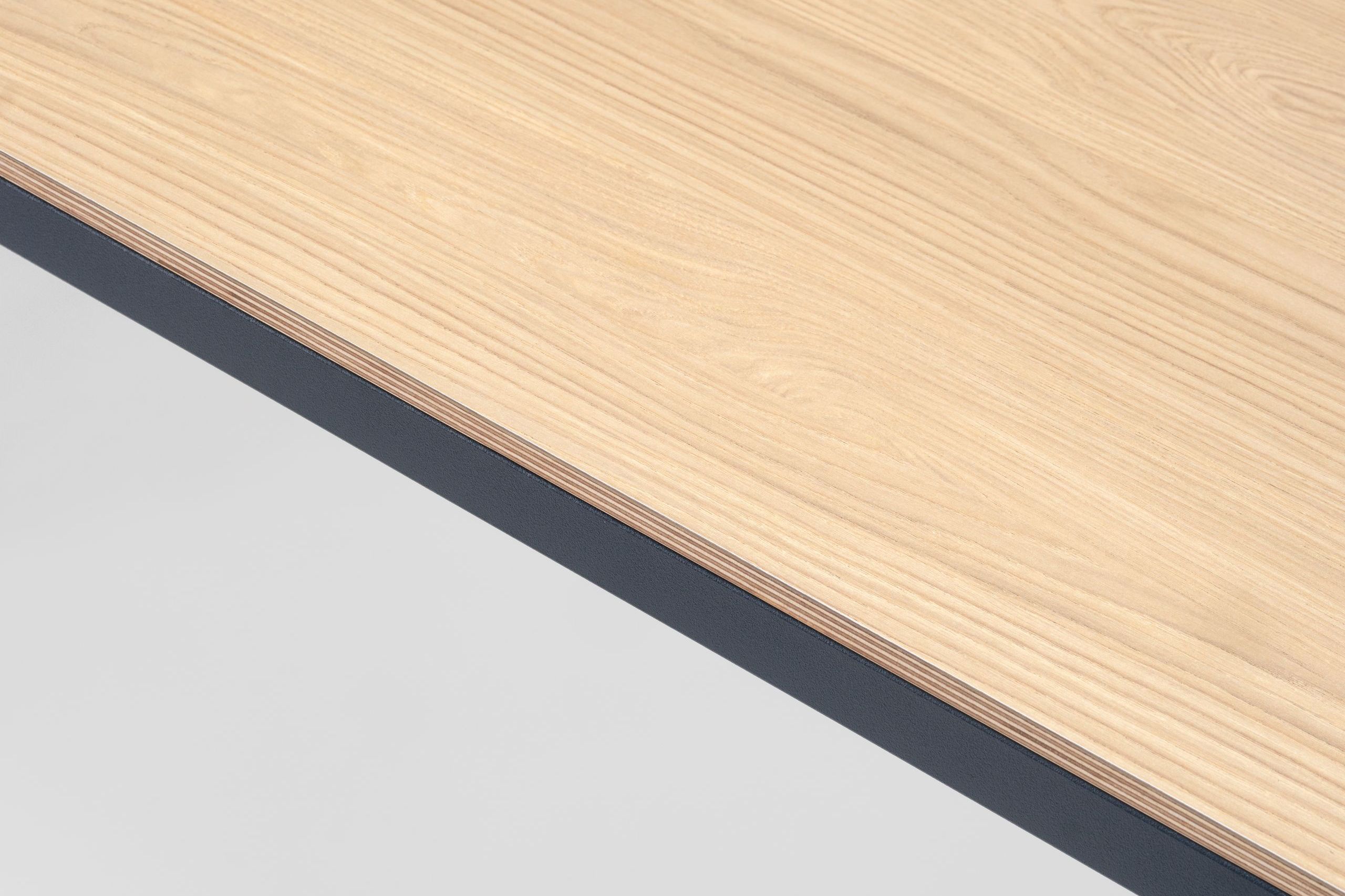 Structure composed of precision square tubing, 30 mm on each side and 2 mm thick, in recycled cold-rolled steel. Options for the tabletop include laminate, laminated birch plywood, Arpa Fenix + birch plywood, beech, and stained oak. For more information, consult the technical sheet.