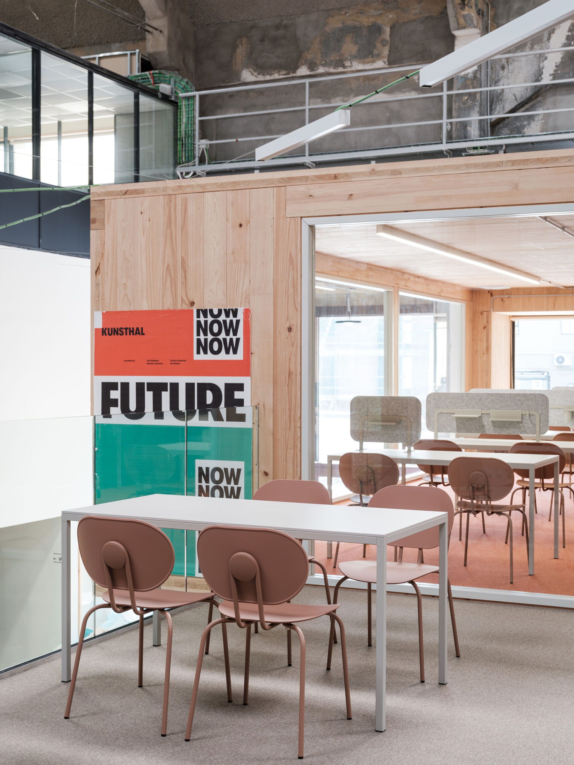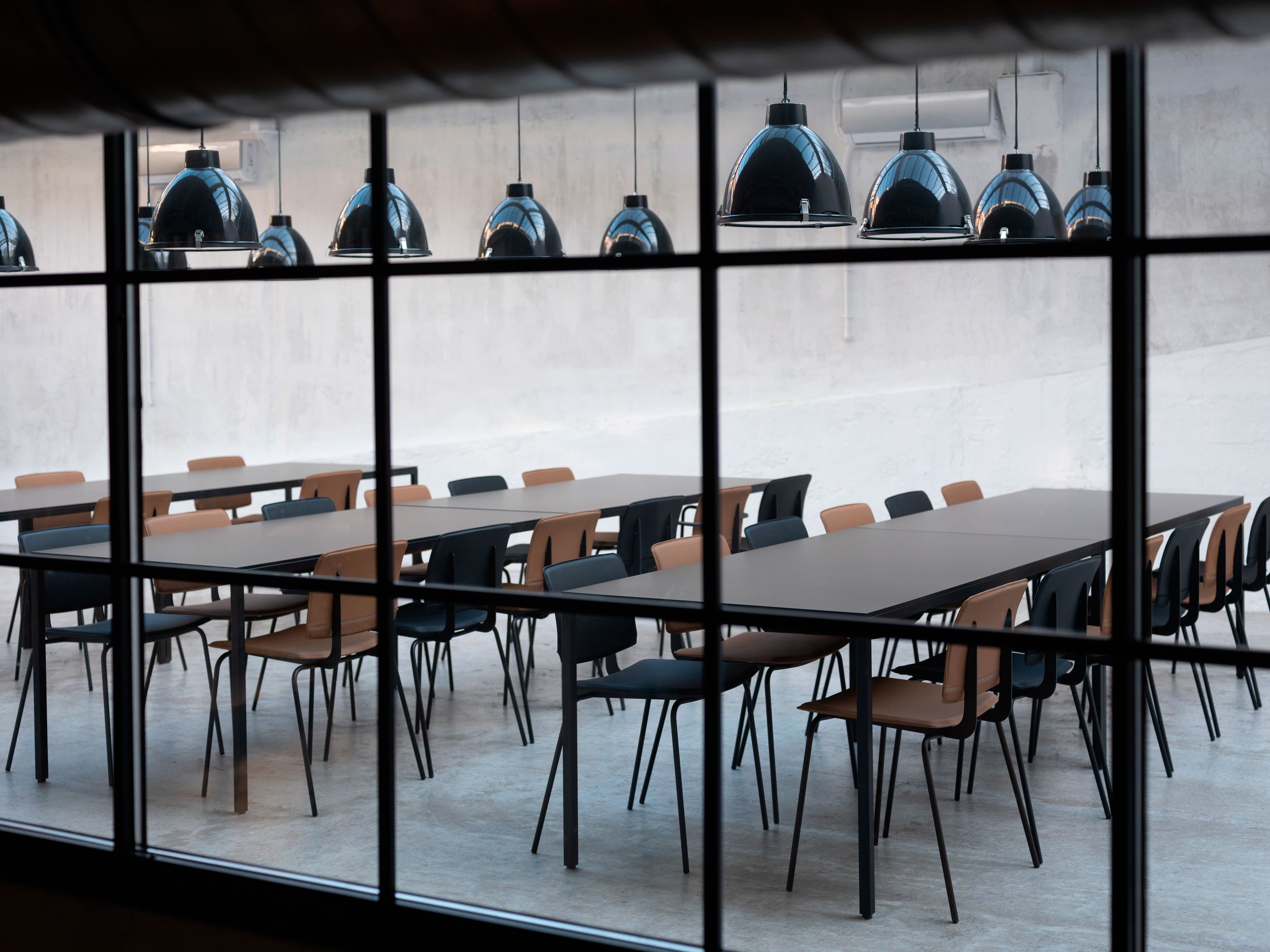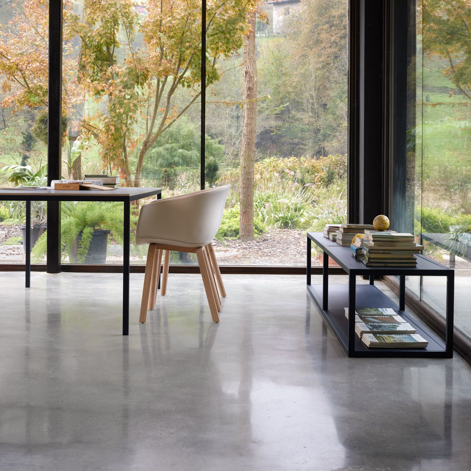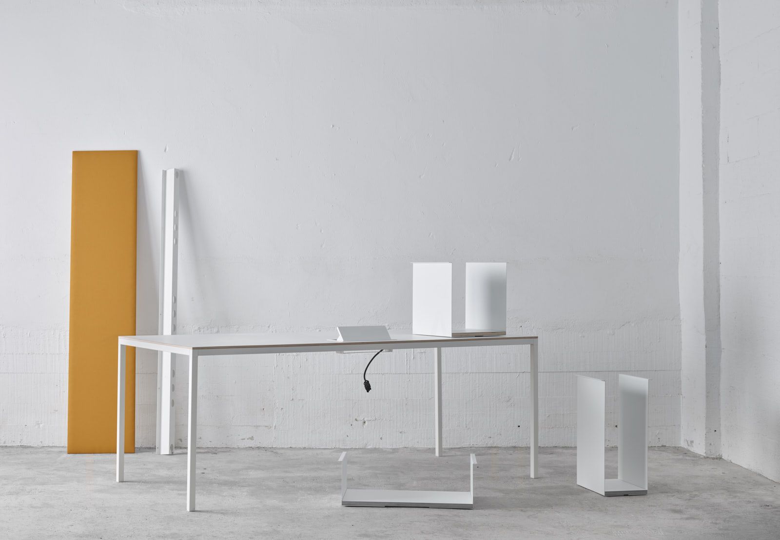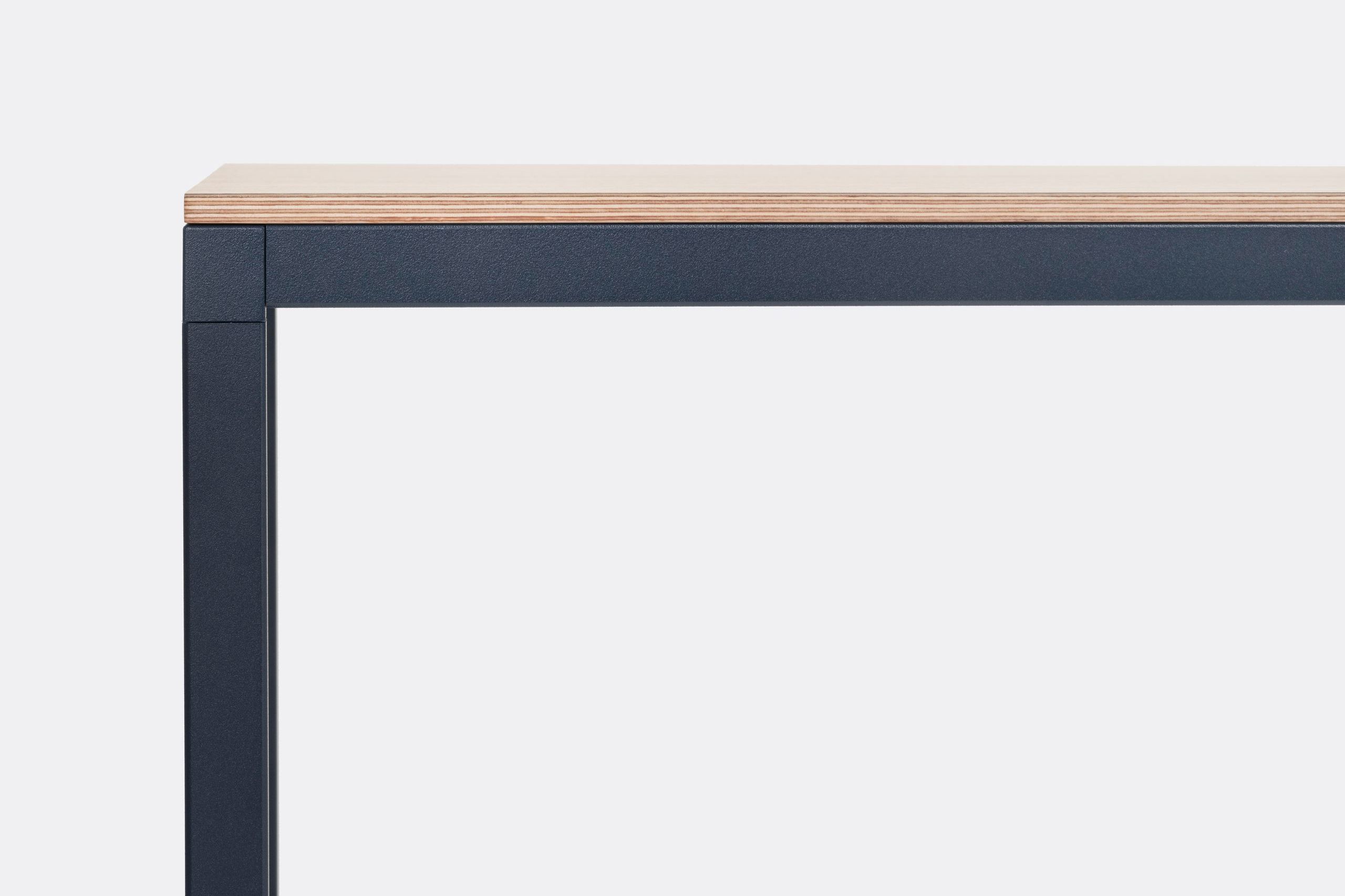 Structure composed of precision square tubing, 30 mm on each side and 2 mm thick, in recycled cold-rolled steel. Options for the tabletop include laminate, laminated birch plywood, Arpa Fenix + birch plywood, beech, and stained oak. For more information, consult the technical sheet.