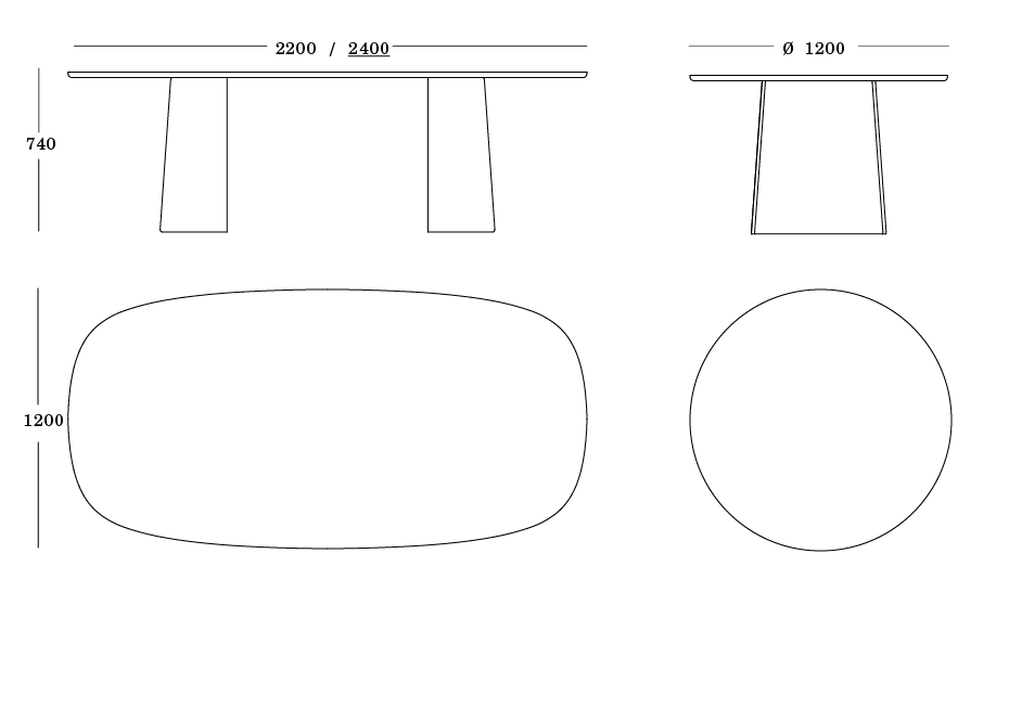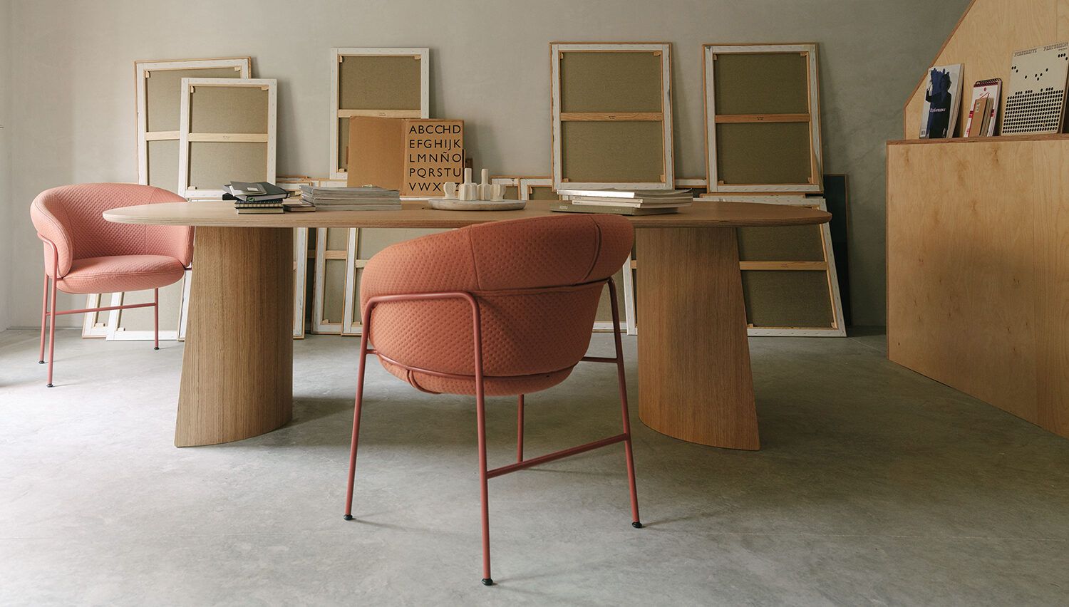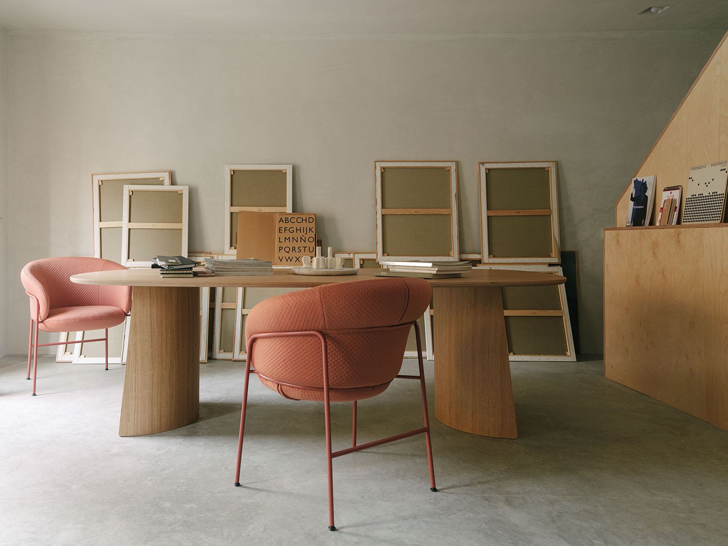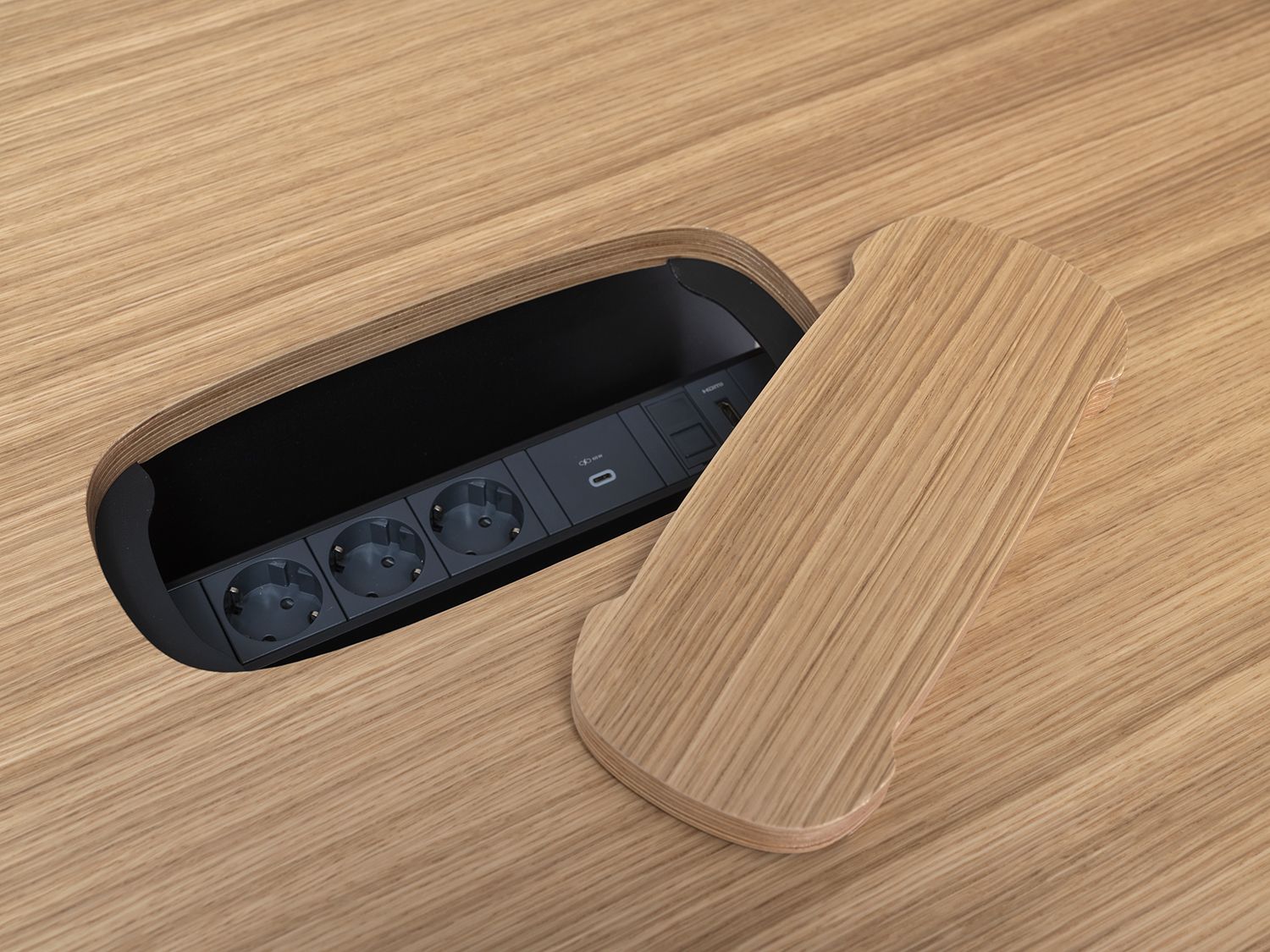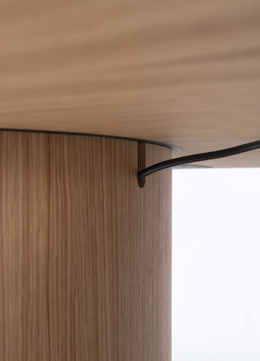 Legs in oak wood over 15 mm thick beech plywood. Options for the tabletop include oak + birch plywood and Arpa Fenix + birch plywood. For more information, consult the technical sheet.