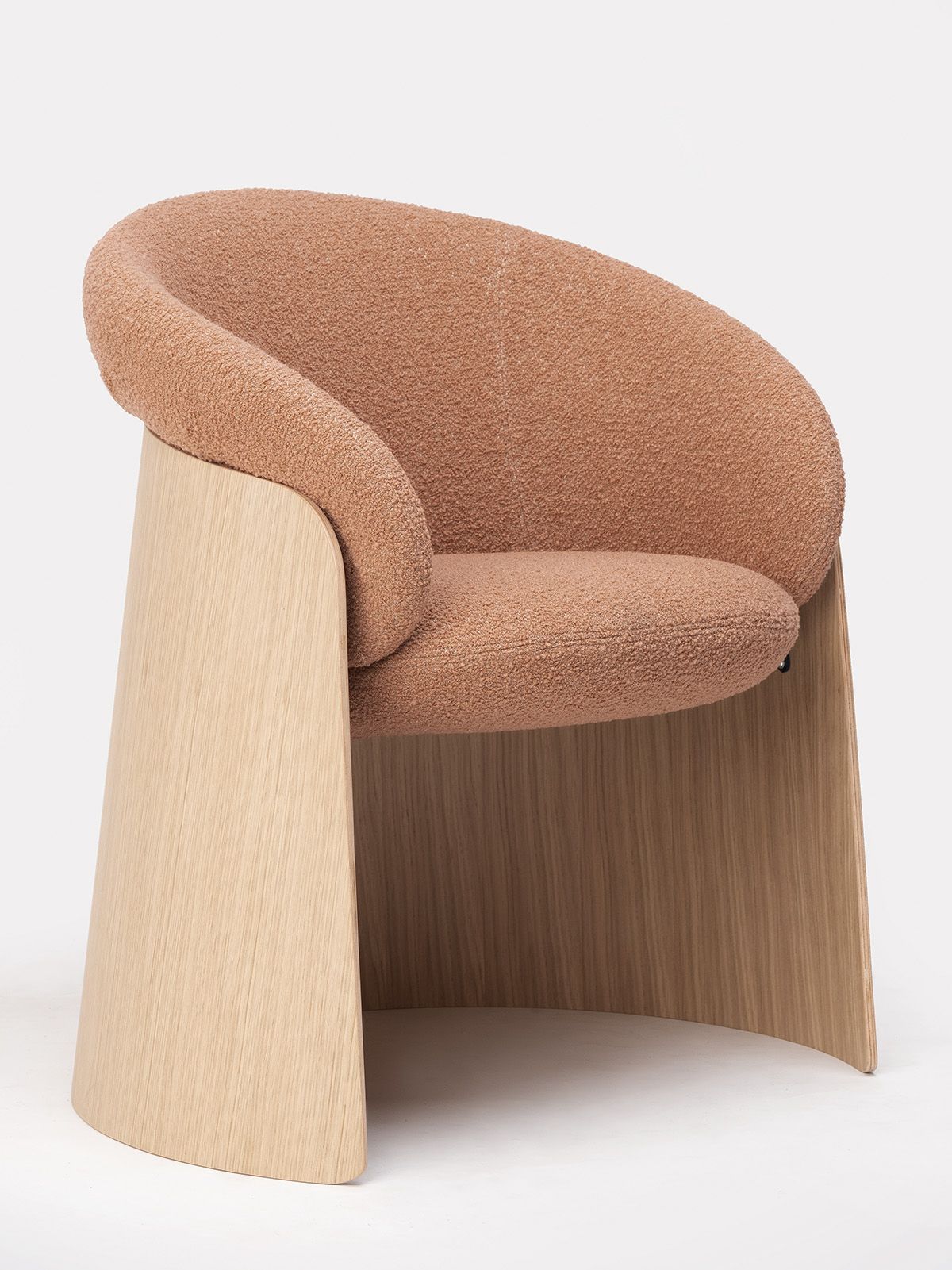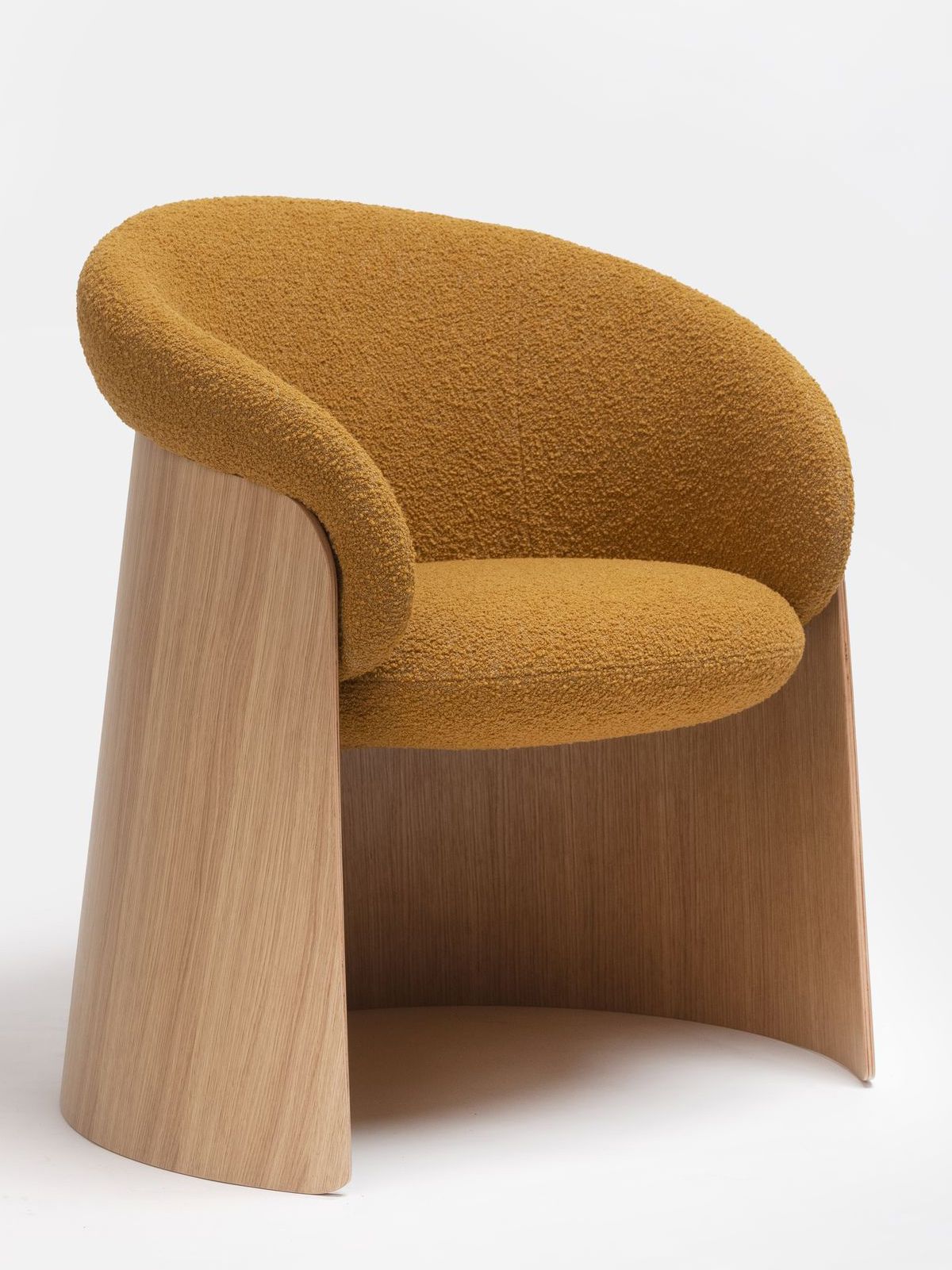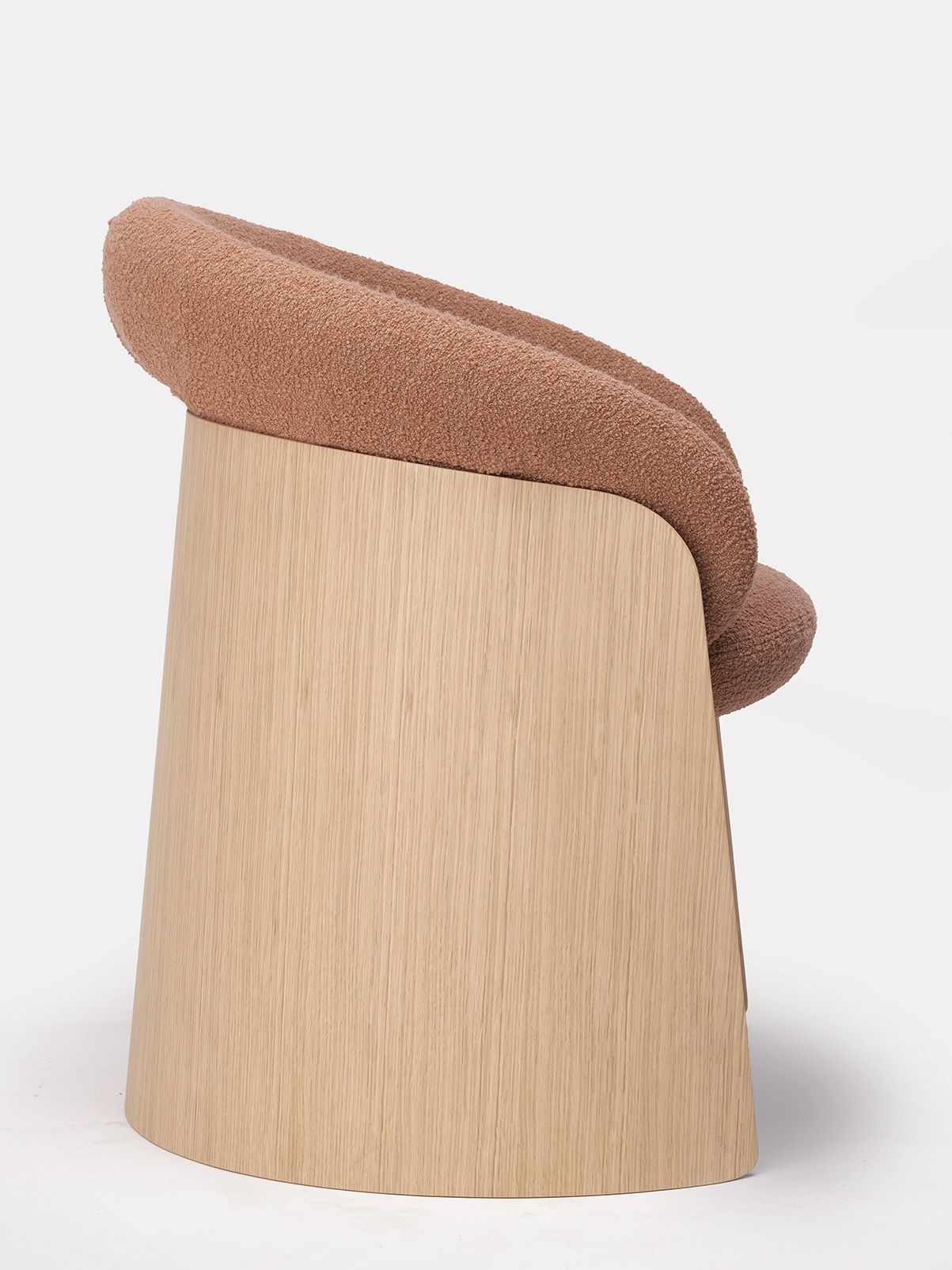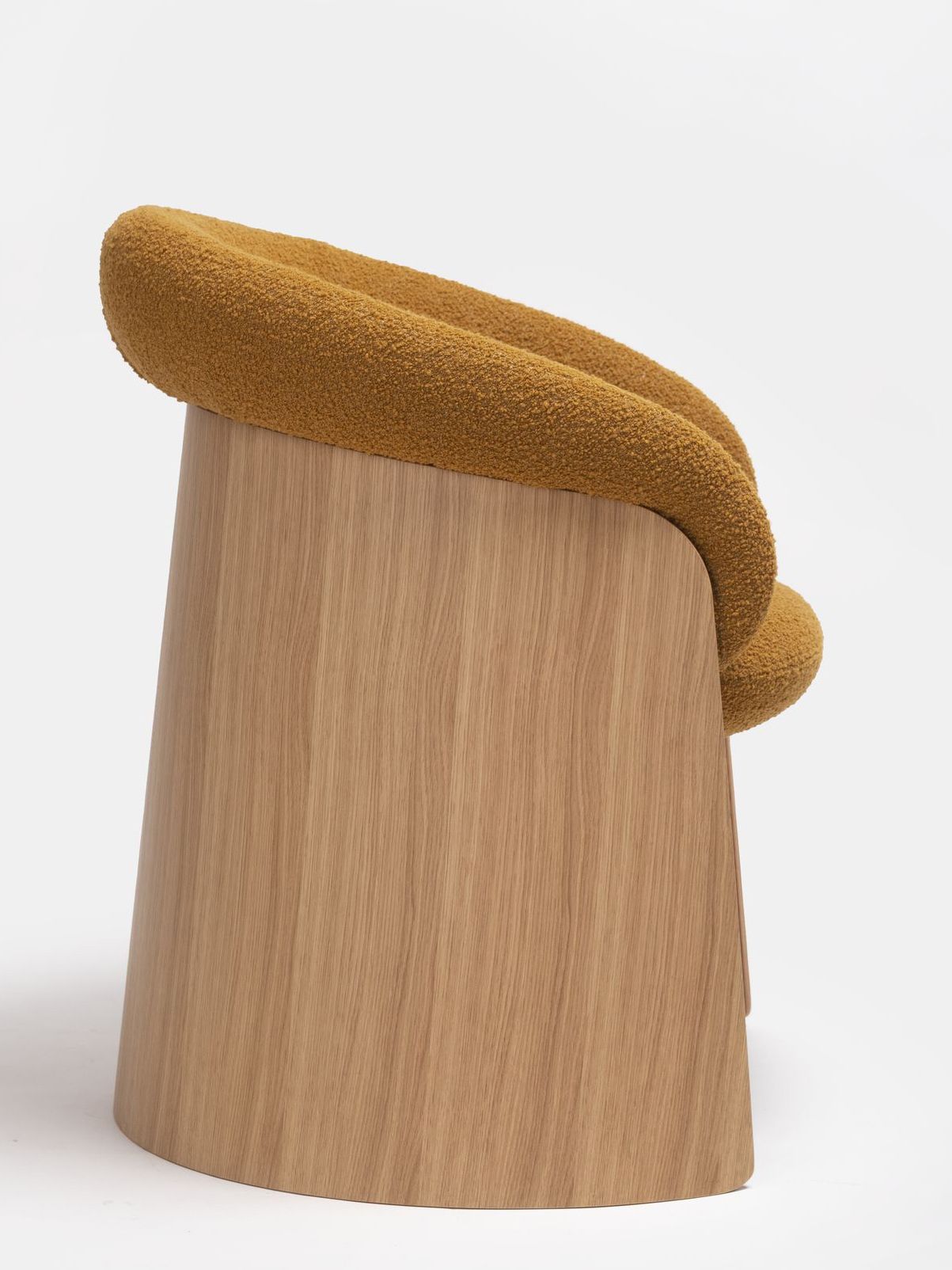 The seat for the Ginger chair, with its soft and rounded shapes, can rest on three different base typologies; a four-leg structure, a decorative and organic sled framework, and a wooden collar base. A sculptural design that provides comfort and cosiness.