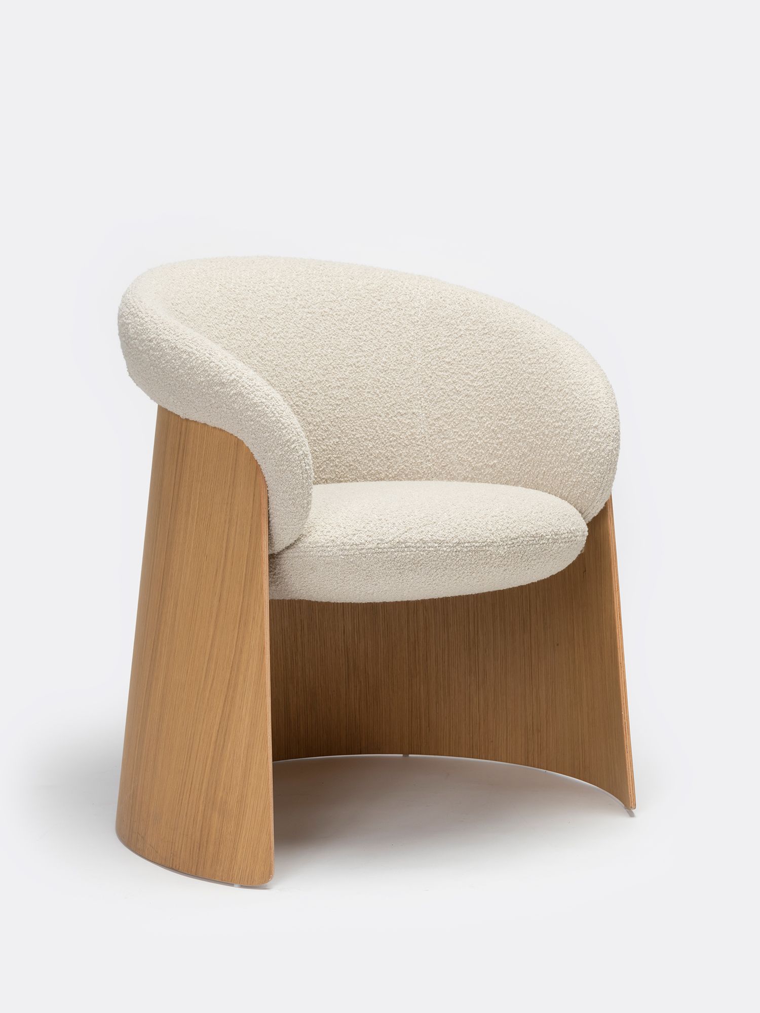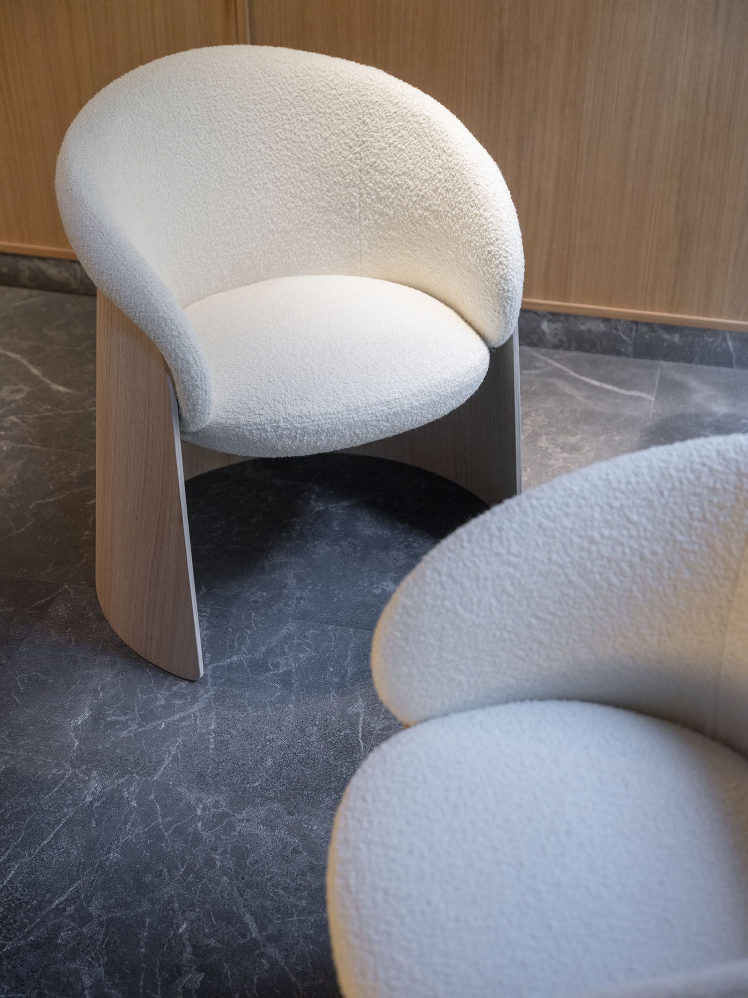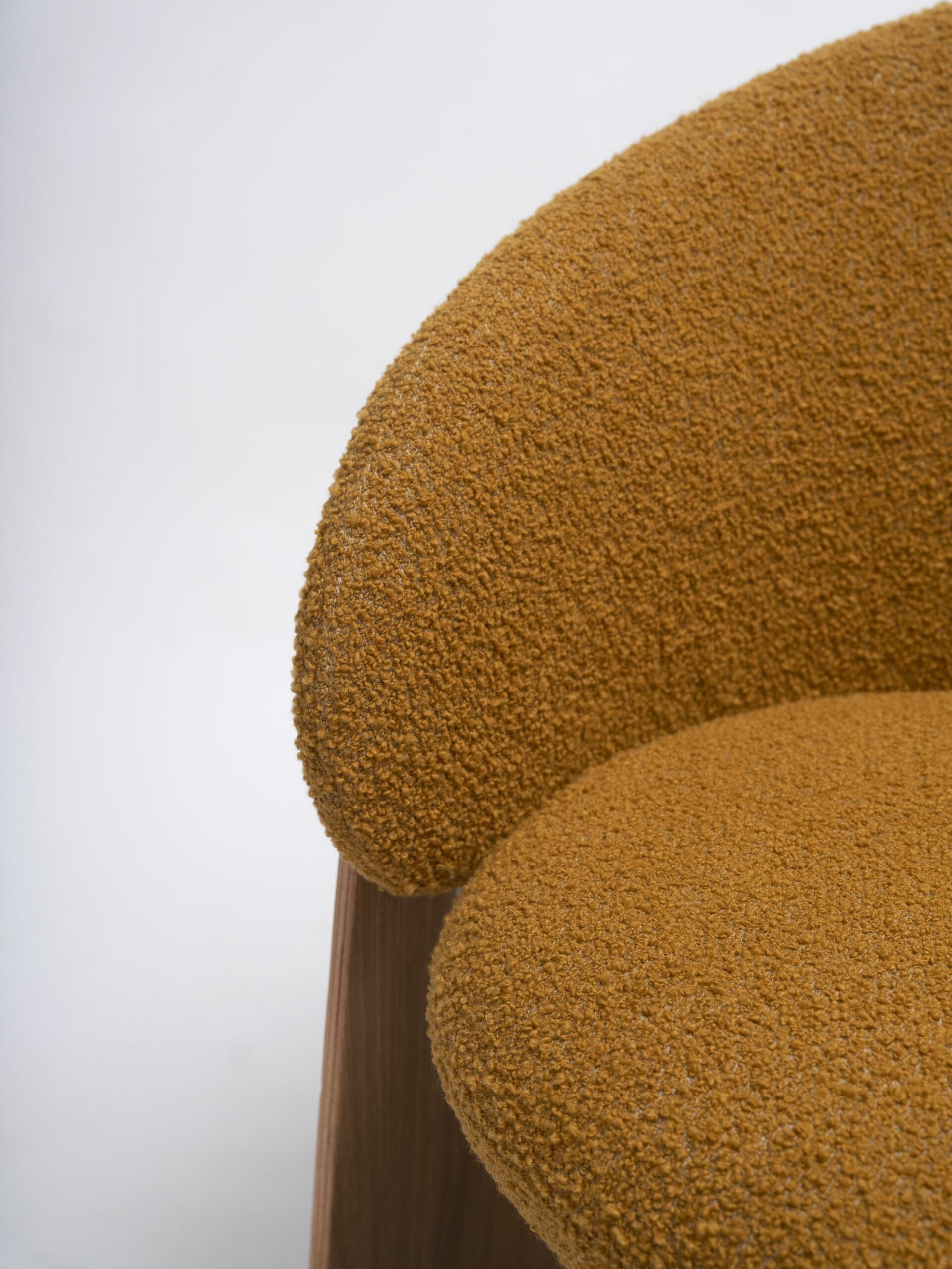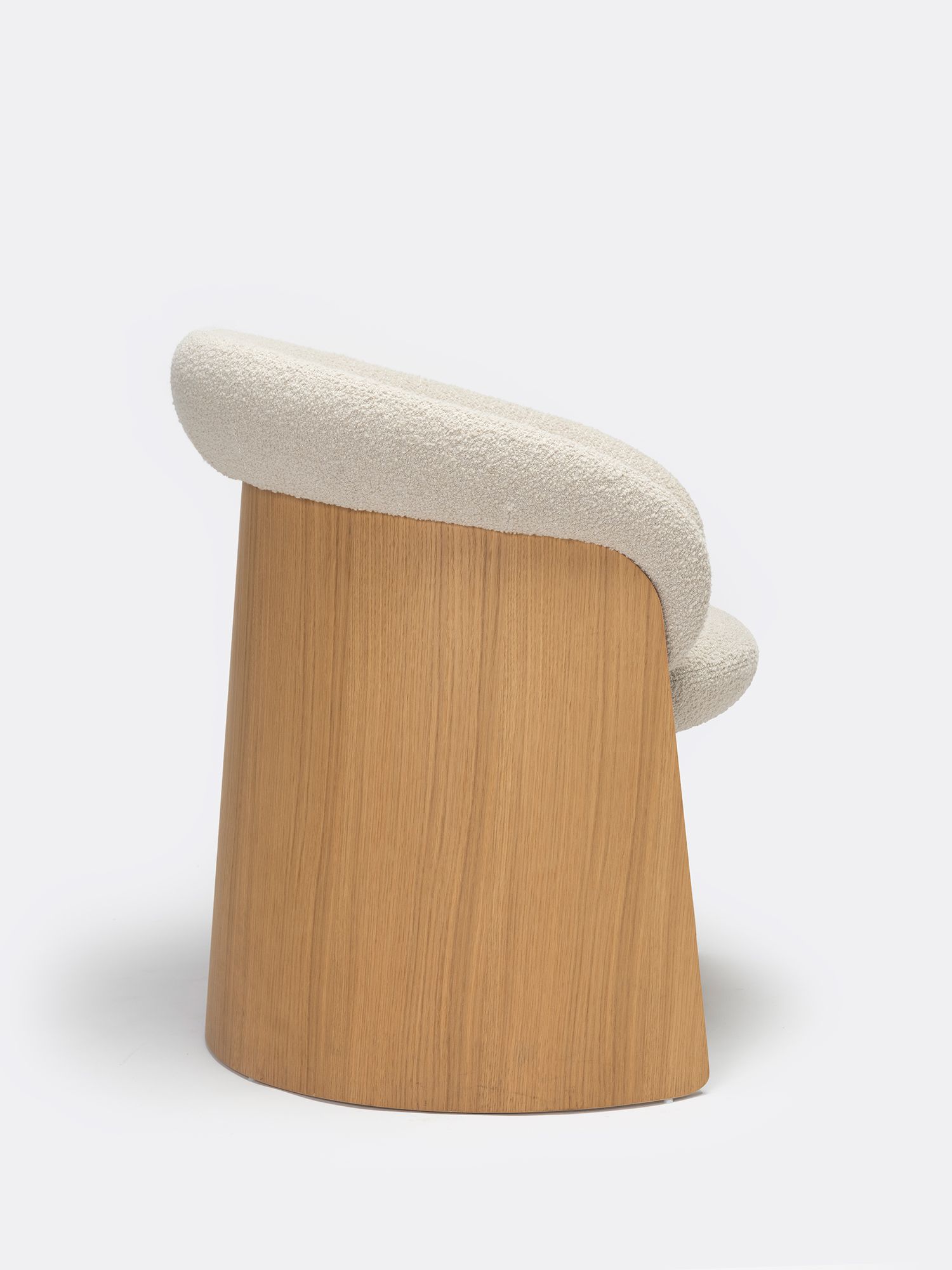 The seat for the Ginger chair, with its soft and rounded shapes, can rest on three different base typologies; a four-leg structure, a decorative and organic sled framework, and a wooden collar base. A sculptural design that provides comfort and cosiness.
