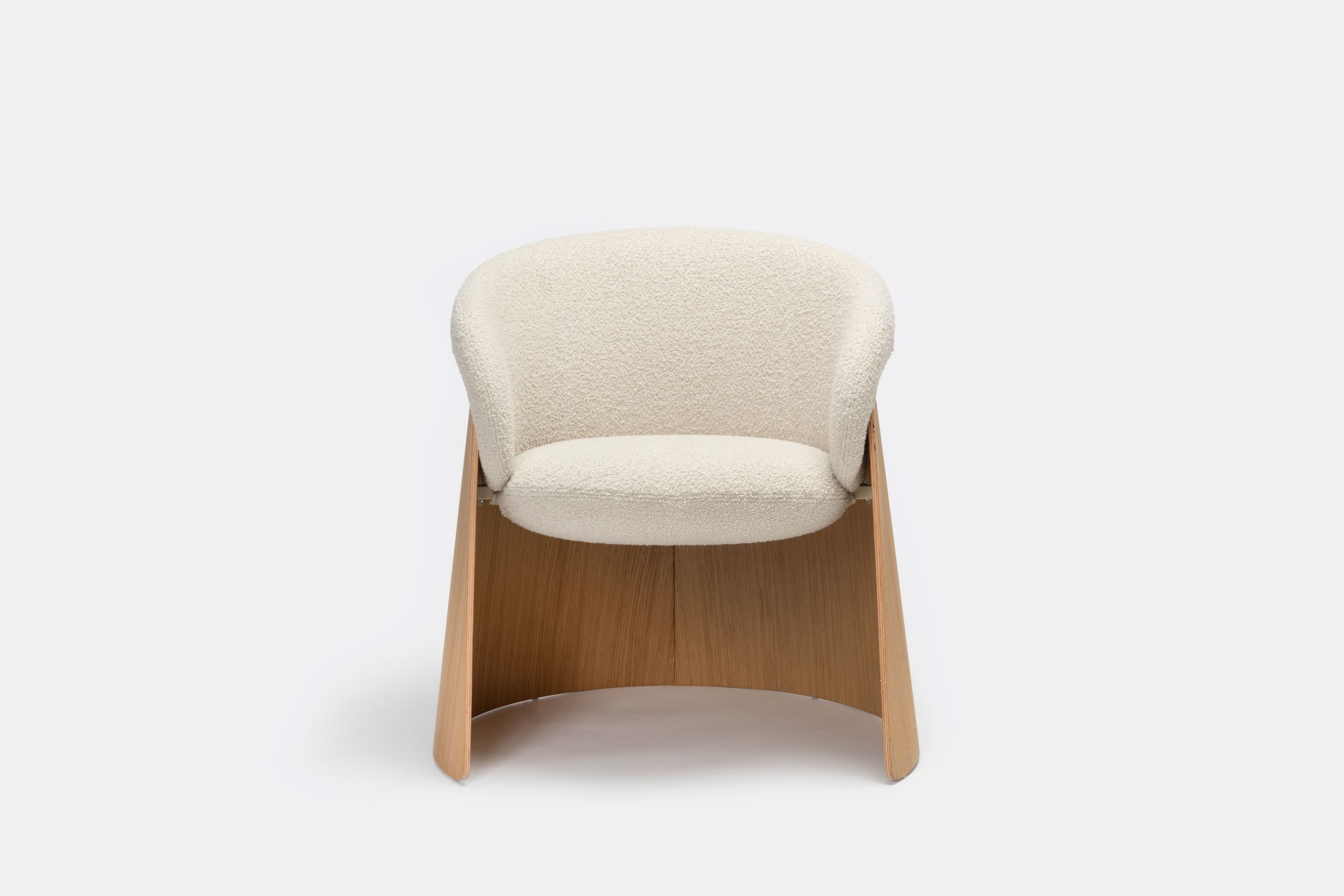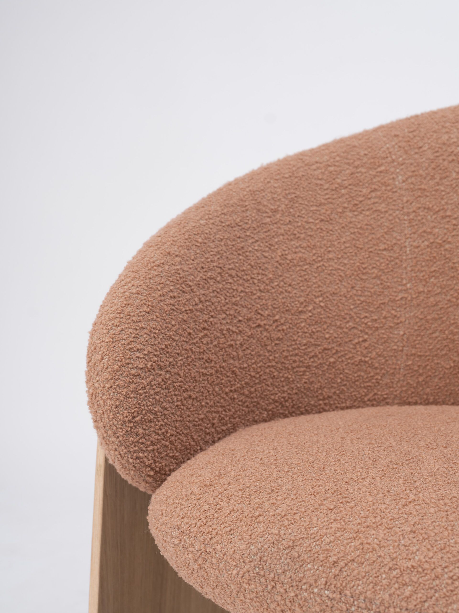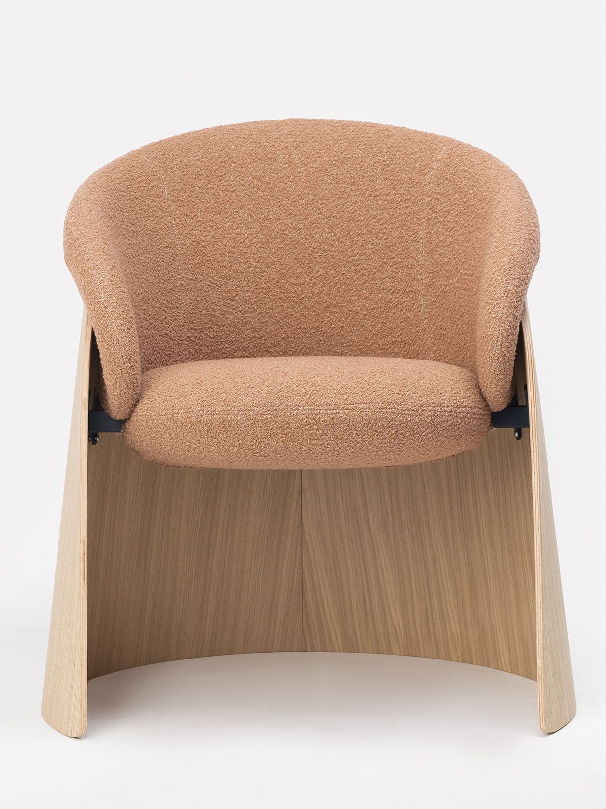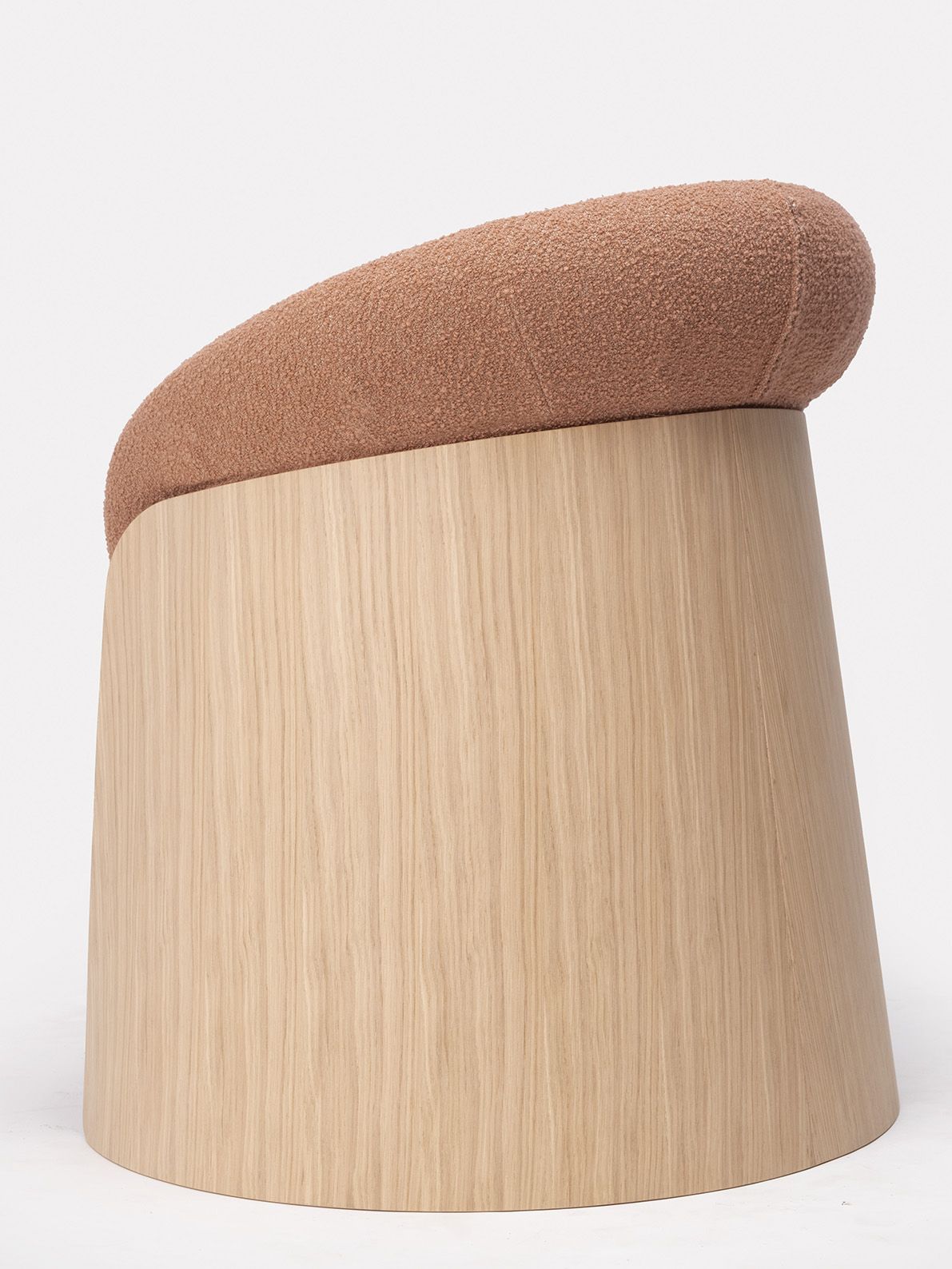 The seat for the Ginger chair, with its soft and rounded shapes, can rest on three different base typologies; a four-leg structure, a decorative and organic sled framework, and a wooden collar base. A sculptural design that provides comfort and cosiness.