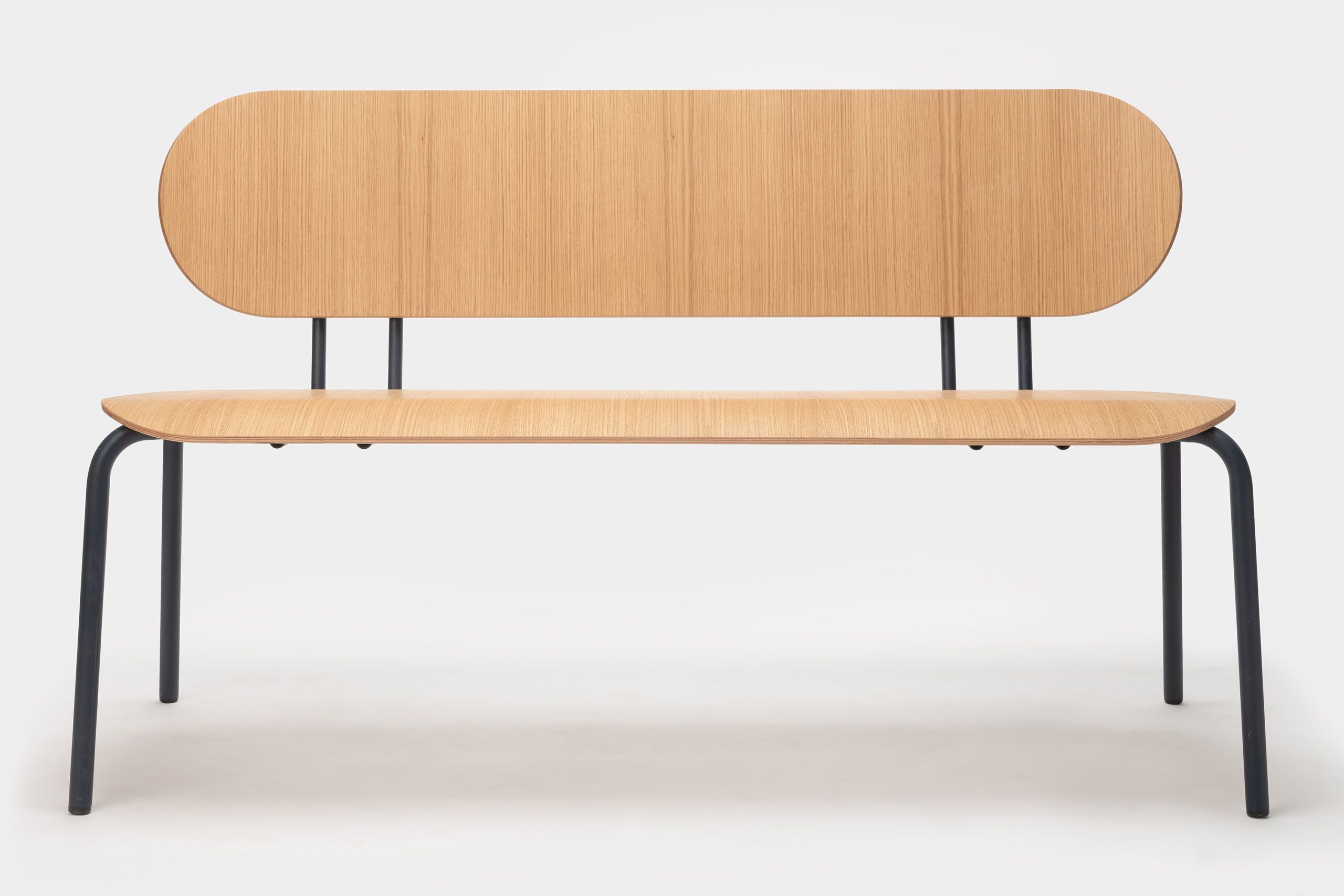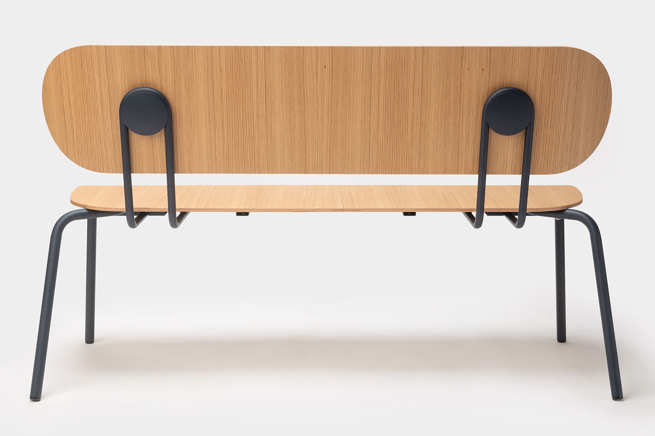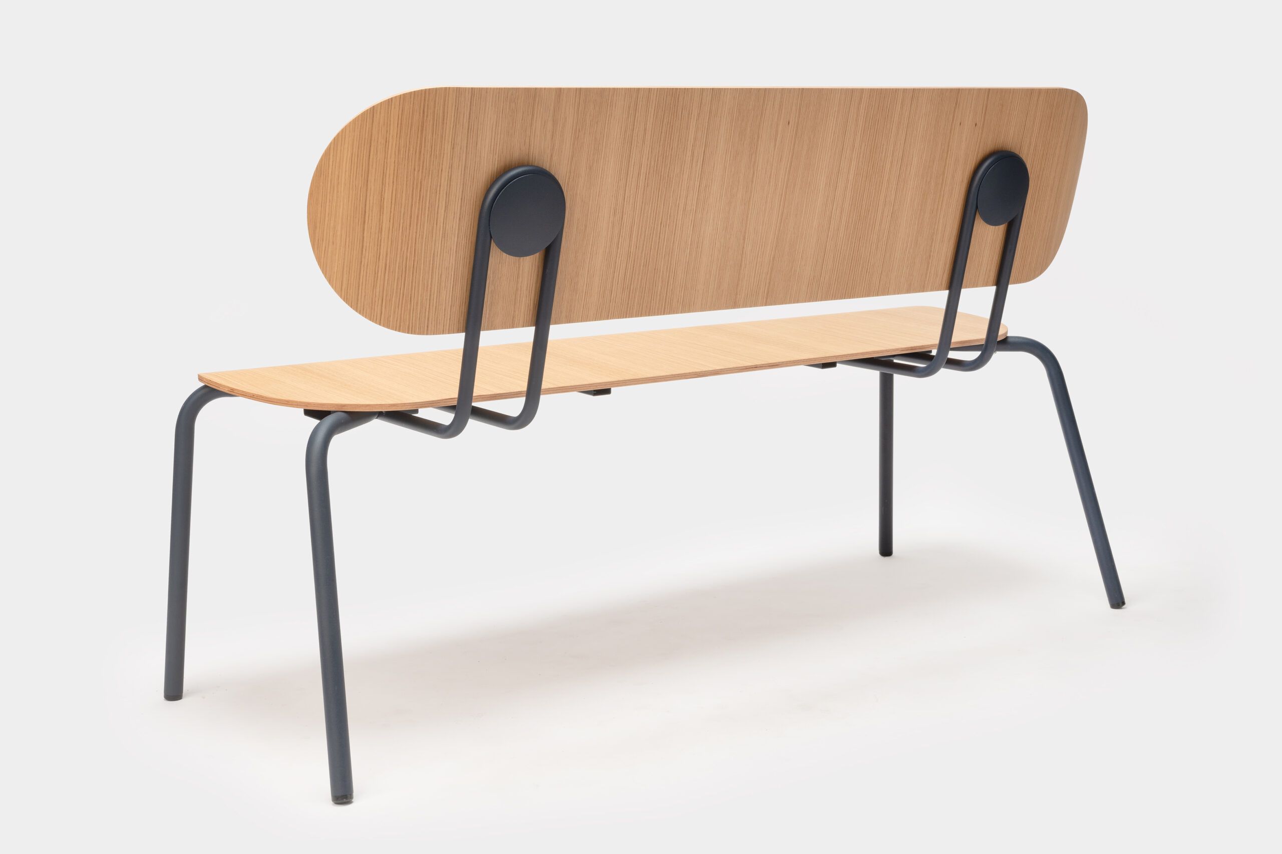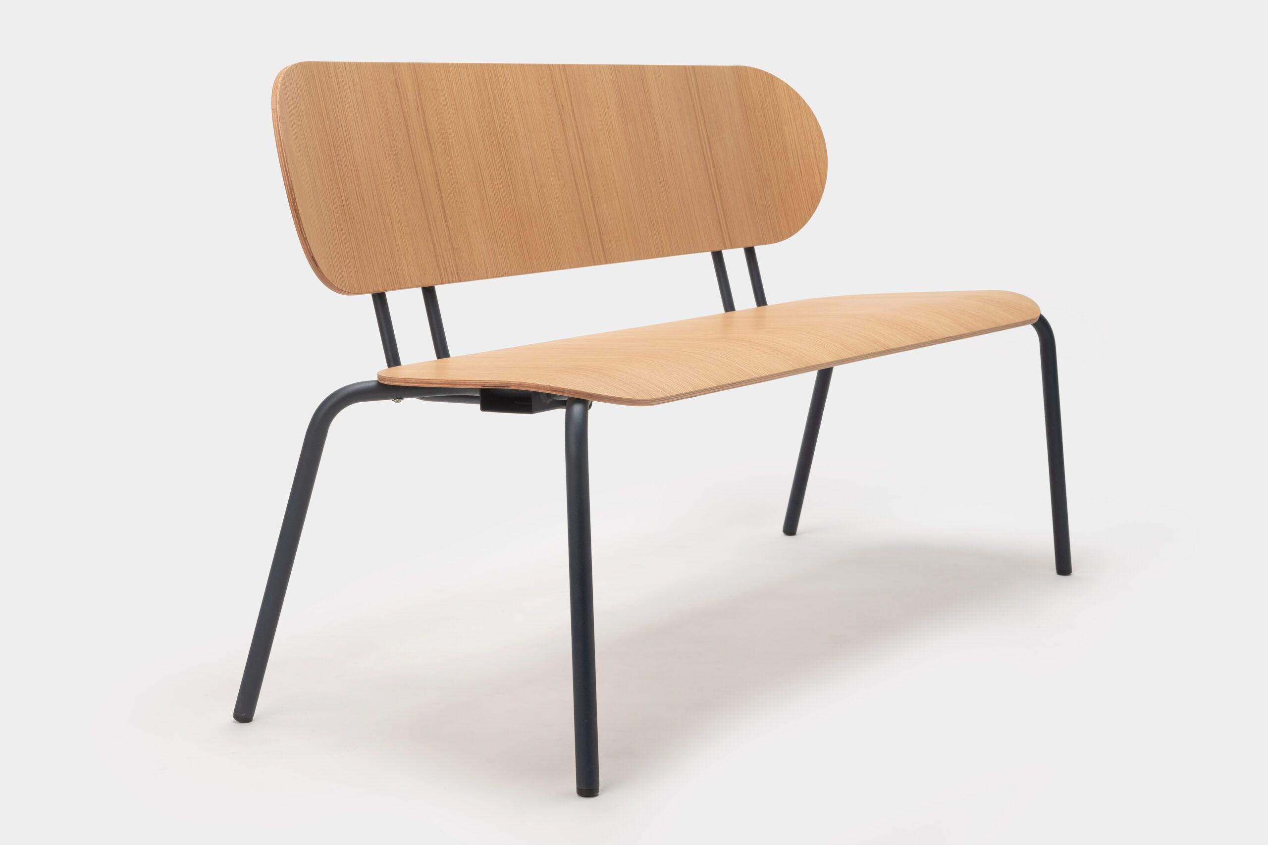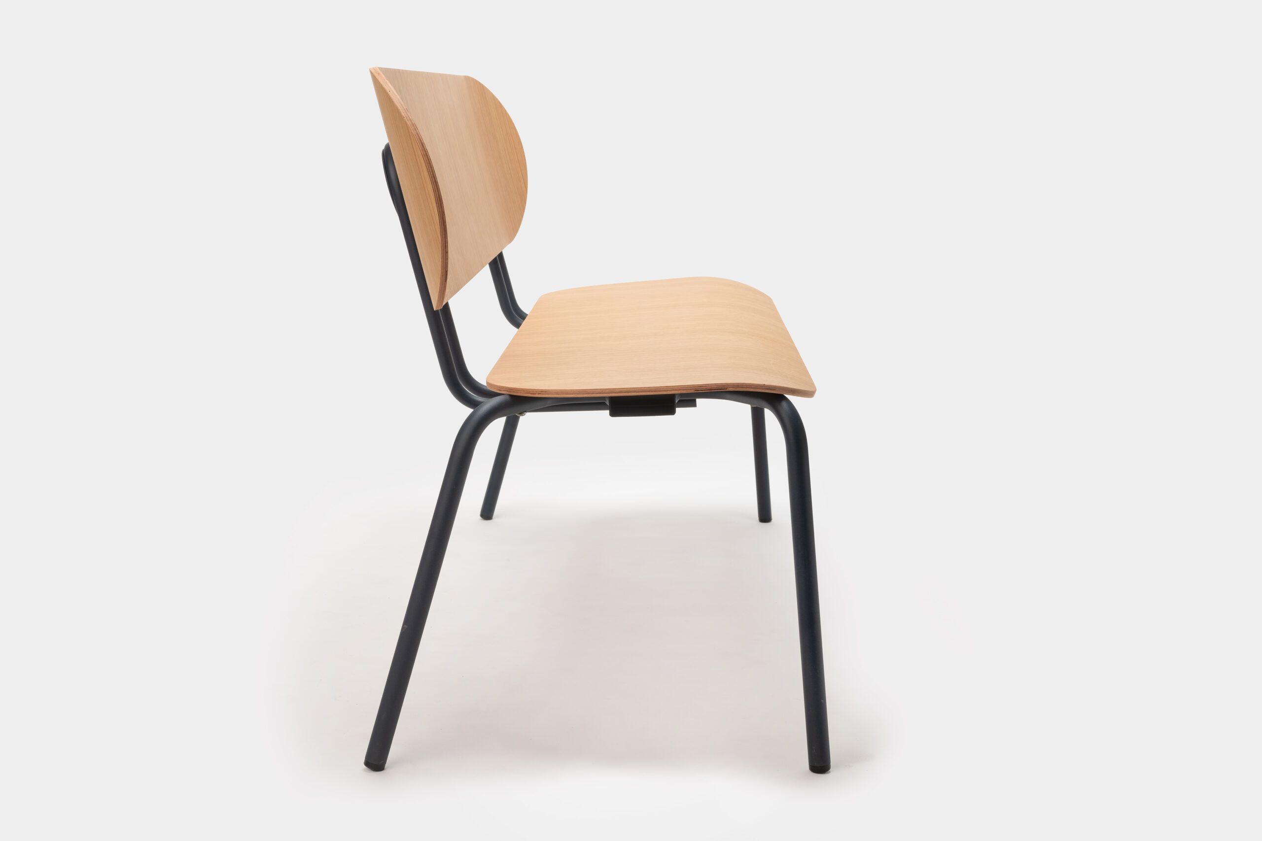 Precision cylindrical tube structure of 25mm for legs, and 18mm diameter for the backrest, and 2mm thick in cold-rolled recycled steel. Finish options for the seat and backrest include oak and upholstery. For more information, consult the technical sheet.