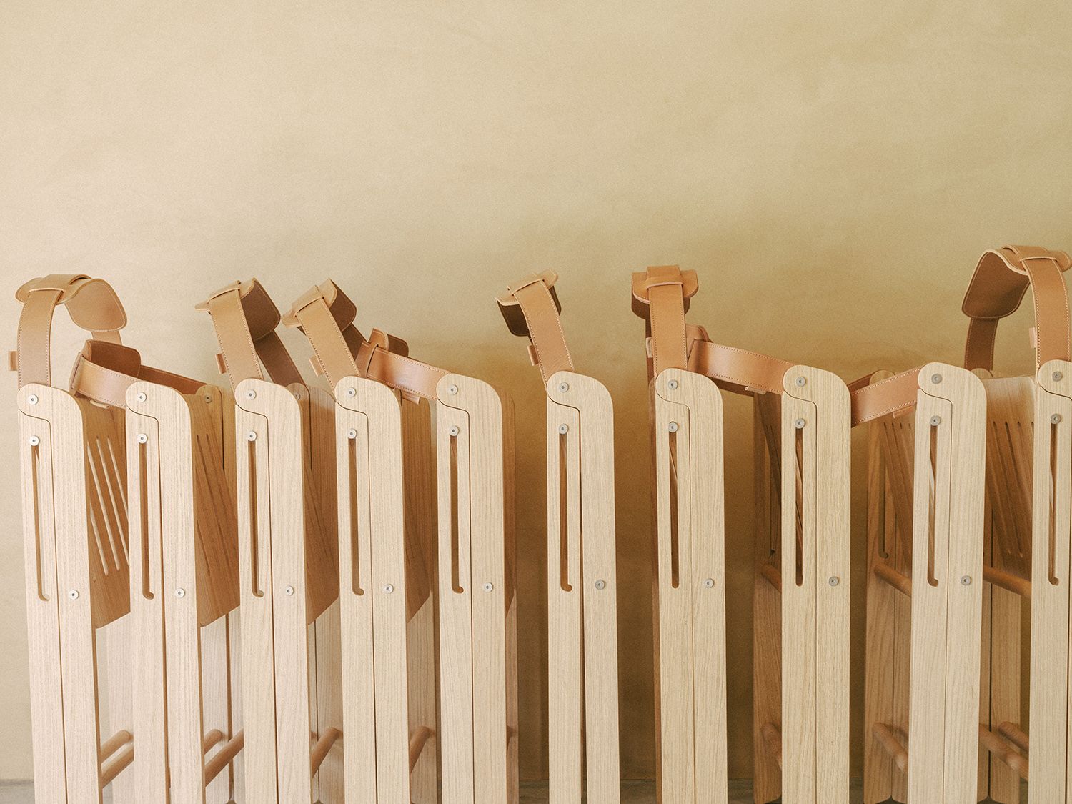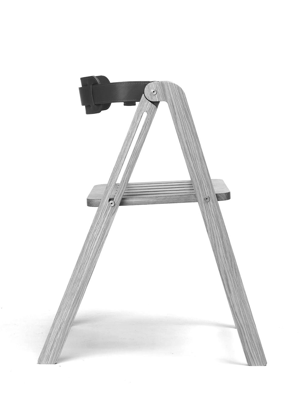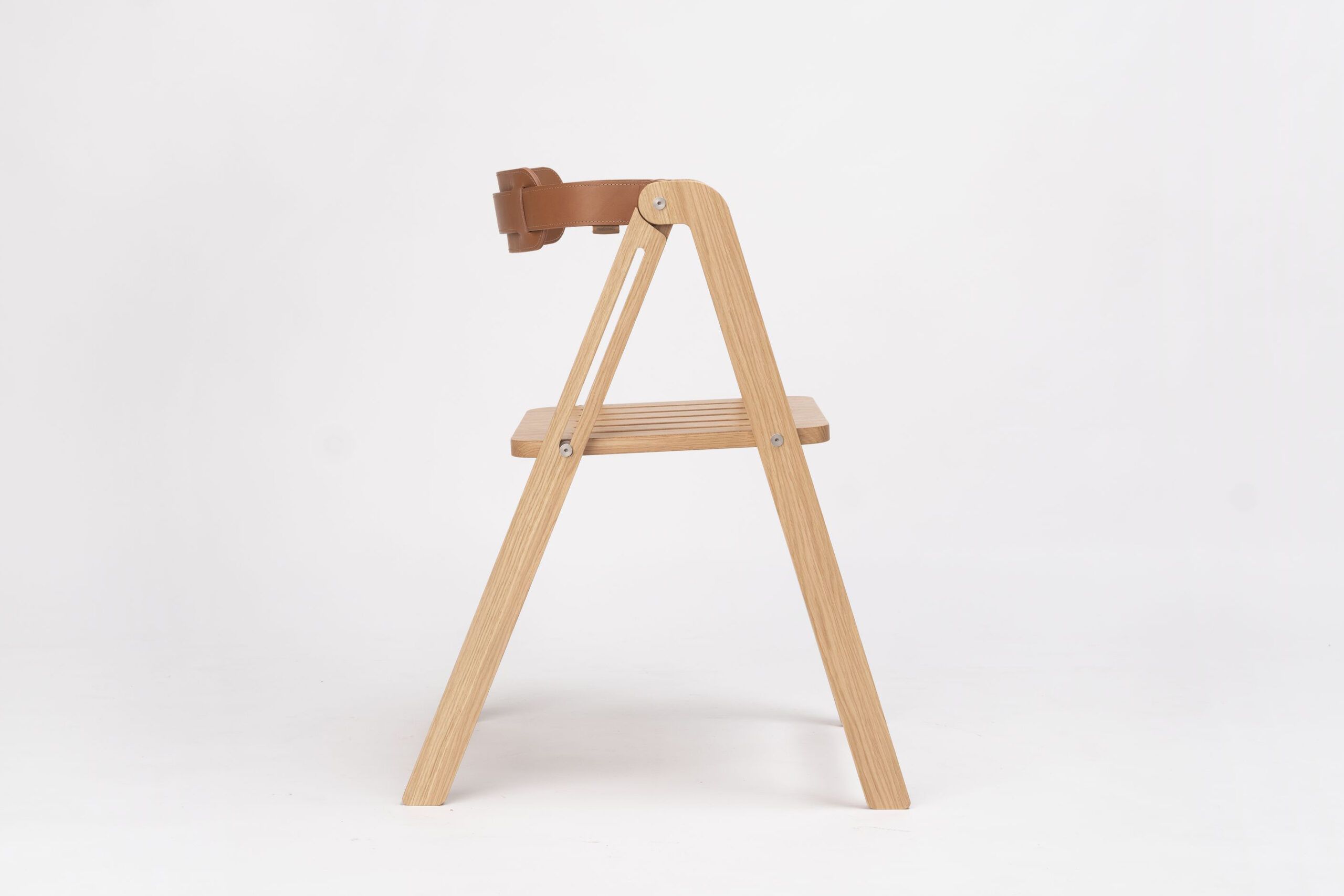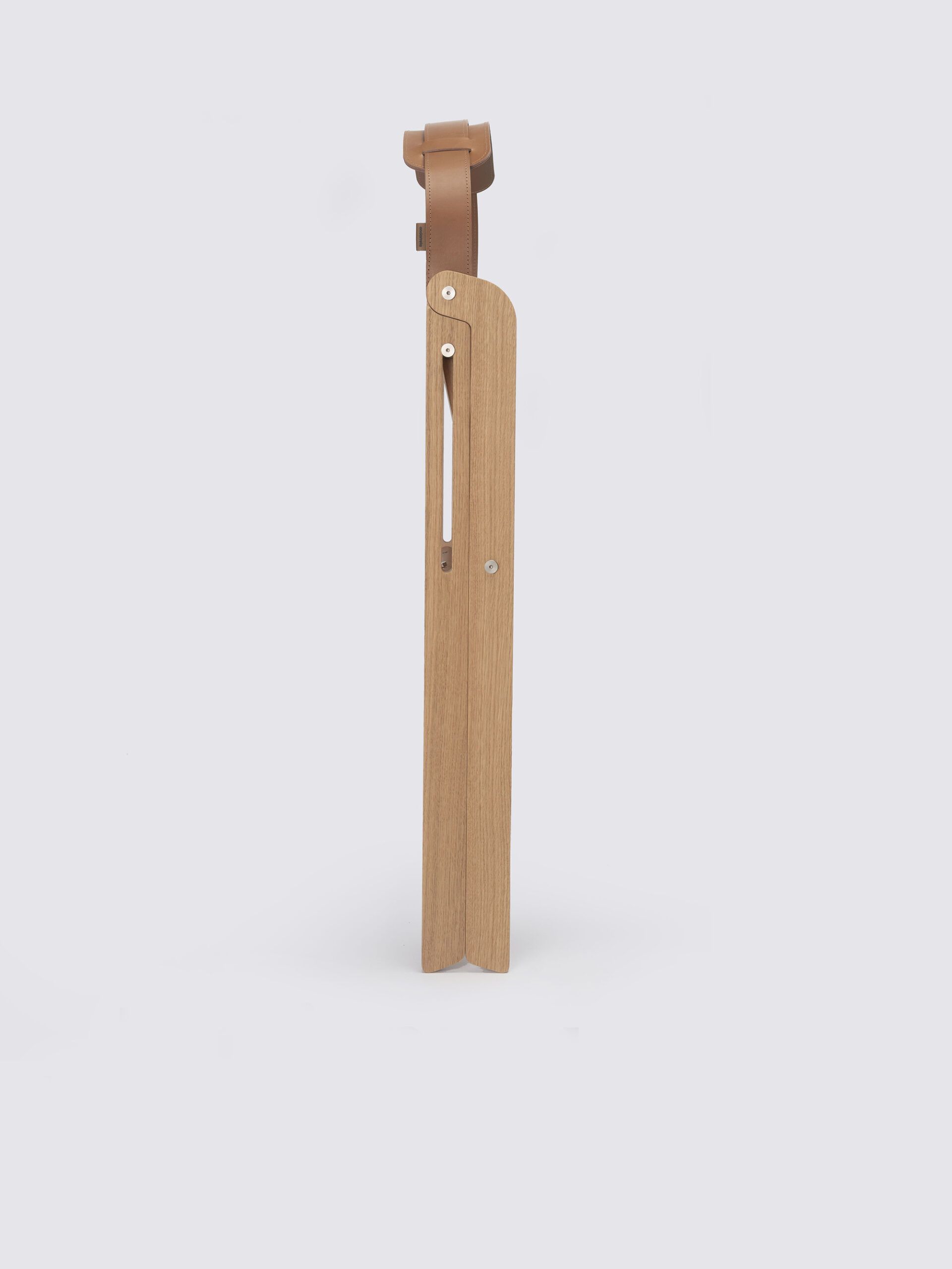 Structure and seat made of oak slats with two oak veneers arranged with alternating fiber orientation to enhance strength and optimize finish. Handcrafted leather strap for support.
