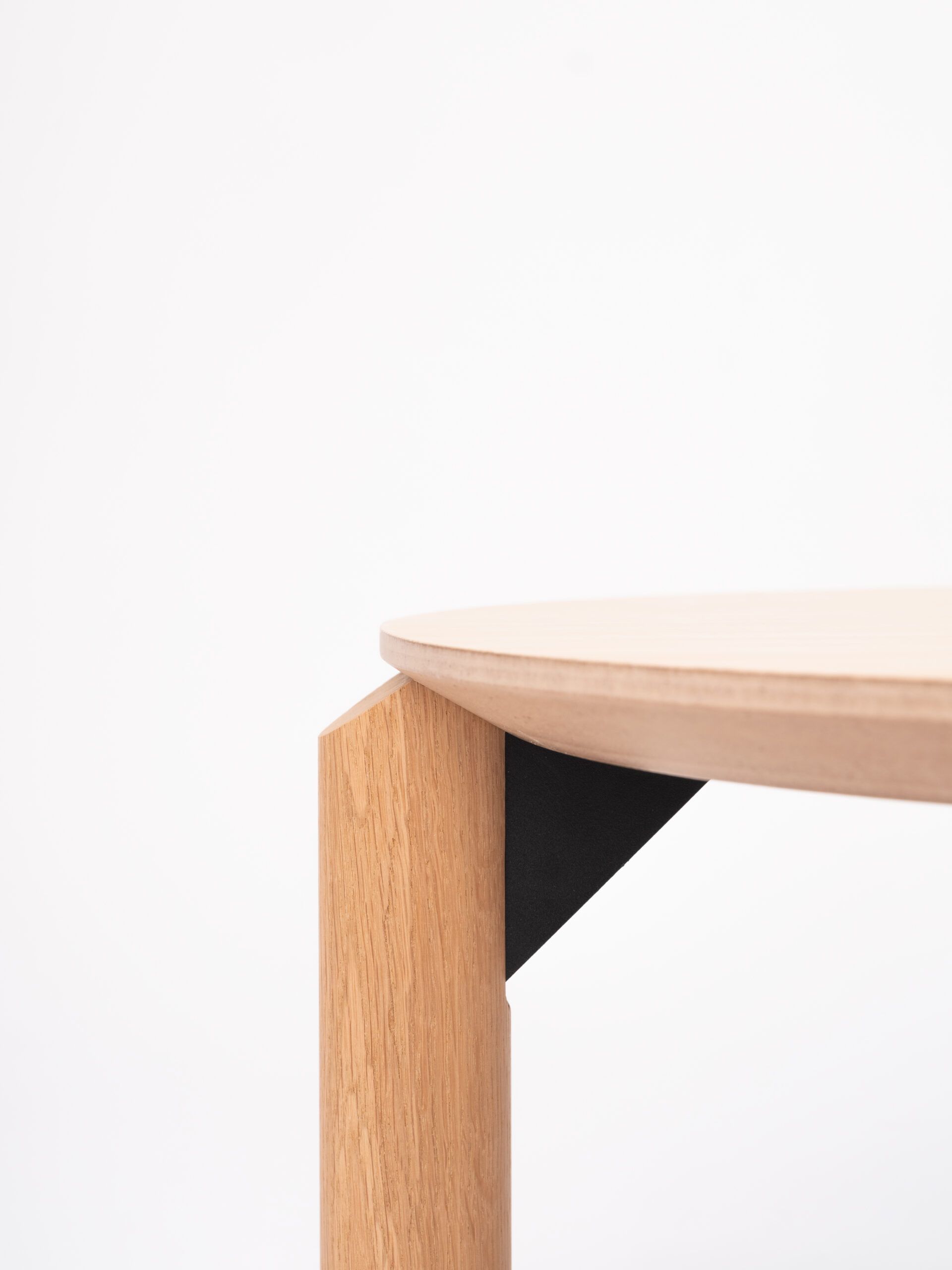 The legs are entirely made of solid oak wood with a diameter of 50 mm. Finish options for the seat include oak + MDF, laminate + MDF, Arpa Fenix + MDF, and cushion-style upholstered seat. For more information, consult the technical sheet.