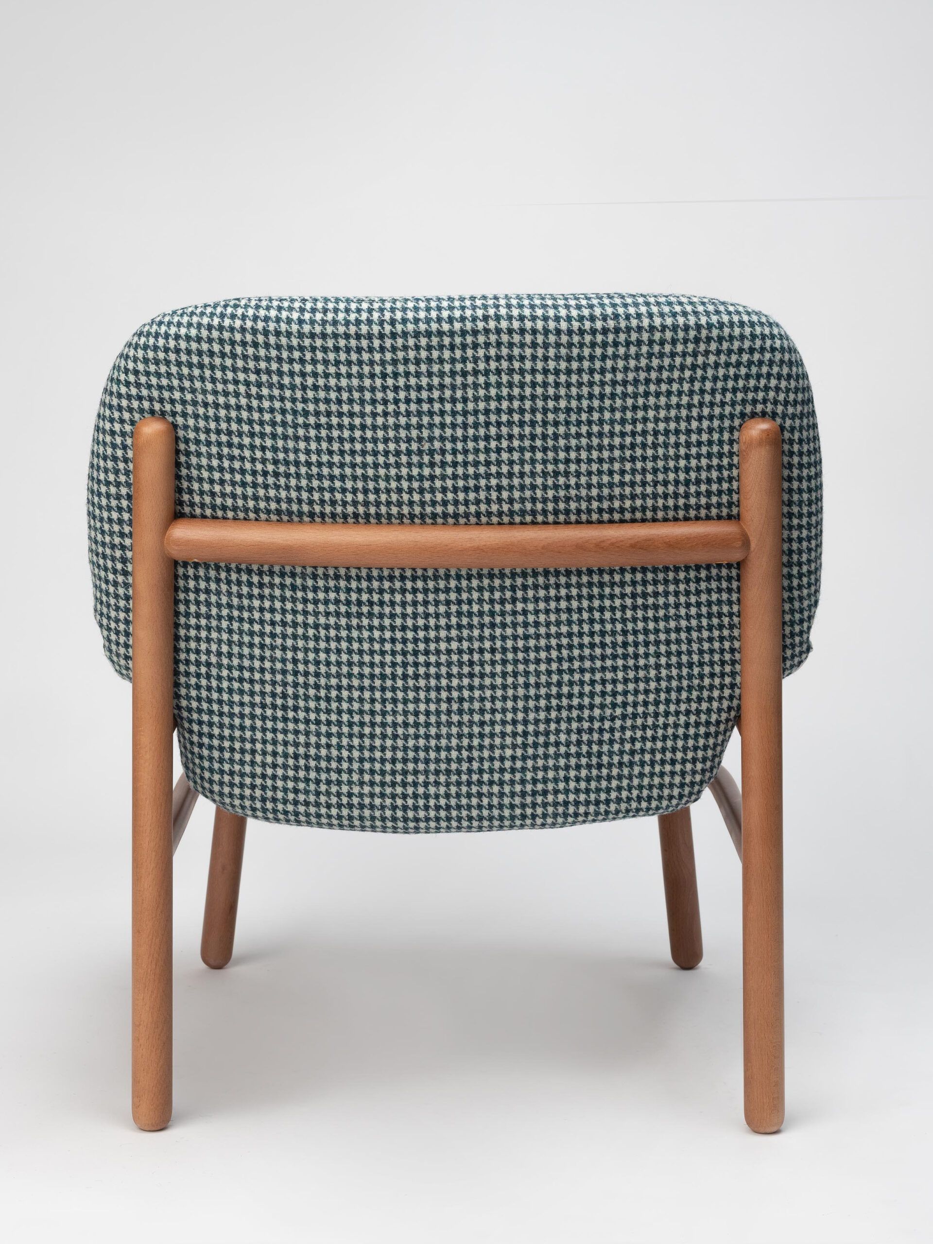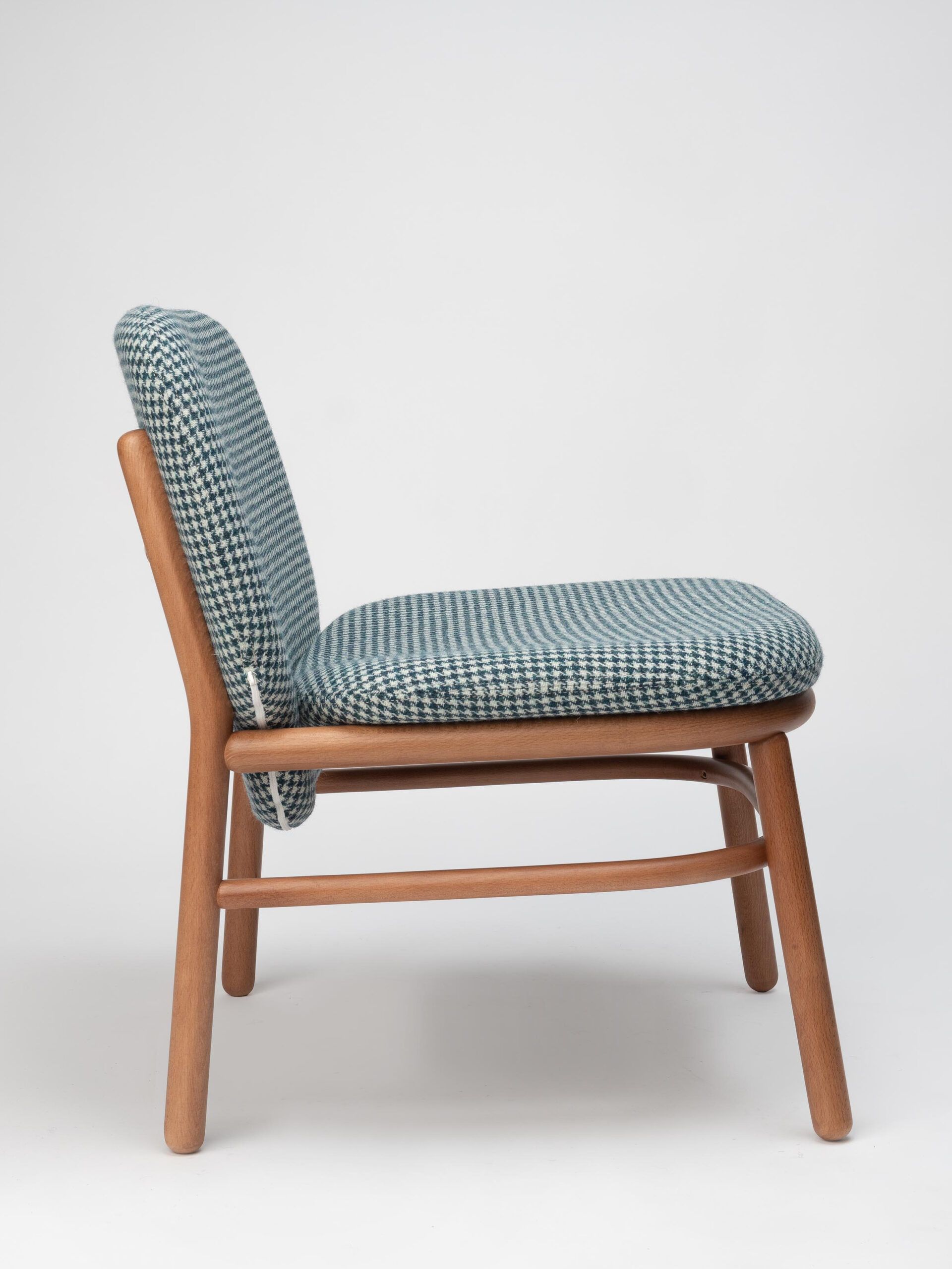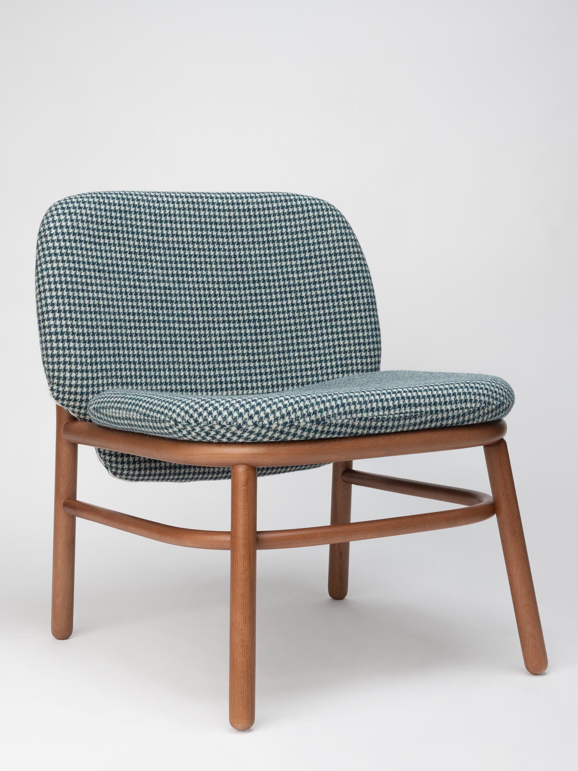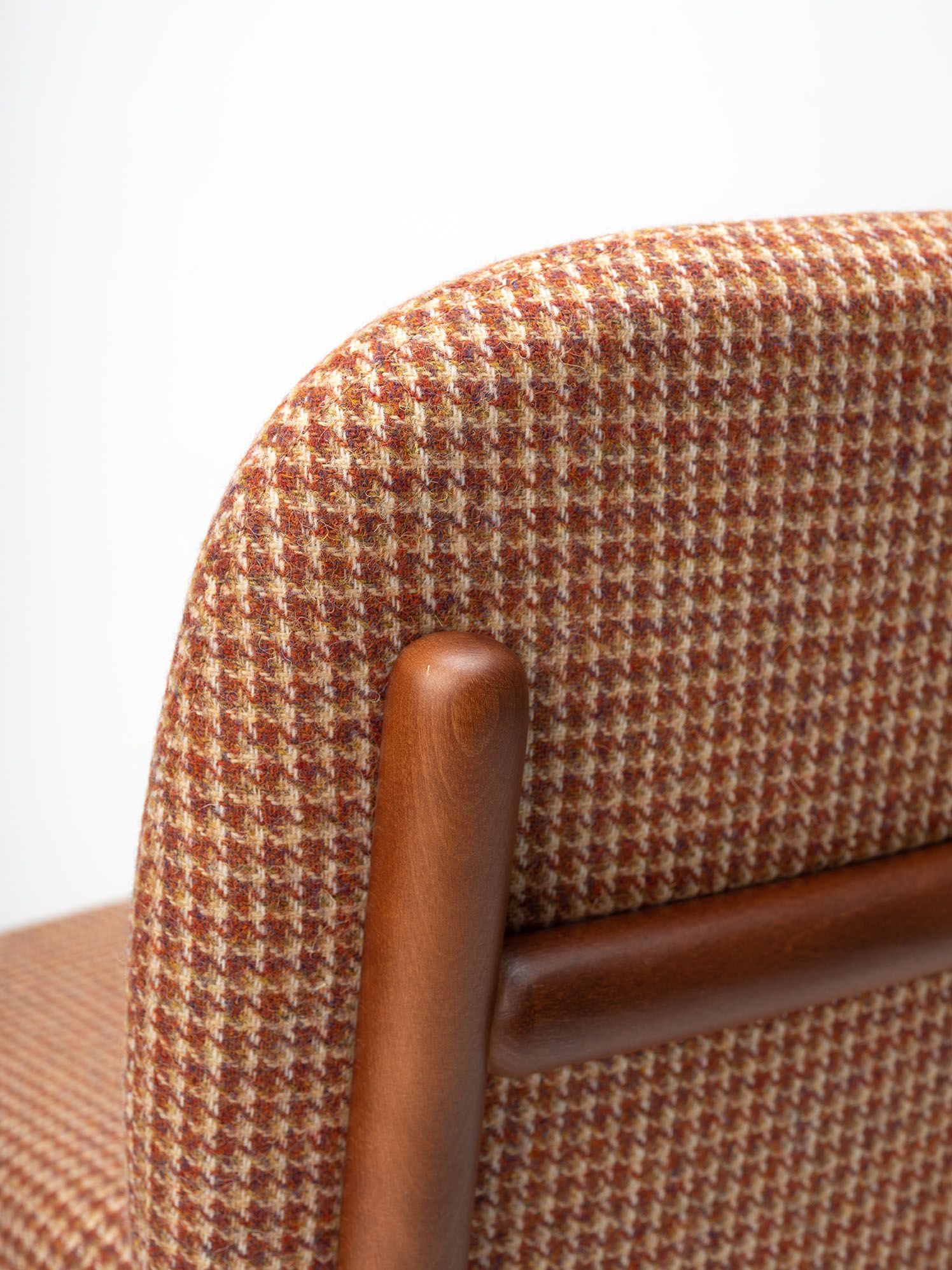 Lana wood easychair, draws on the tradition of curved solid wood, creating soft and smooth edges. A chair, with high or low back and endless combinations of upholsteries. This product is now available in 11 iconic Harris Tweed fabrics, a hand-made material crafted from virgin wool and natural inks, produced exclusively on the Harris Island (Scotland).