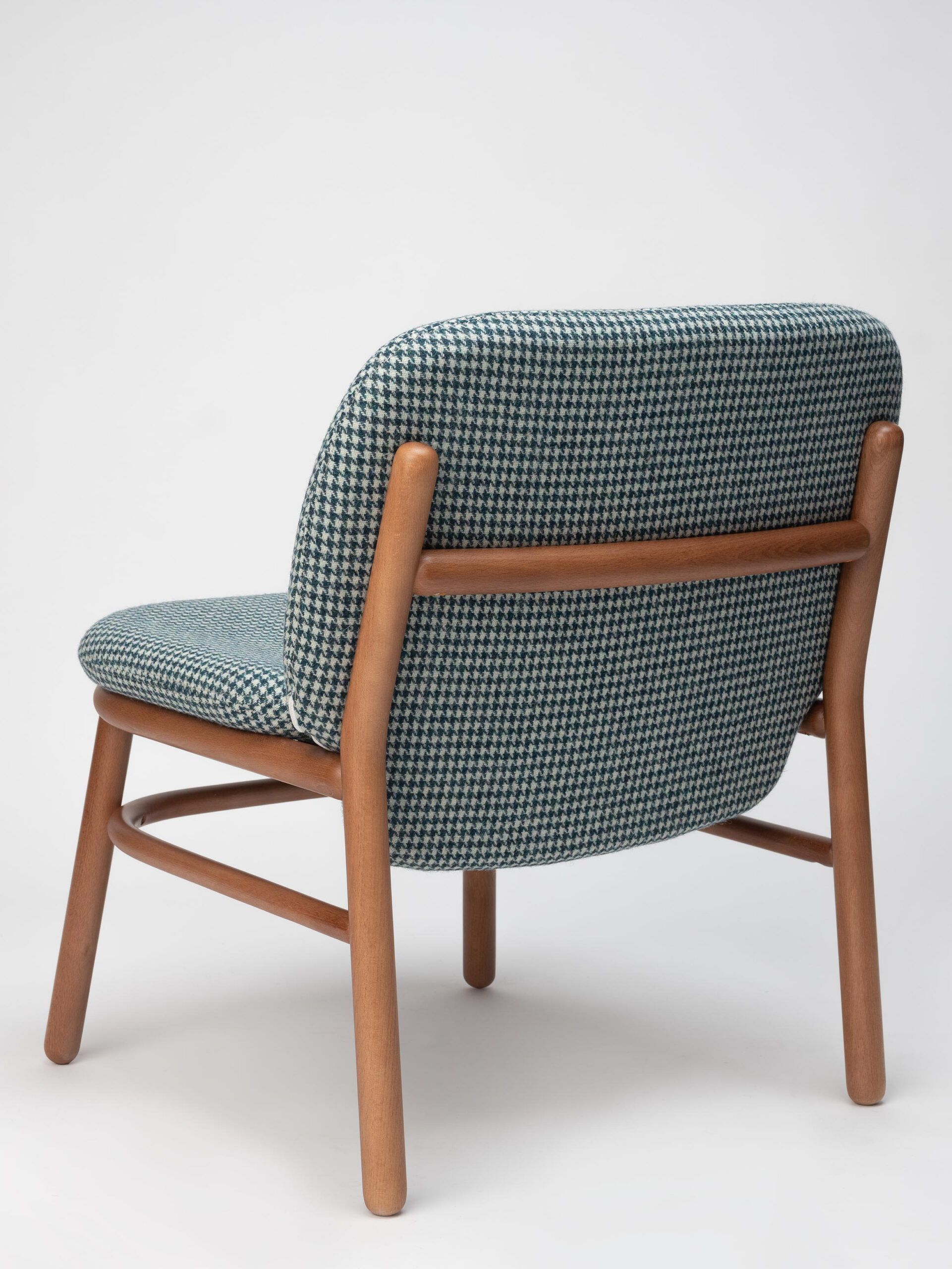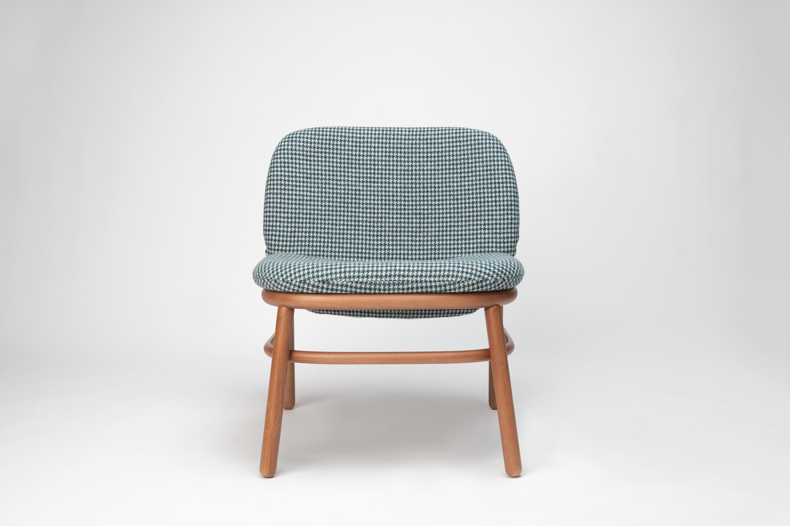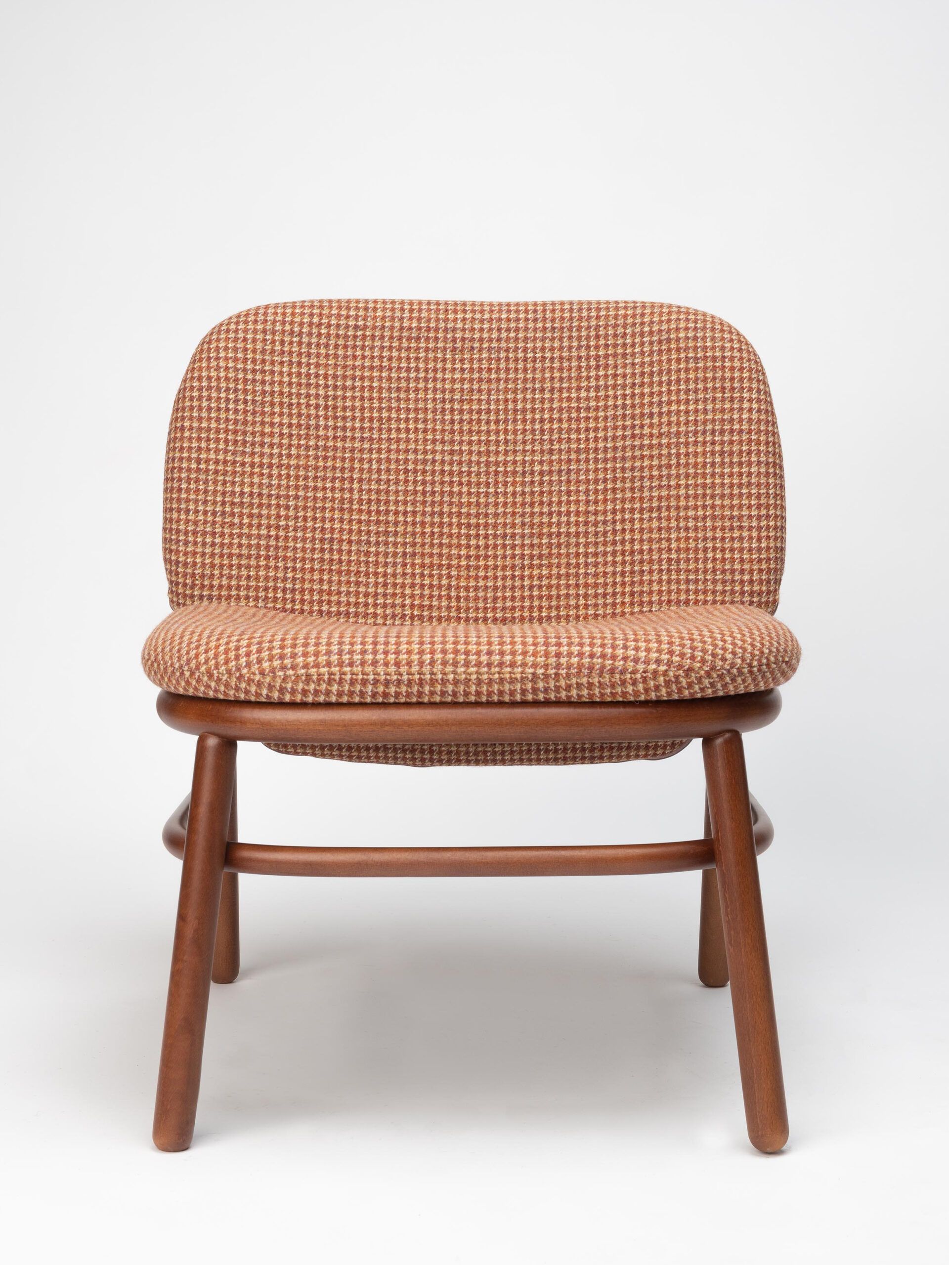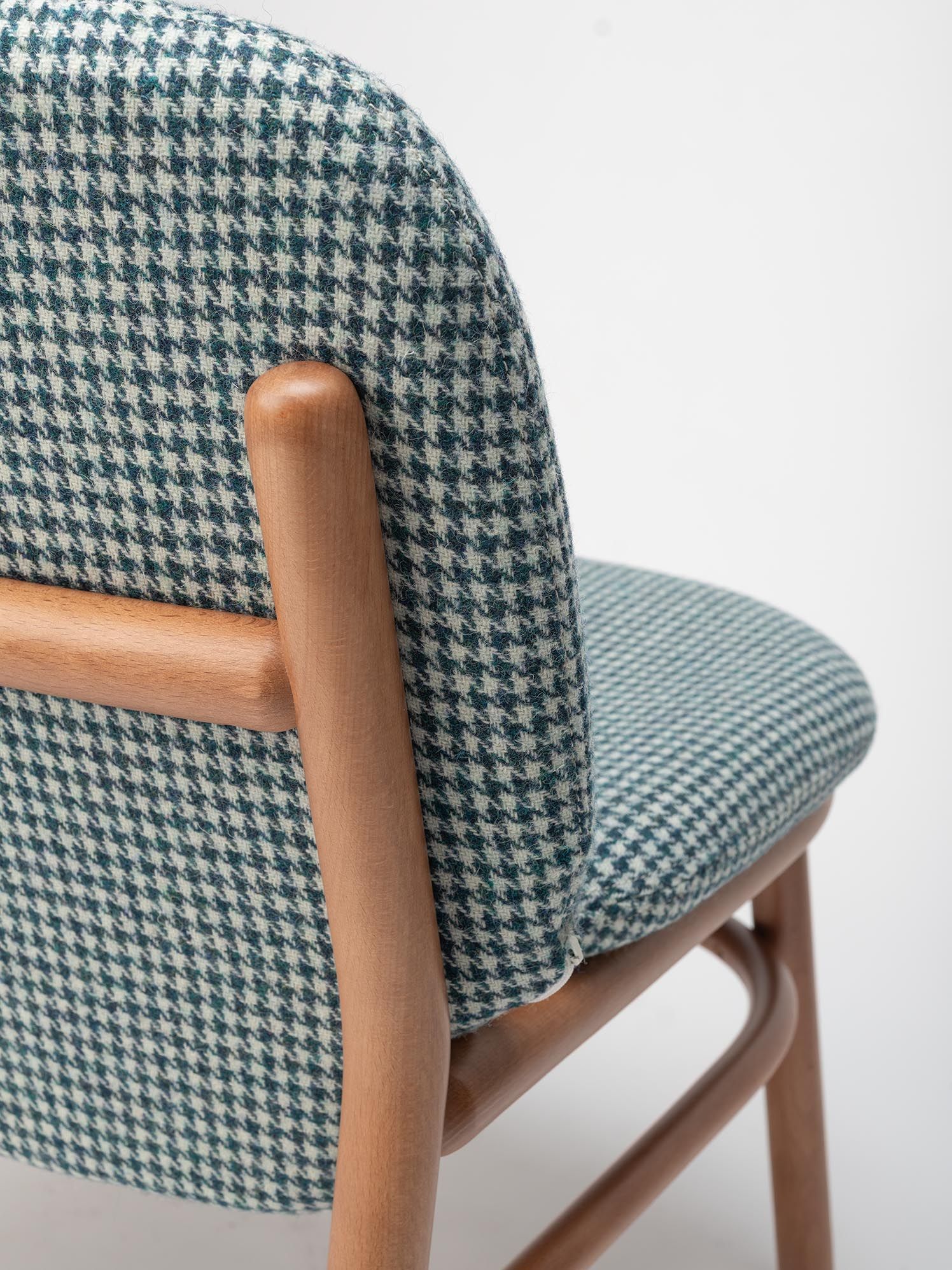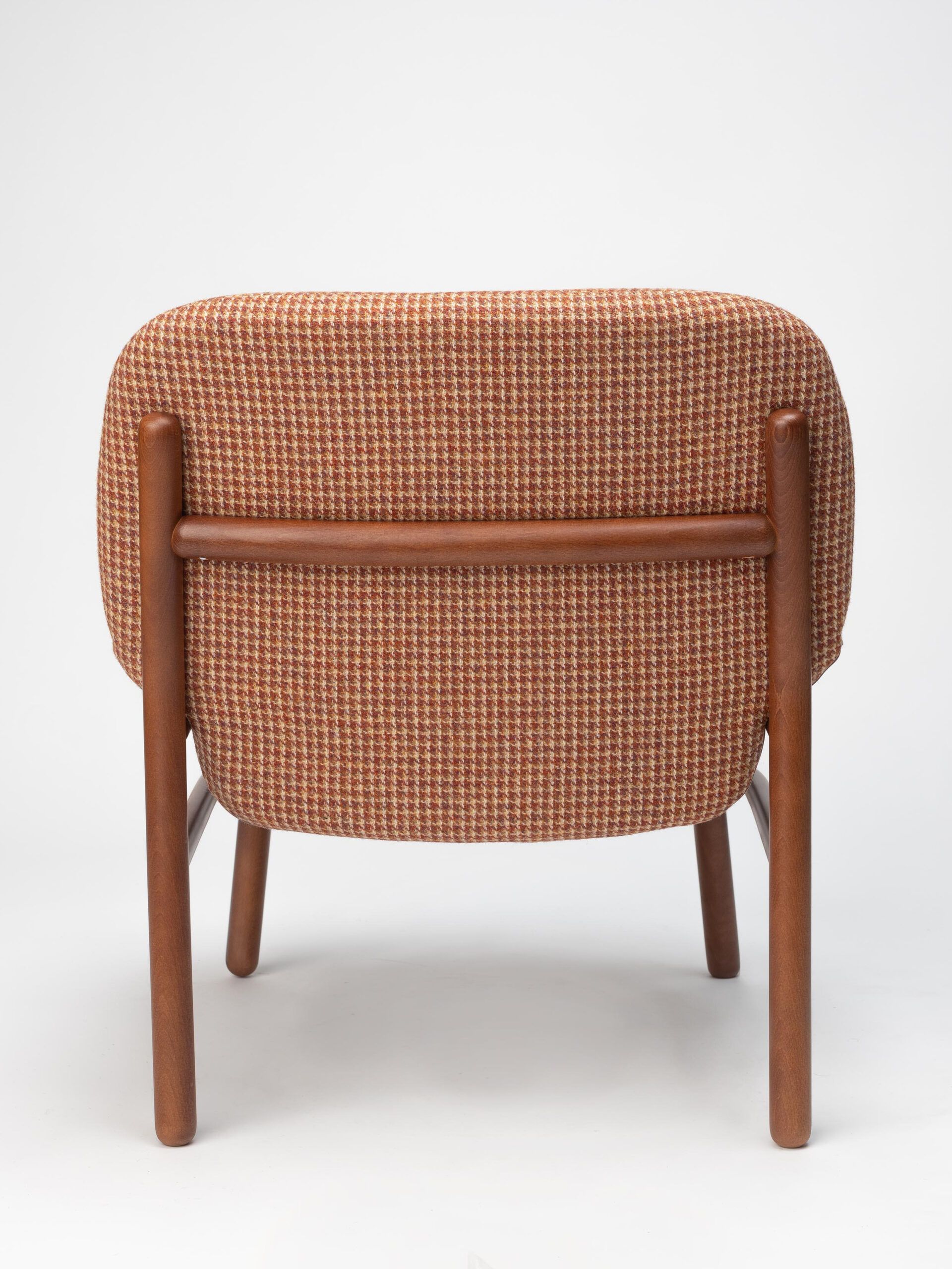Lana wood easychair, draws on the tradition of curved solid wood, creating soft and smooth edges. A chair, with high or low back and endless combinations of upholsteries. This product is now available in 11 iconic Harris Tweed fabrics, a hand-made material crafted from virgin wool and natural inks, produced exclusively on the Harris Island (Scotland).