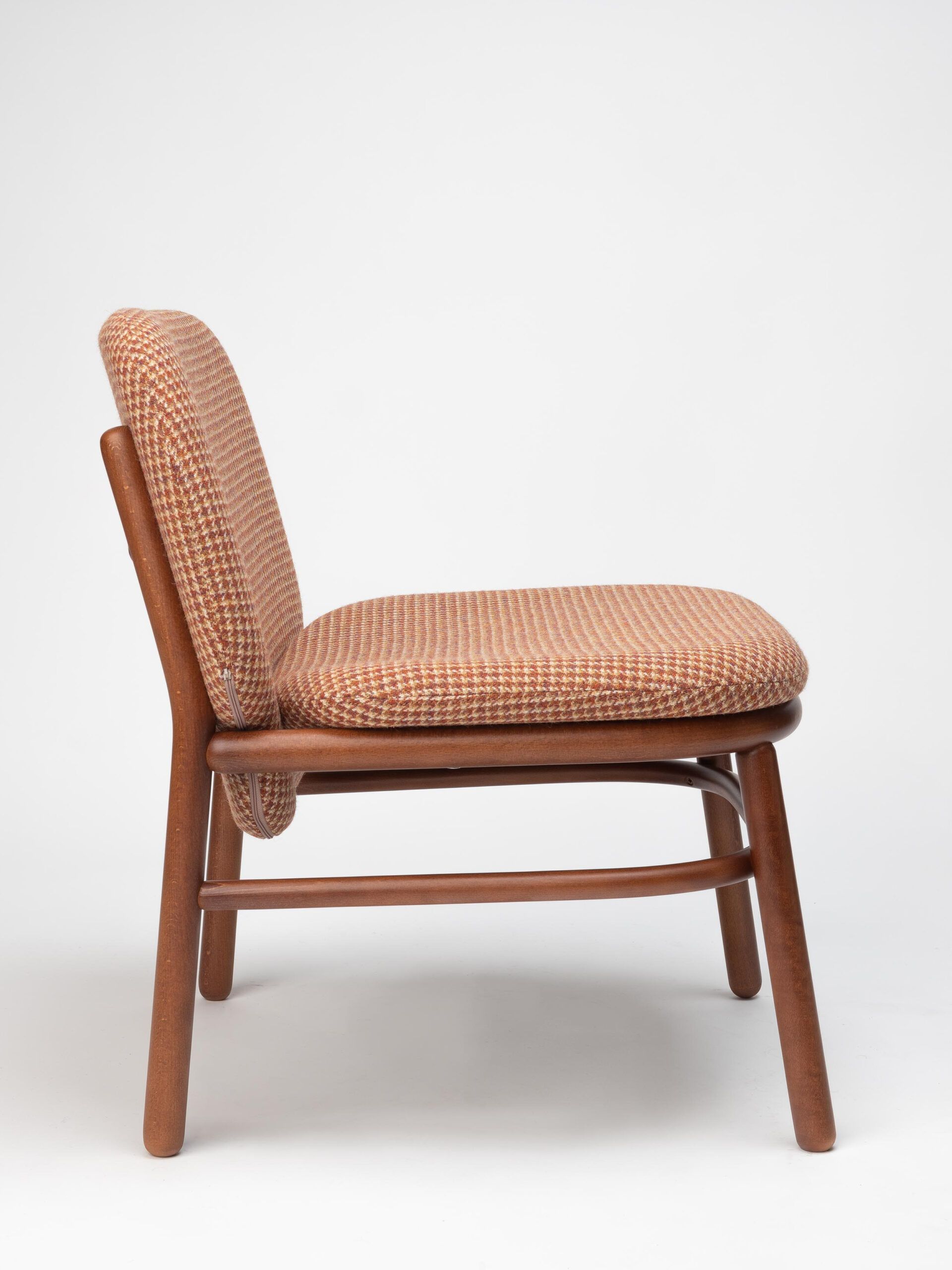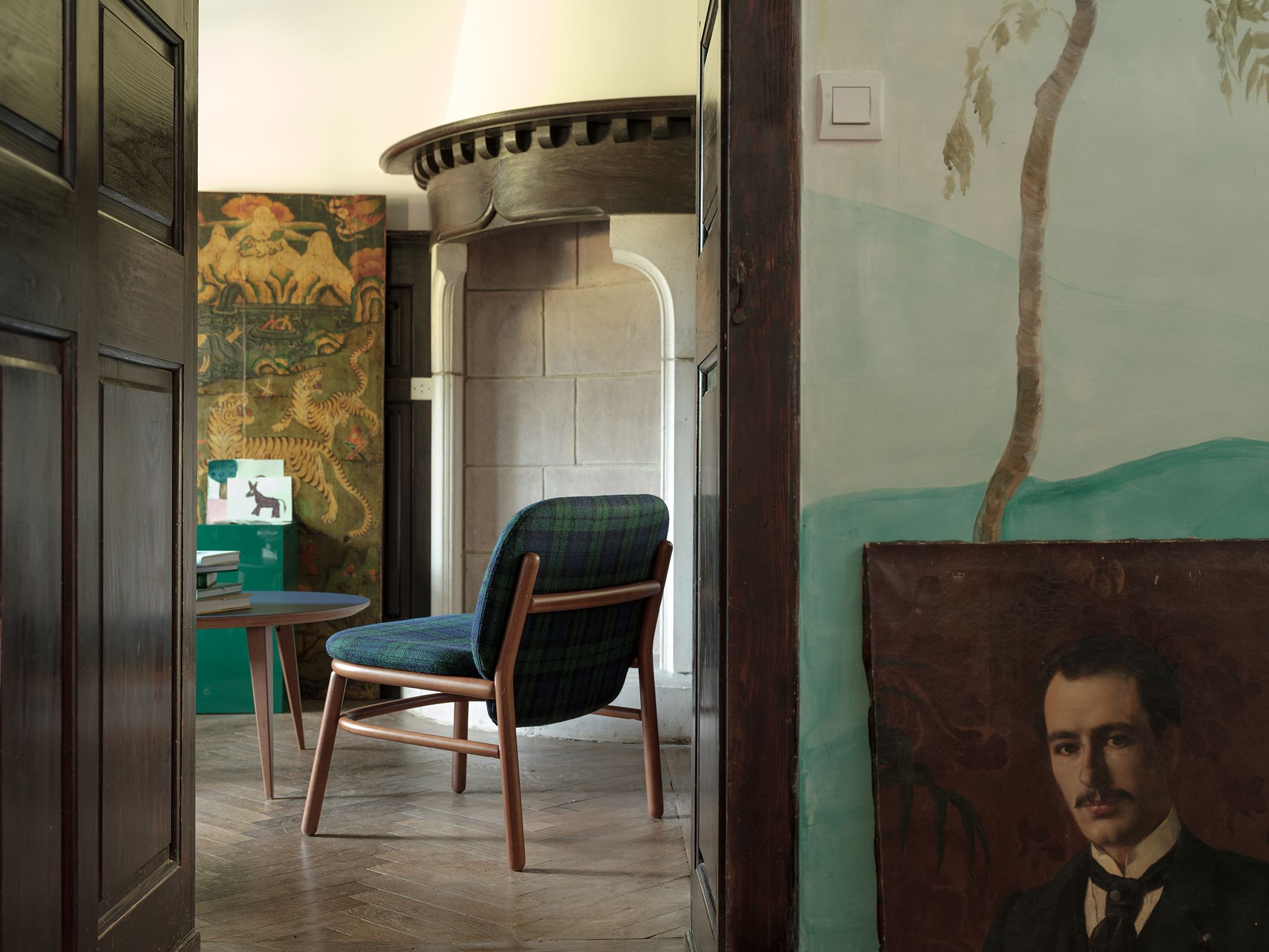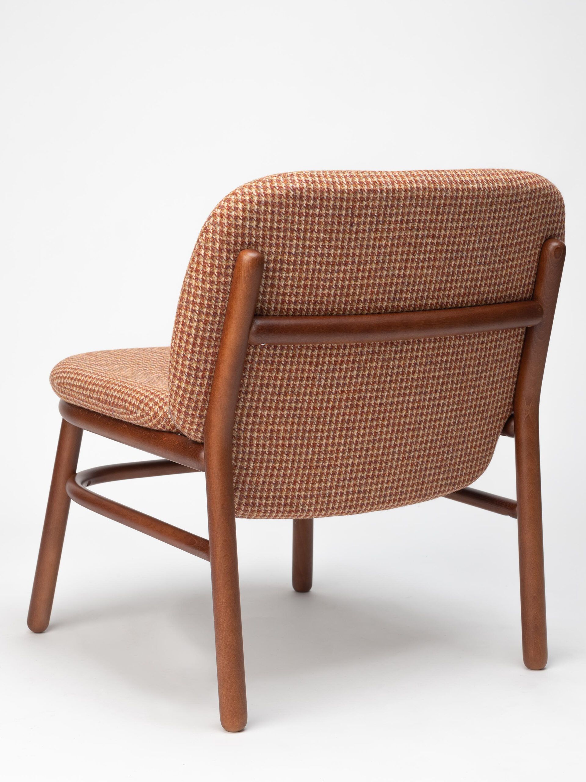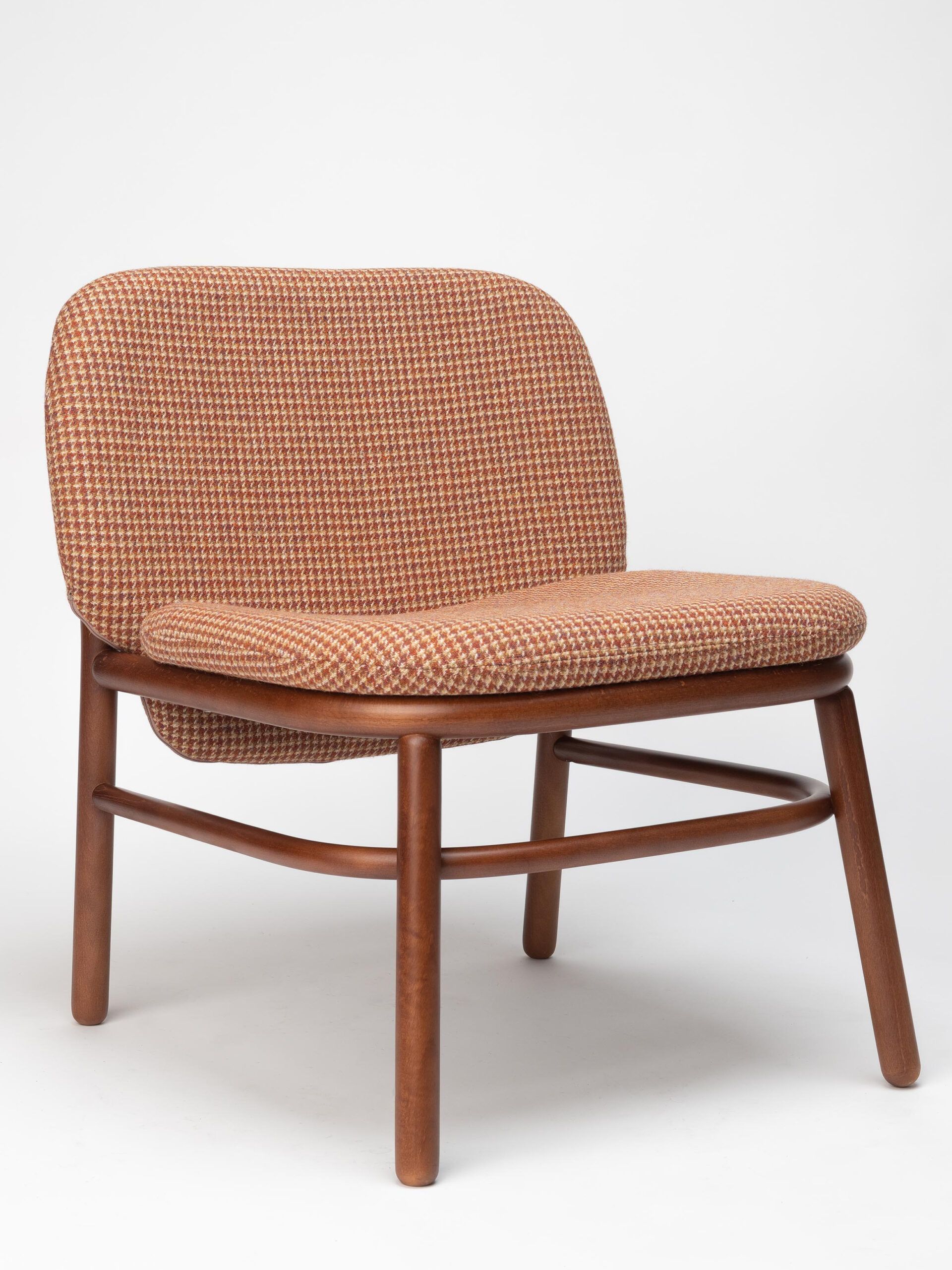 Lana wood easychair, draws on the tradition of curved solid wood, creating soft and smooth edges. A chair, with high or low back and endless combinations of upholsteries. This product is now available in 11 iconic Harris Tweed fabrics, a hand-made material crafted from virgin wool and natural inks, produced exclusively on the Harris Island (Scotland).