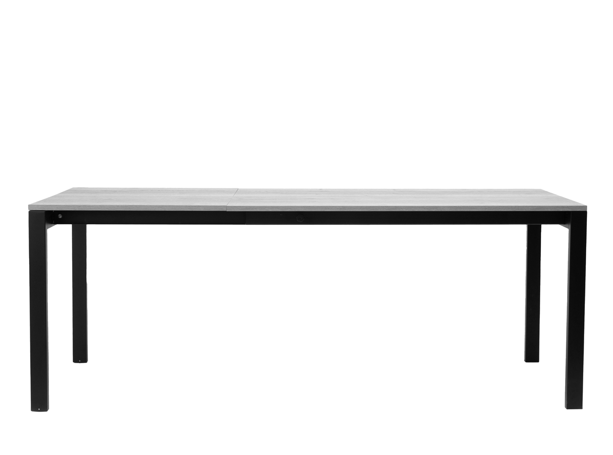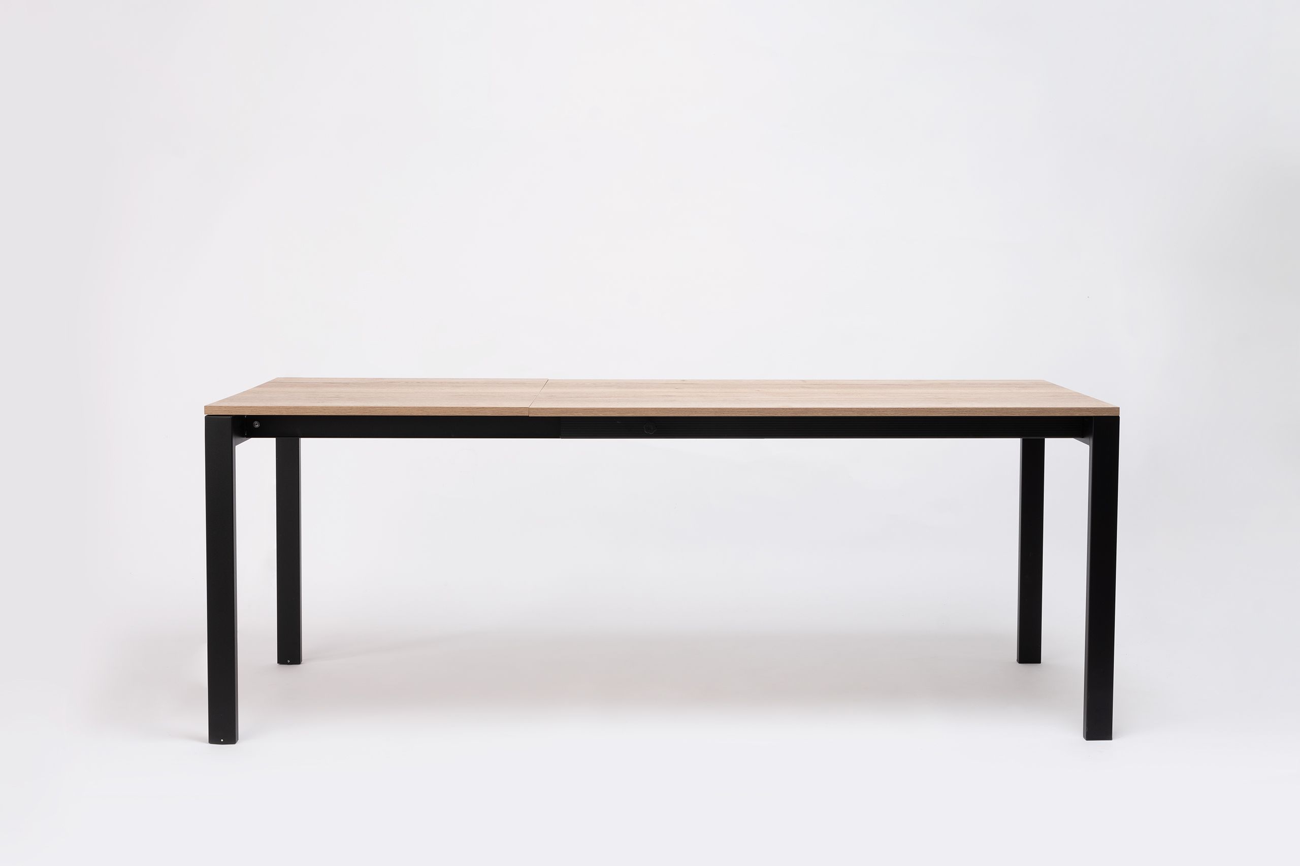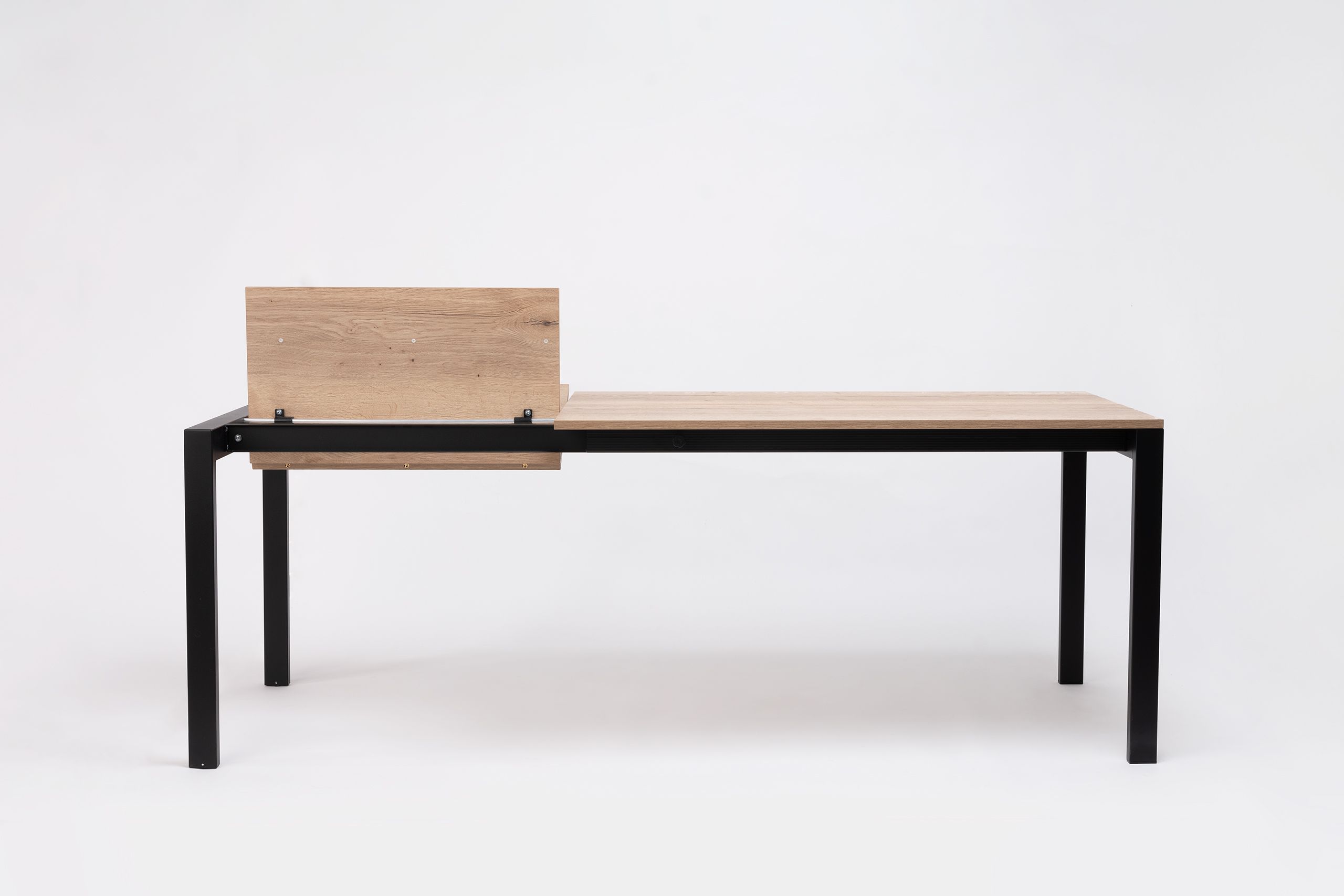Frame with aluminum sliding system. Legs composed of precision rectangular tubing, 60 x 30 mm, and 2 mm thick, in cold-rolled pickled steel. Options for the tabletop include laminate, laminated birch plywood, Arpa Fenix + birch plywood, beech, and oak. For more information, consult the technical sheet.
