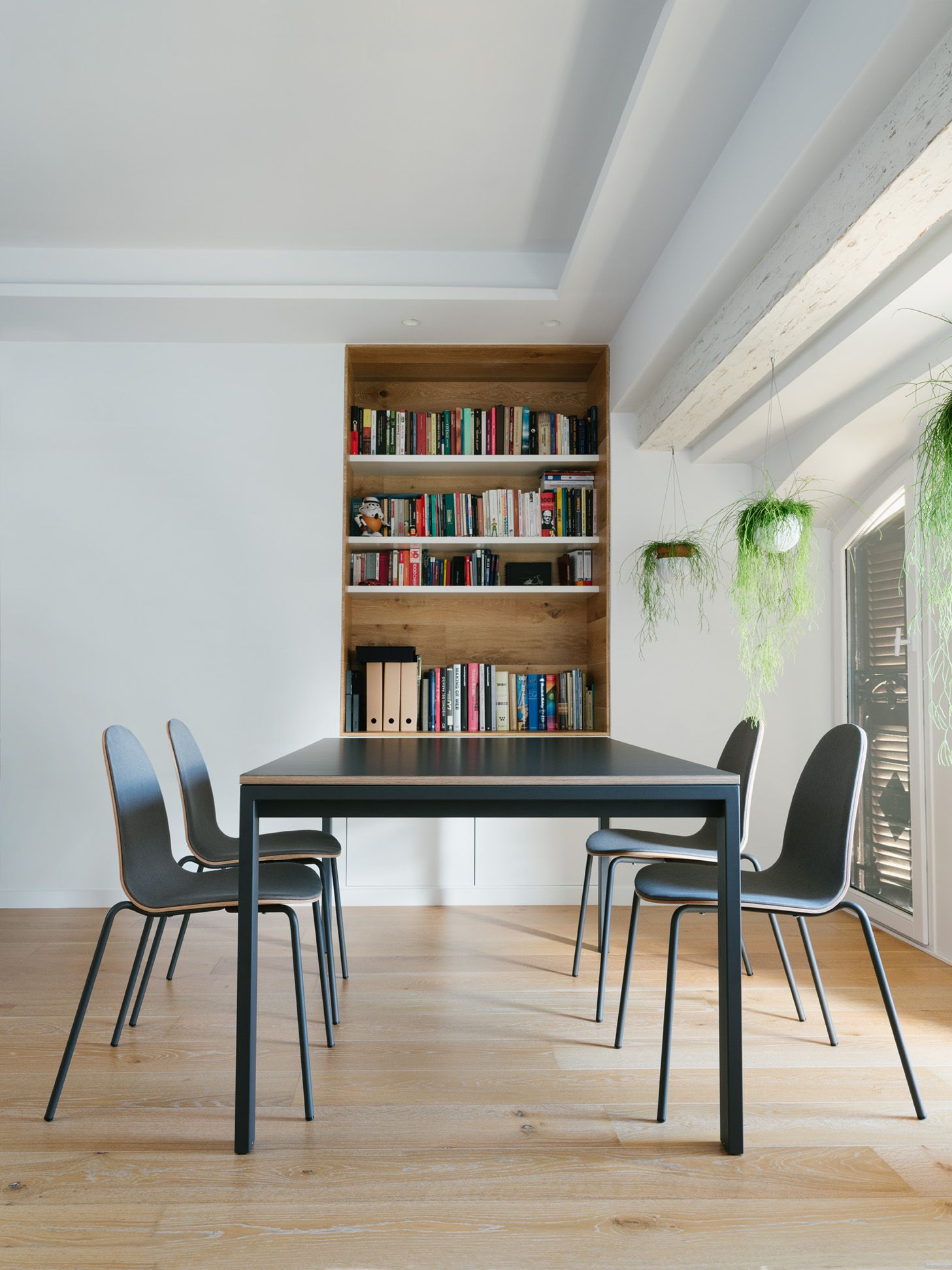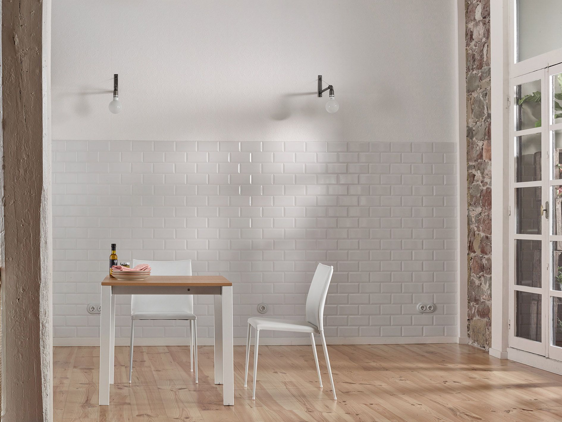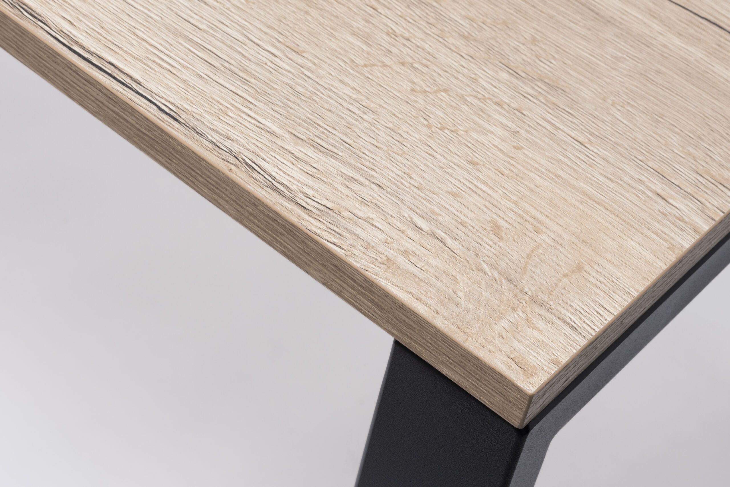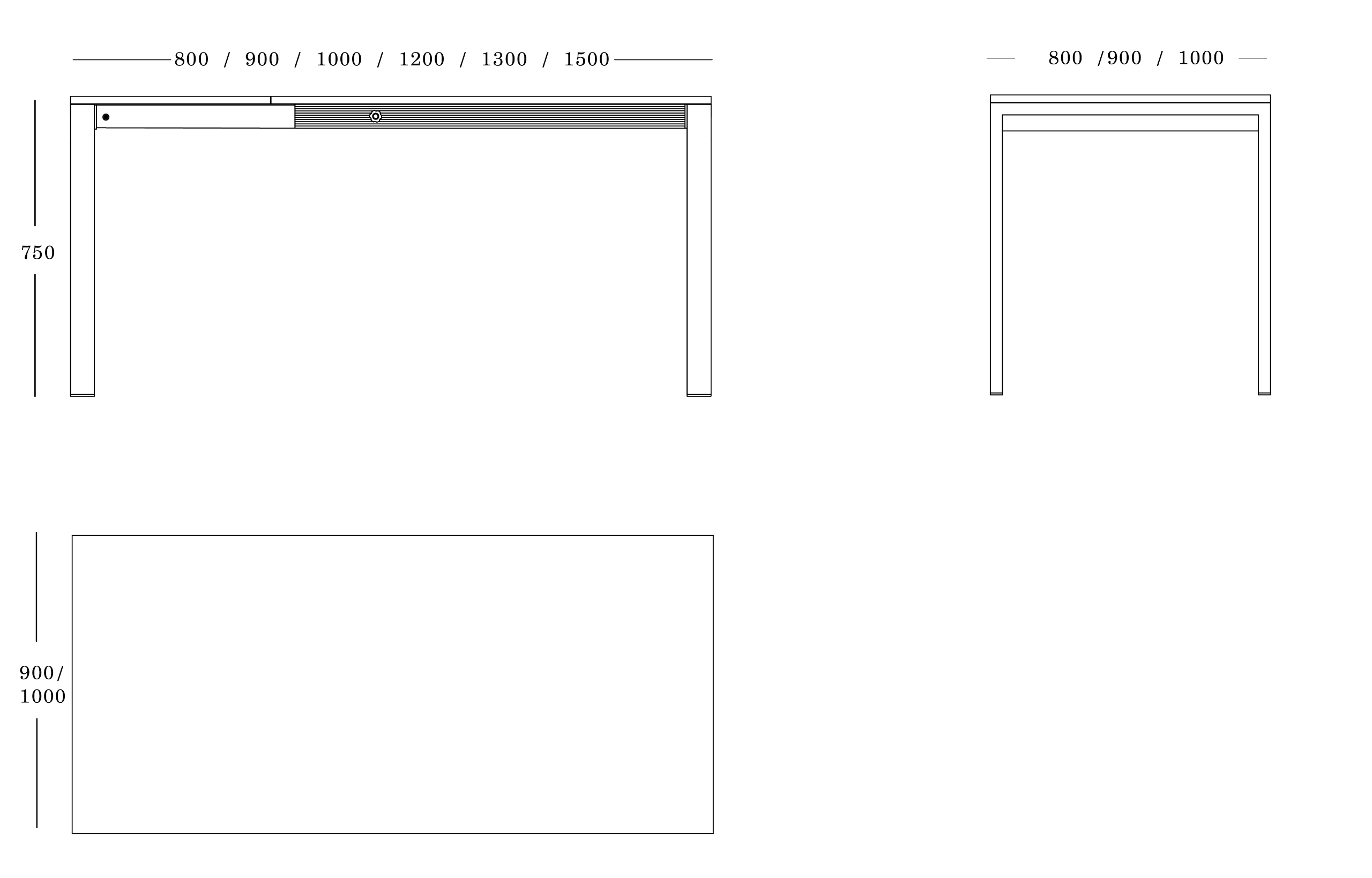 Frame with aluminum sliding system. Legs composed of precision rectangular tubing, 60 x 30 mm, and 2 mm thick, in cold-rolled pickled steel. Options for the tabletop include laminate, laminated birch plywood, Arpa Fenix + birch plywood, beech, and oak. For more information, consult the technical sheet.