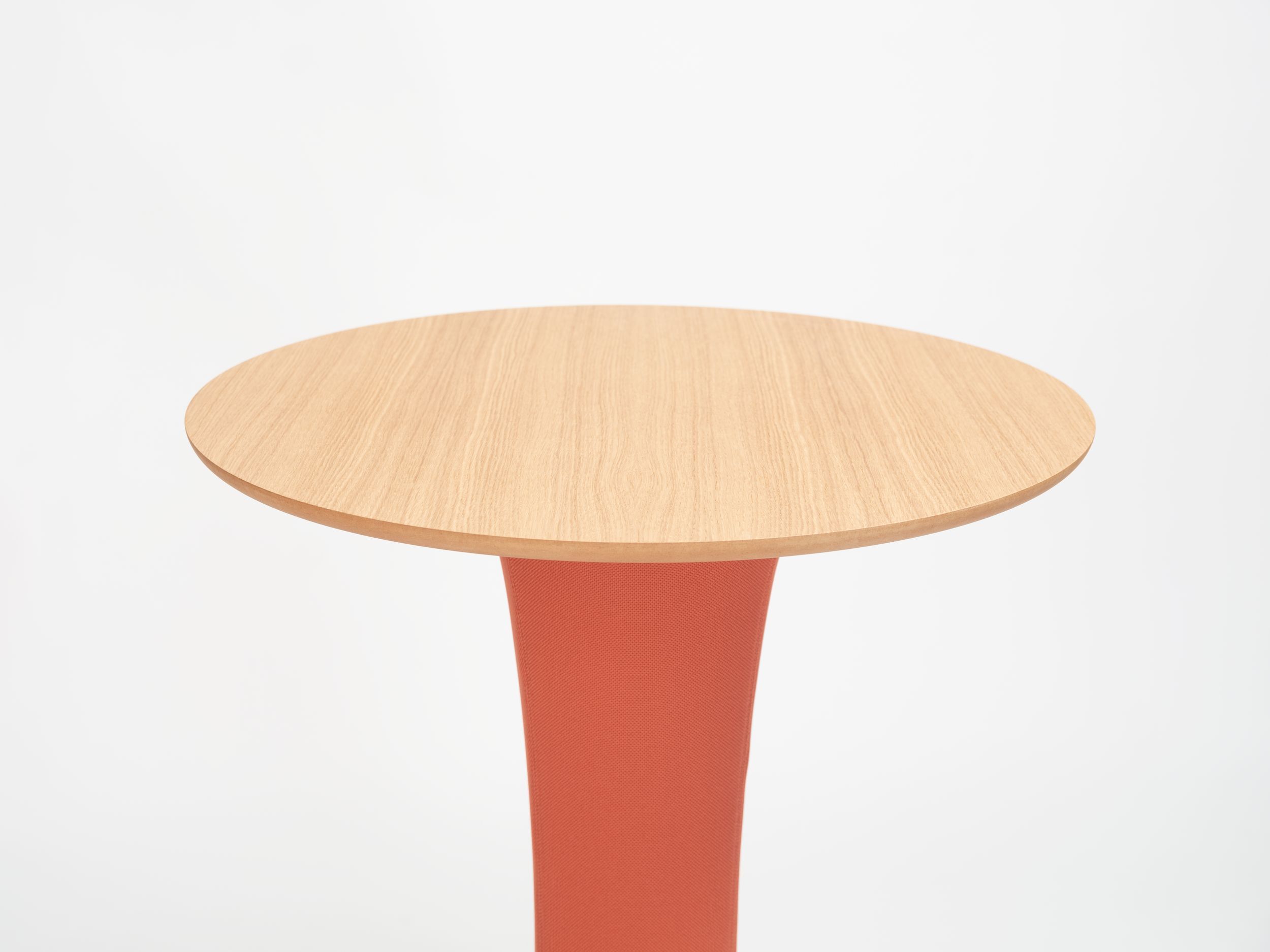 Column made of cylindrical tubing, 100 mm in diameter and 2 mm thick, in recycled cold-rolled pickled steel with a specially designed textile cover for geometric and curved design. Options for the tabletop include oak + MDF, laminated birch plywood, and Arpa Fenix + birch plywood.