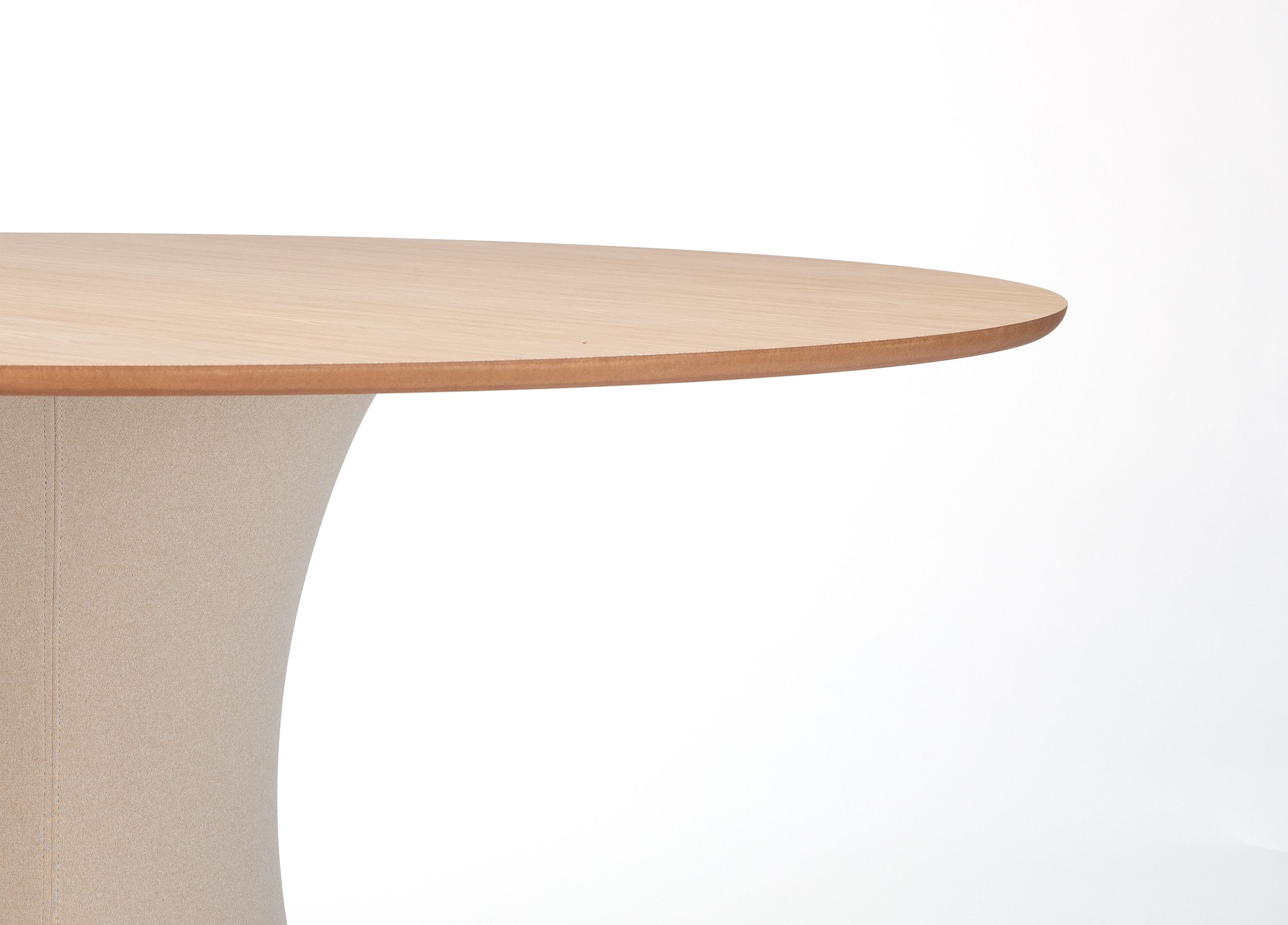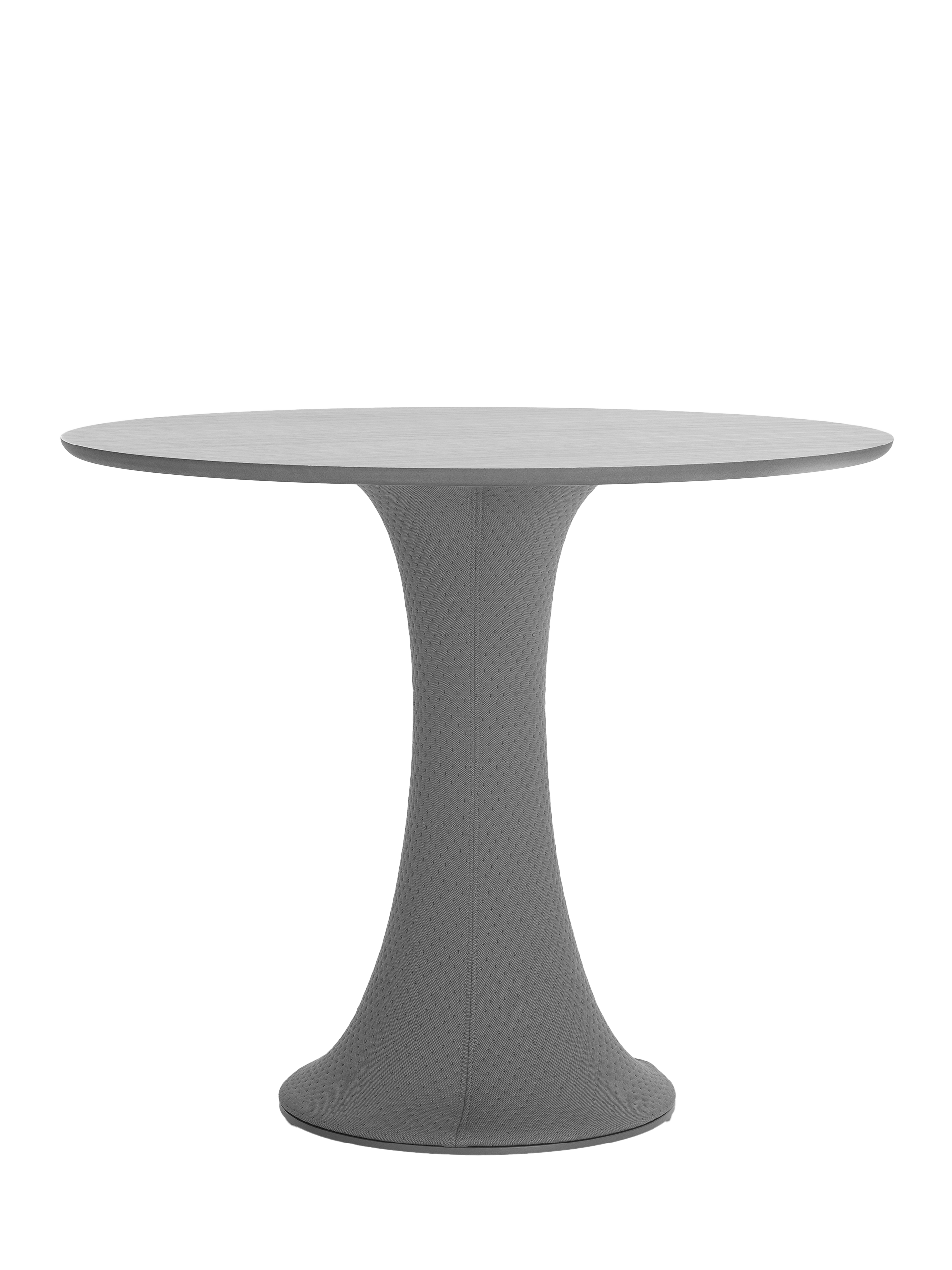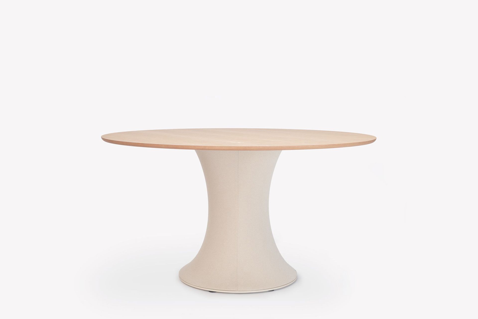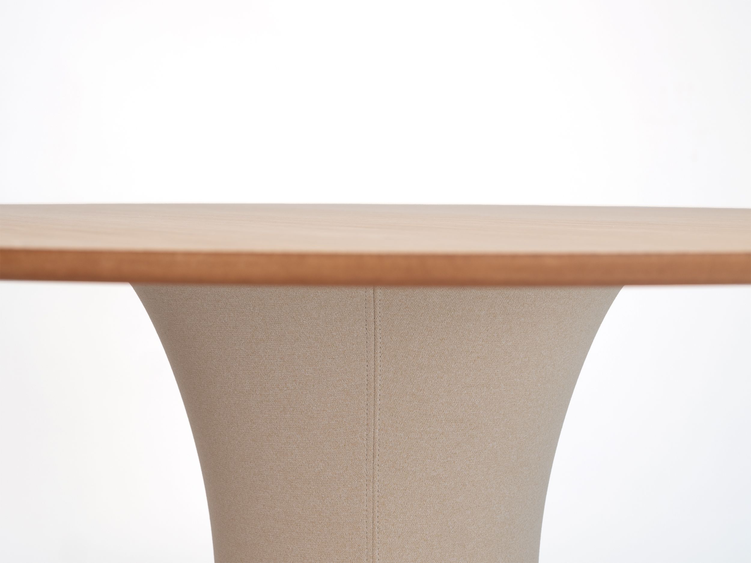 This new collection of tables is born out of the search for pure, soft, and gentle shapes to enhance any interior. The fabric material that envelops the pedestal provides the piece with a sense of warmth and great versatility. It is a functional piece with endless possibilities.