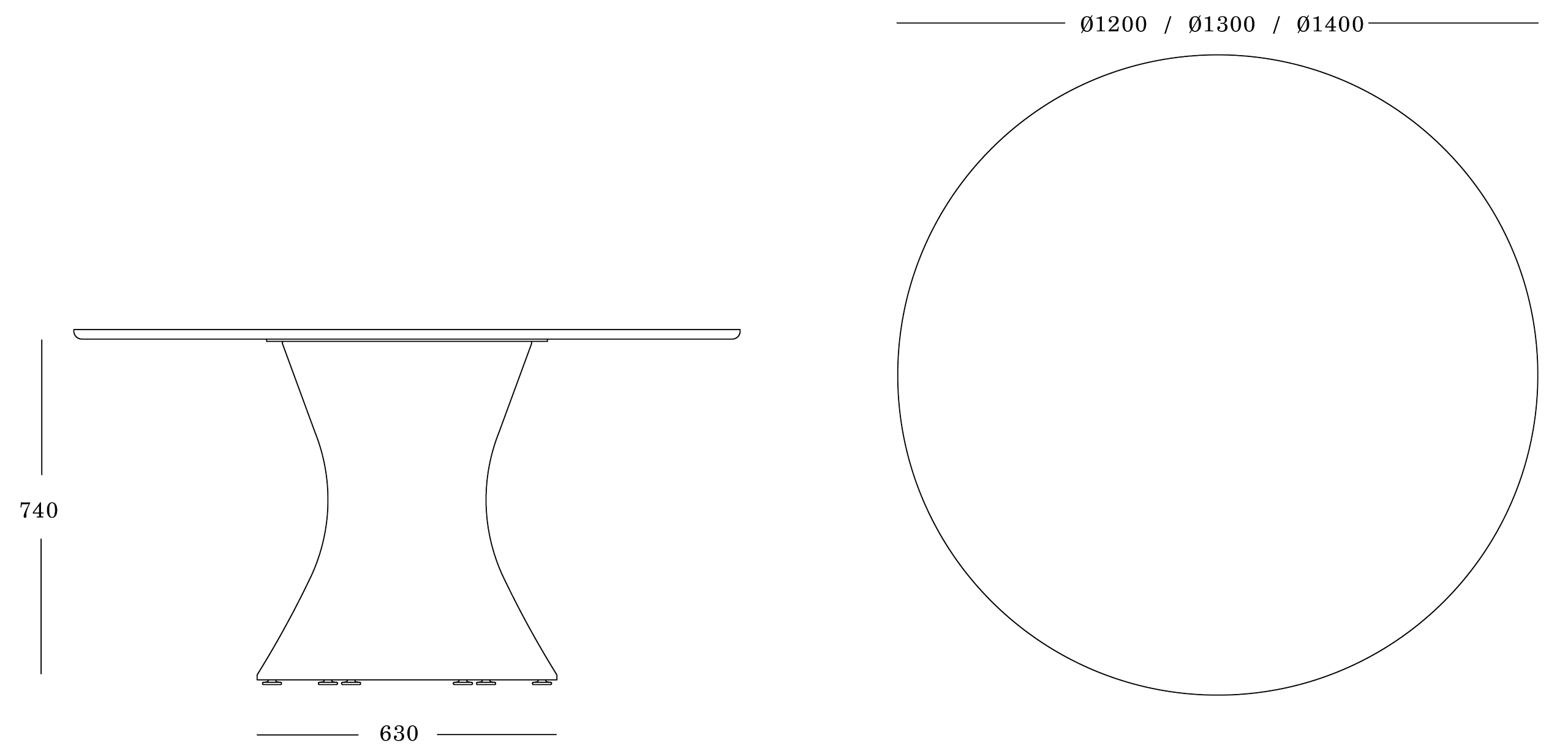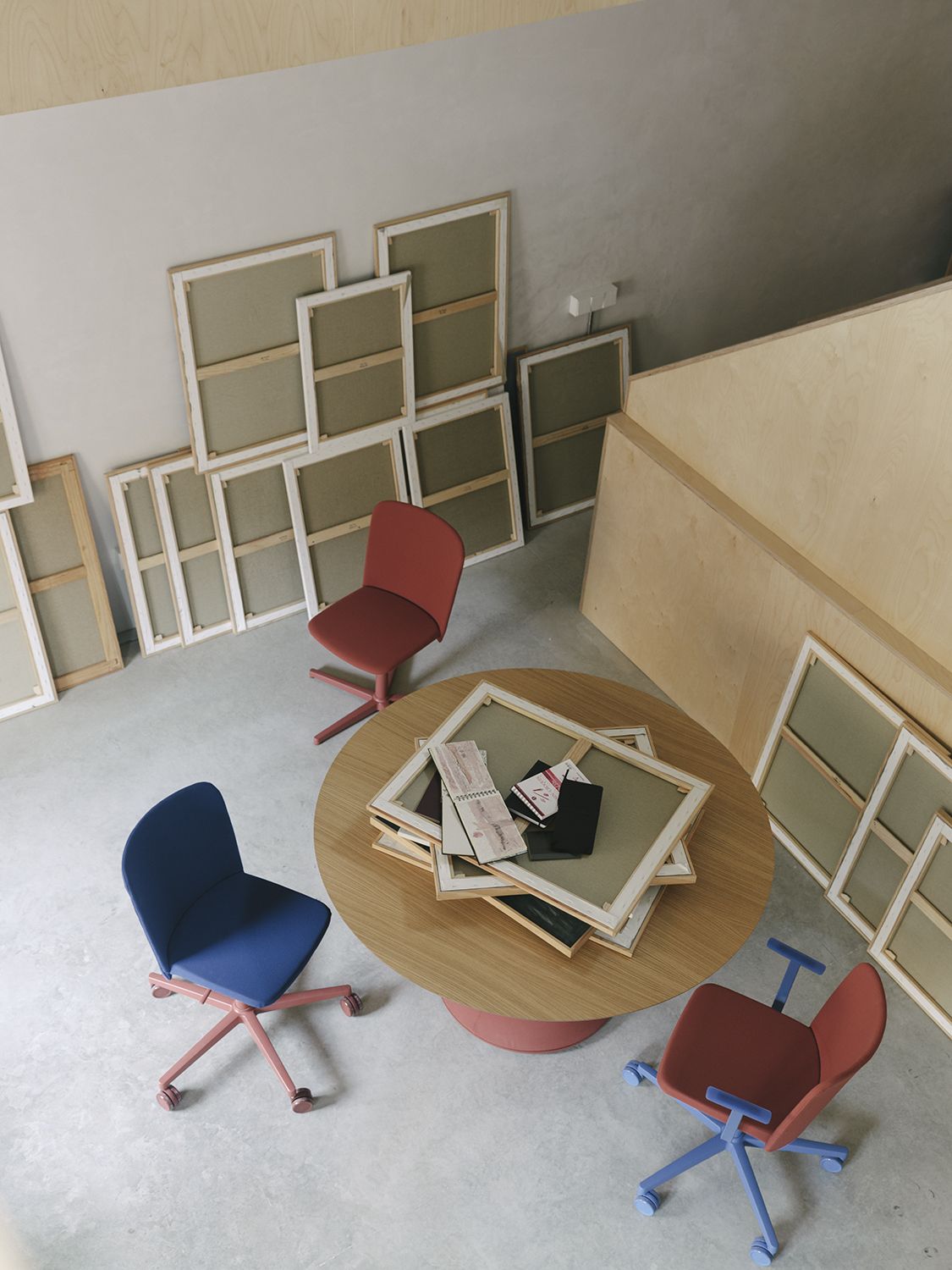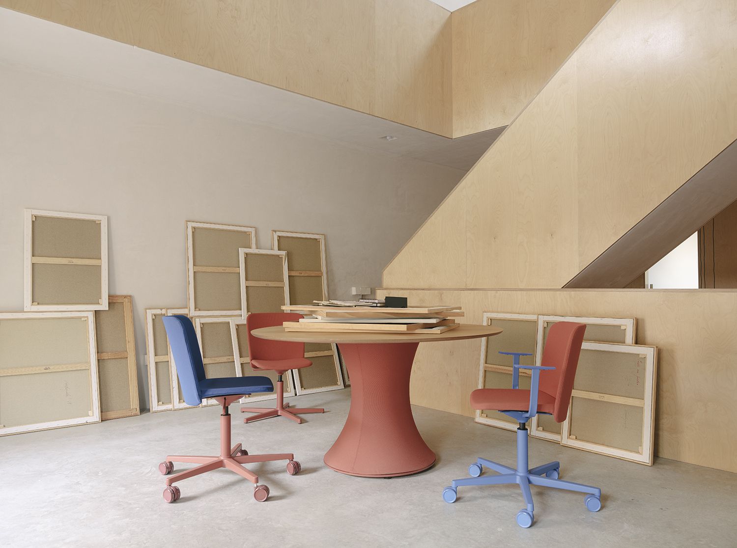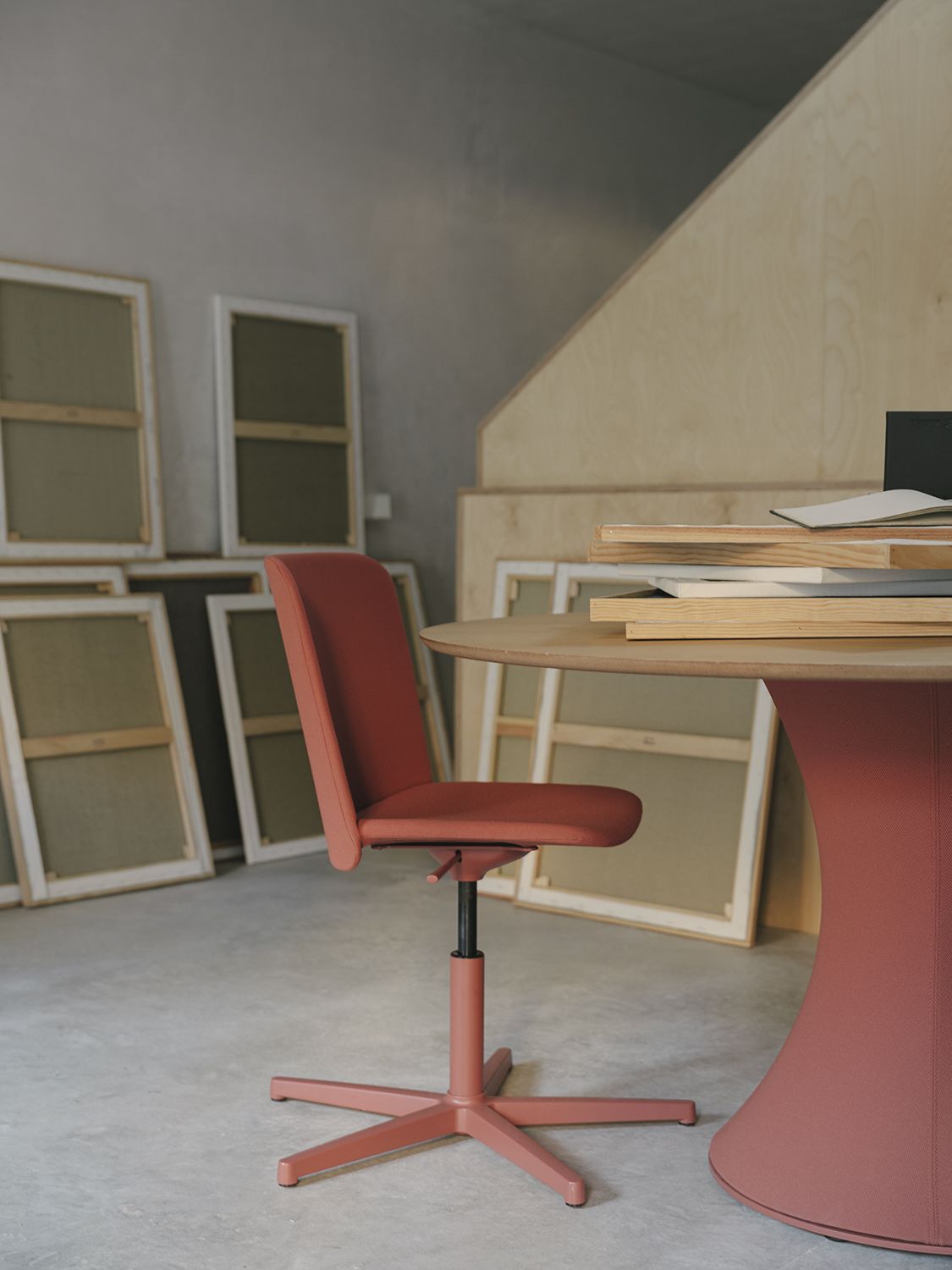 Column made of three cylindrical tubes, 70 mm in diameter and 2 mm thick, in recycled cold-rolled pickled steel with a specially designed textile cover for geometric and curved design. Options for the tabletop include oak + MDF, laminated birch plywood, and Arpa Fenix + birch plywood. For more information, consult the technical sheet.