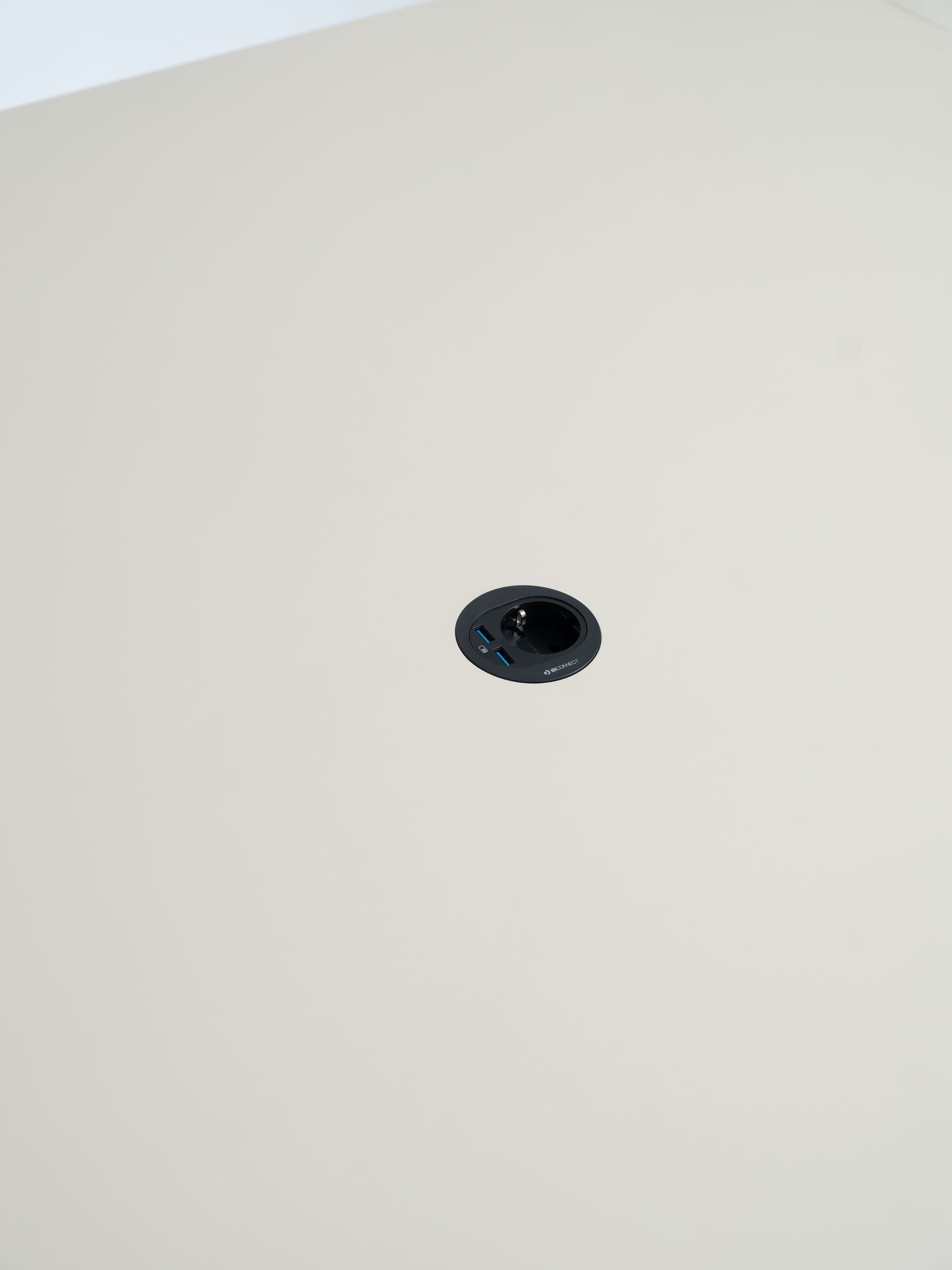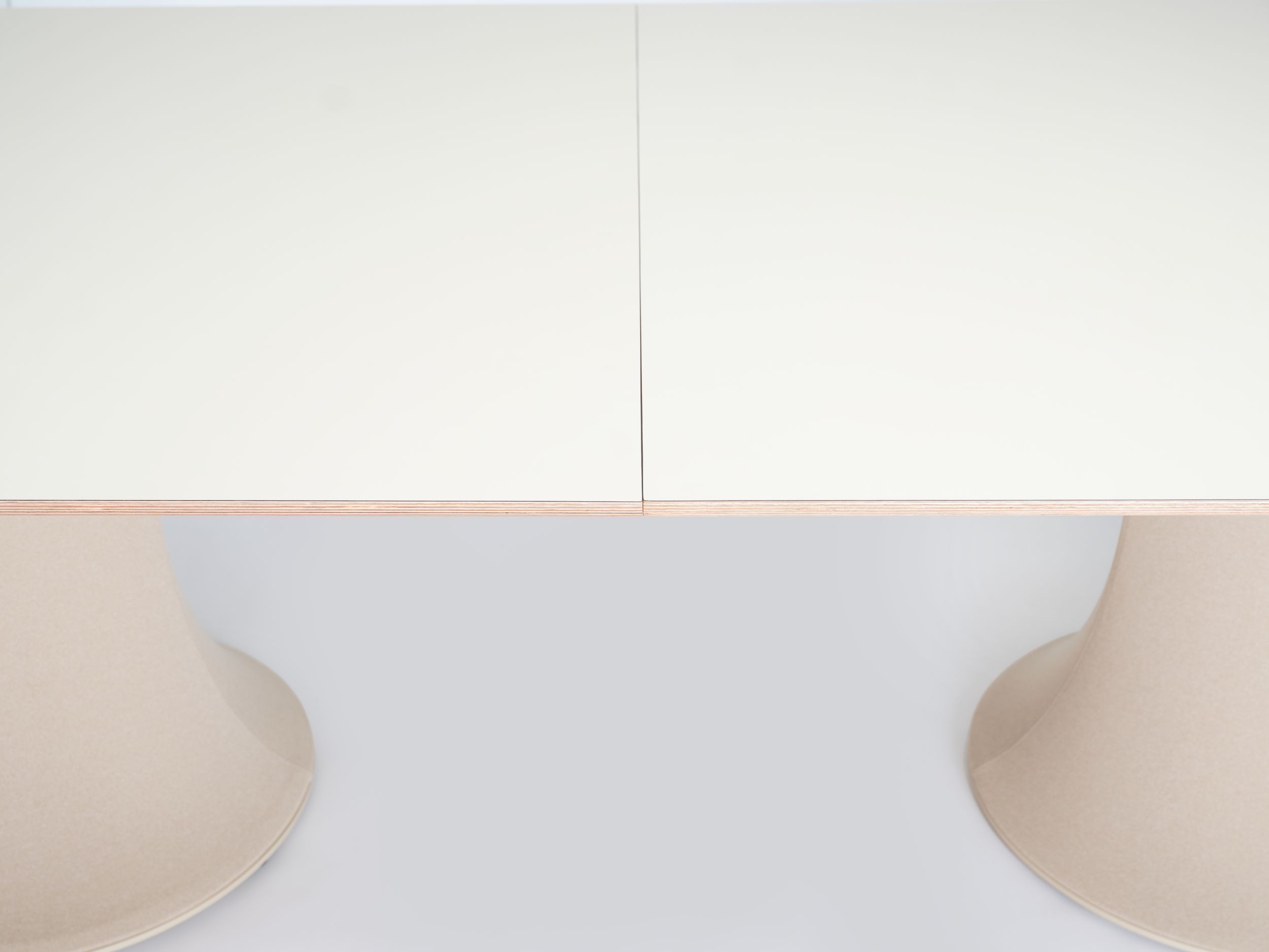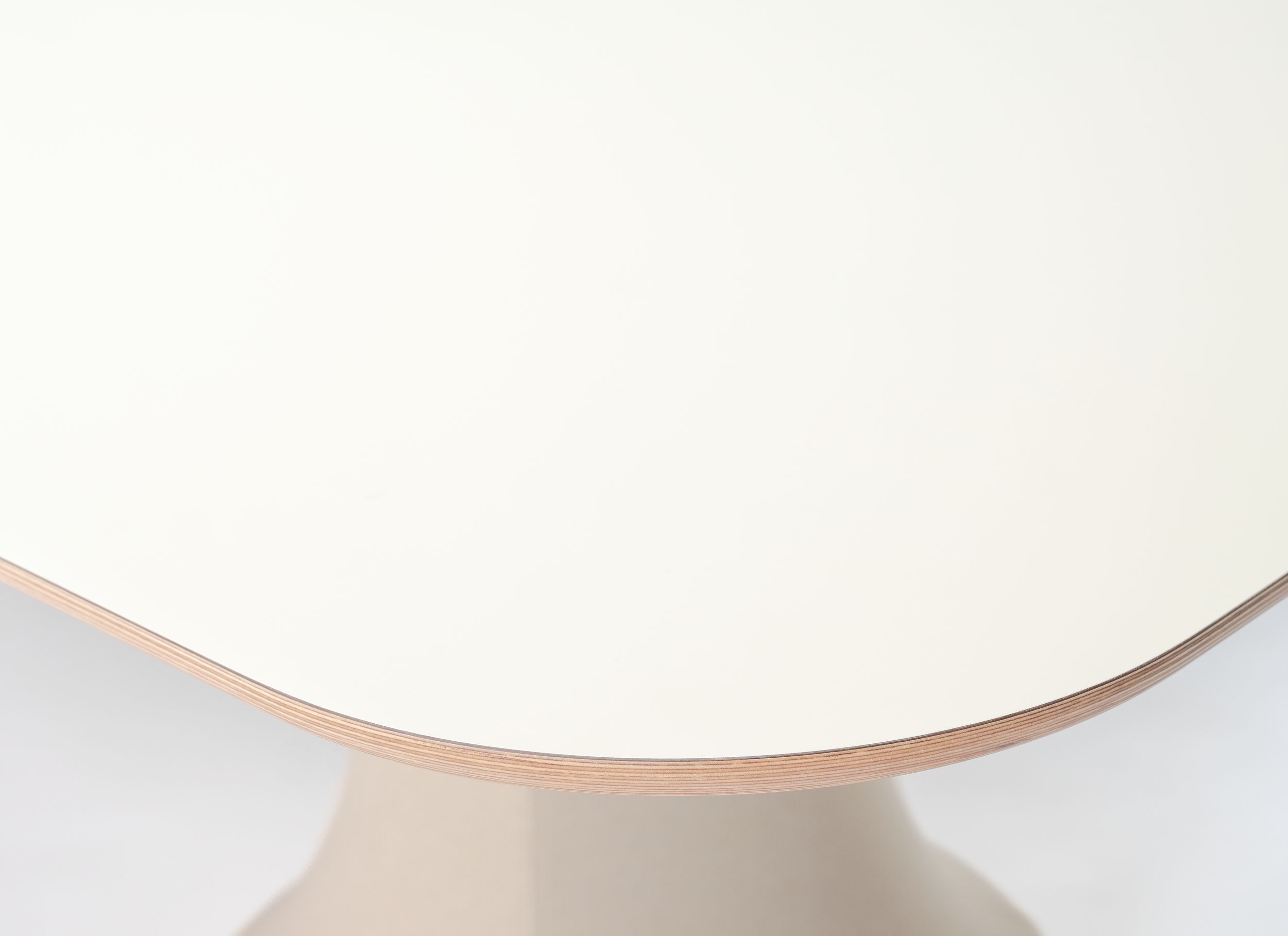 Column made of three cylindrical tubes, 70 mm in diameter and 2 mm thick, in recycled cold-rolled pickled steel with a specially designed textile cover for geometric and curved design. Options for the tabletop include oak + MDF, laminated birch plywood, and Arpa Fenix + birch plywood.