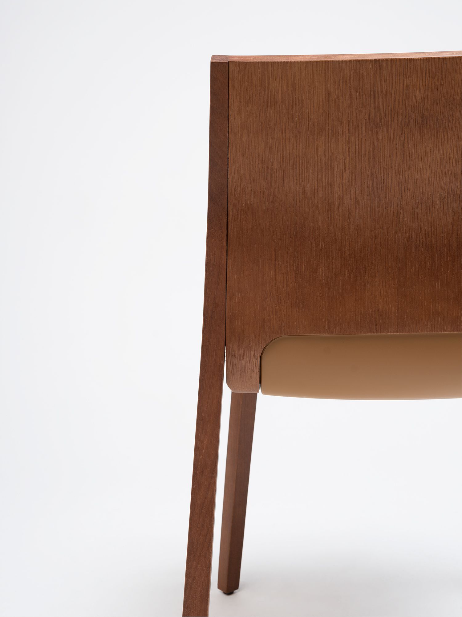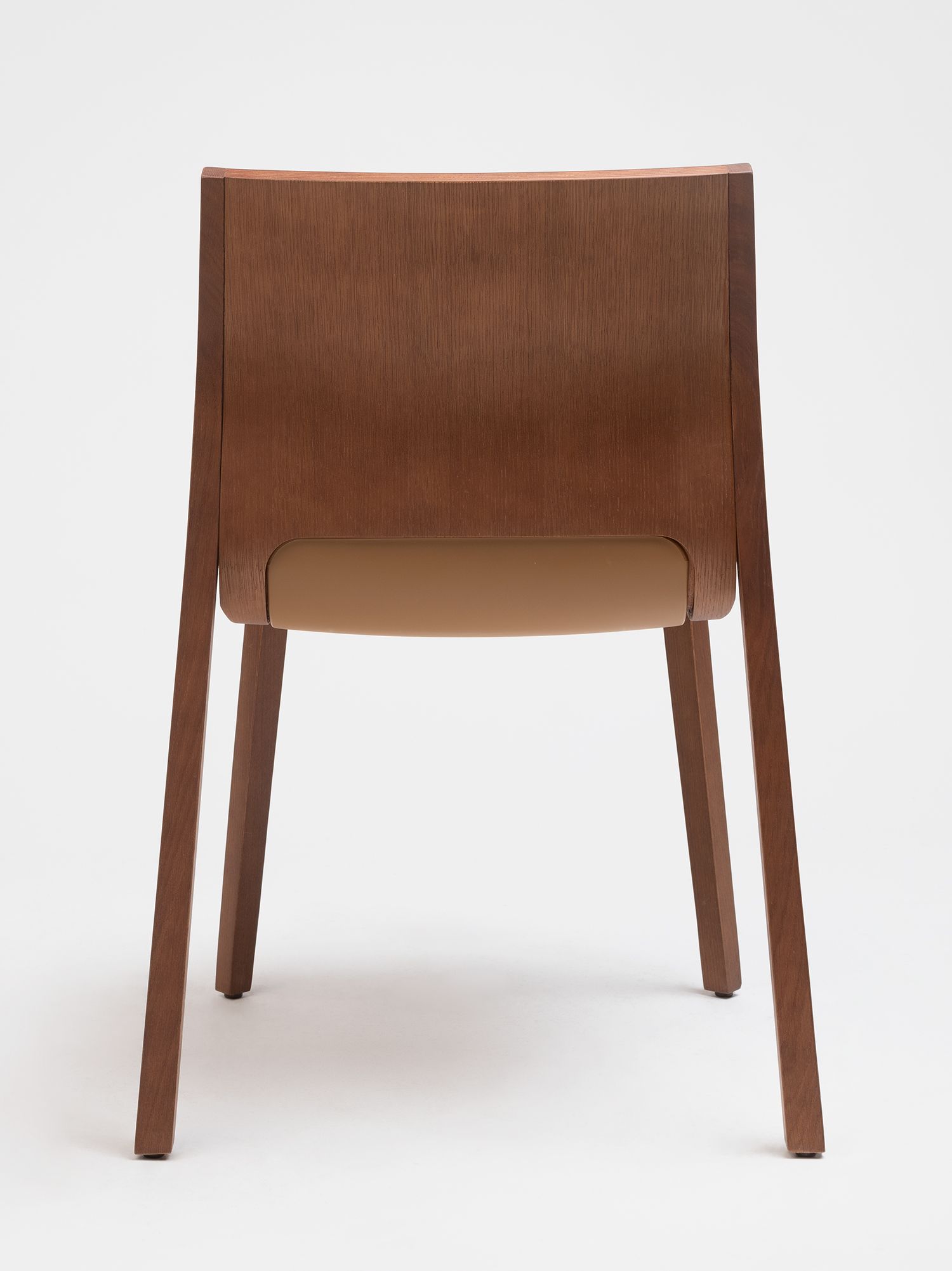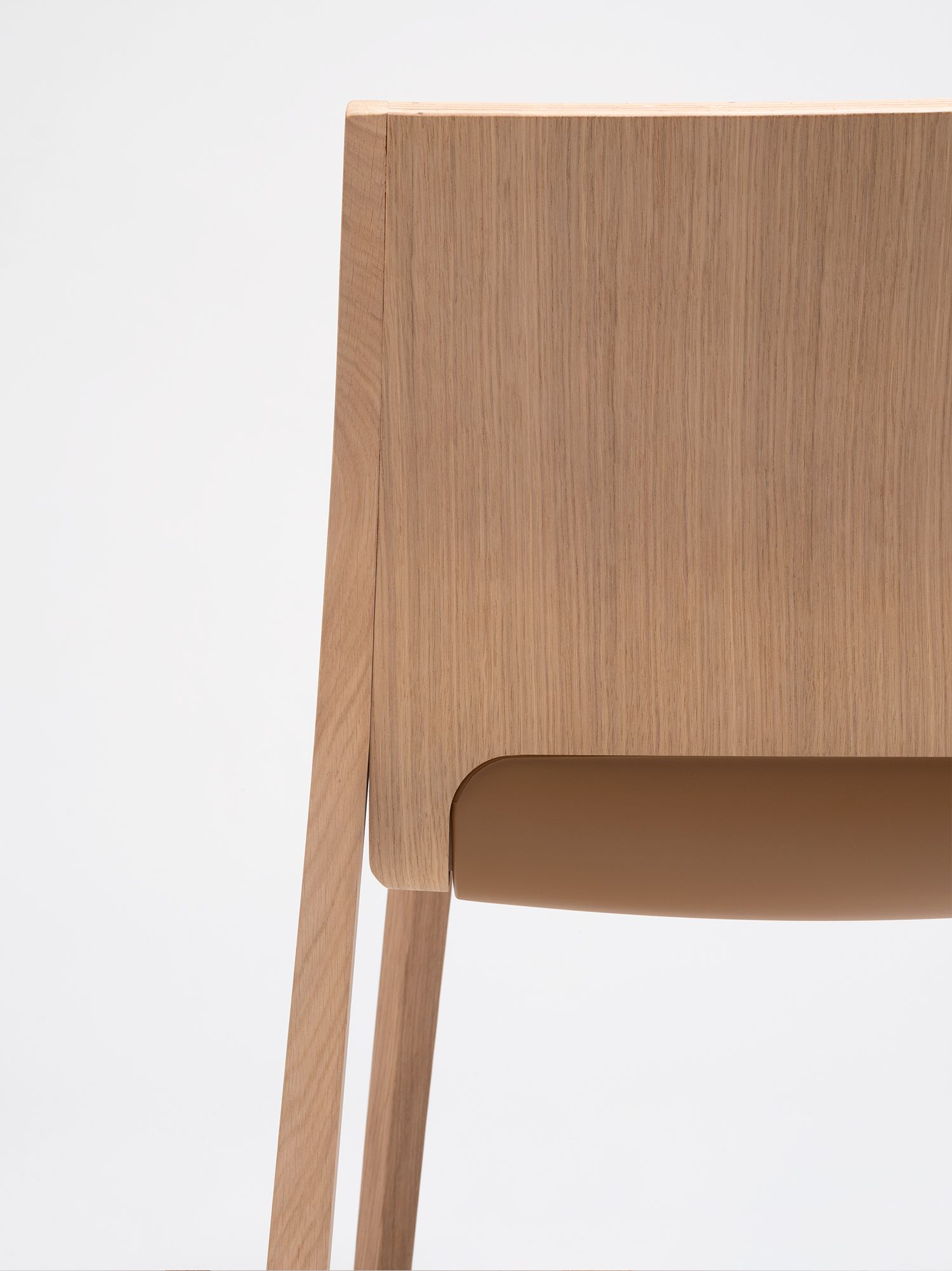Frame made of solid oak wood, machined and curved through a specialized steaming and pressing process. Shell made of oak plywood composed of over twenty pre-treated layers for optimized bending, arranged with alternating fiber orientation to enhance strength. Upholstered seat option available. Stackable chair. For more information, consult the technical sheet.