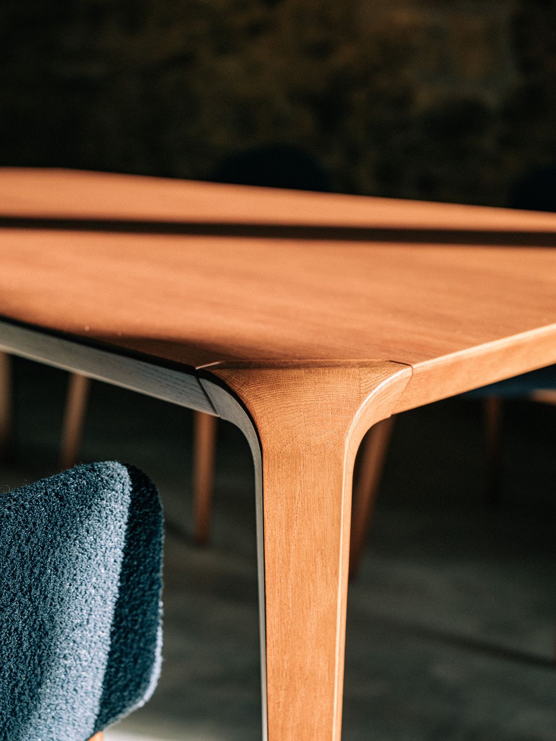 Legs made entirely of solid oak wood. Tabletop in solid oak wood, 30 mm thick, treated and machined with CNC with beveled edge. For more information, consult the technical sheet.