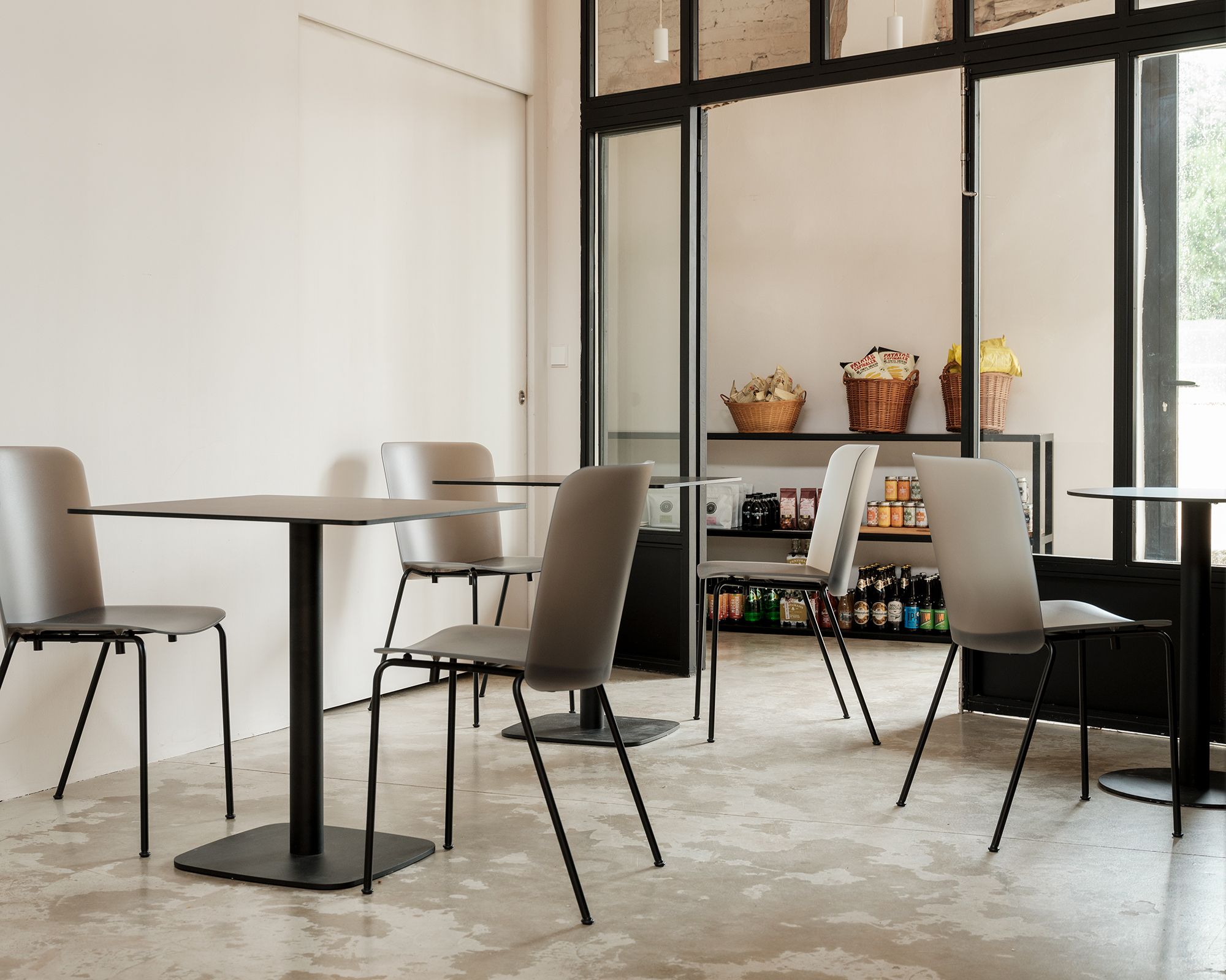 Structure composed of precision cylindrical tubing, 16 mm in diameter and 2 mm thick, in recycled cold-rolled steel. Shell made of a special translucent impact-textured copolymer for a matte finish. Upholstered finish also available. Stackable chair. For more information, consult the technical sheet.