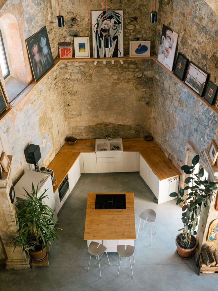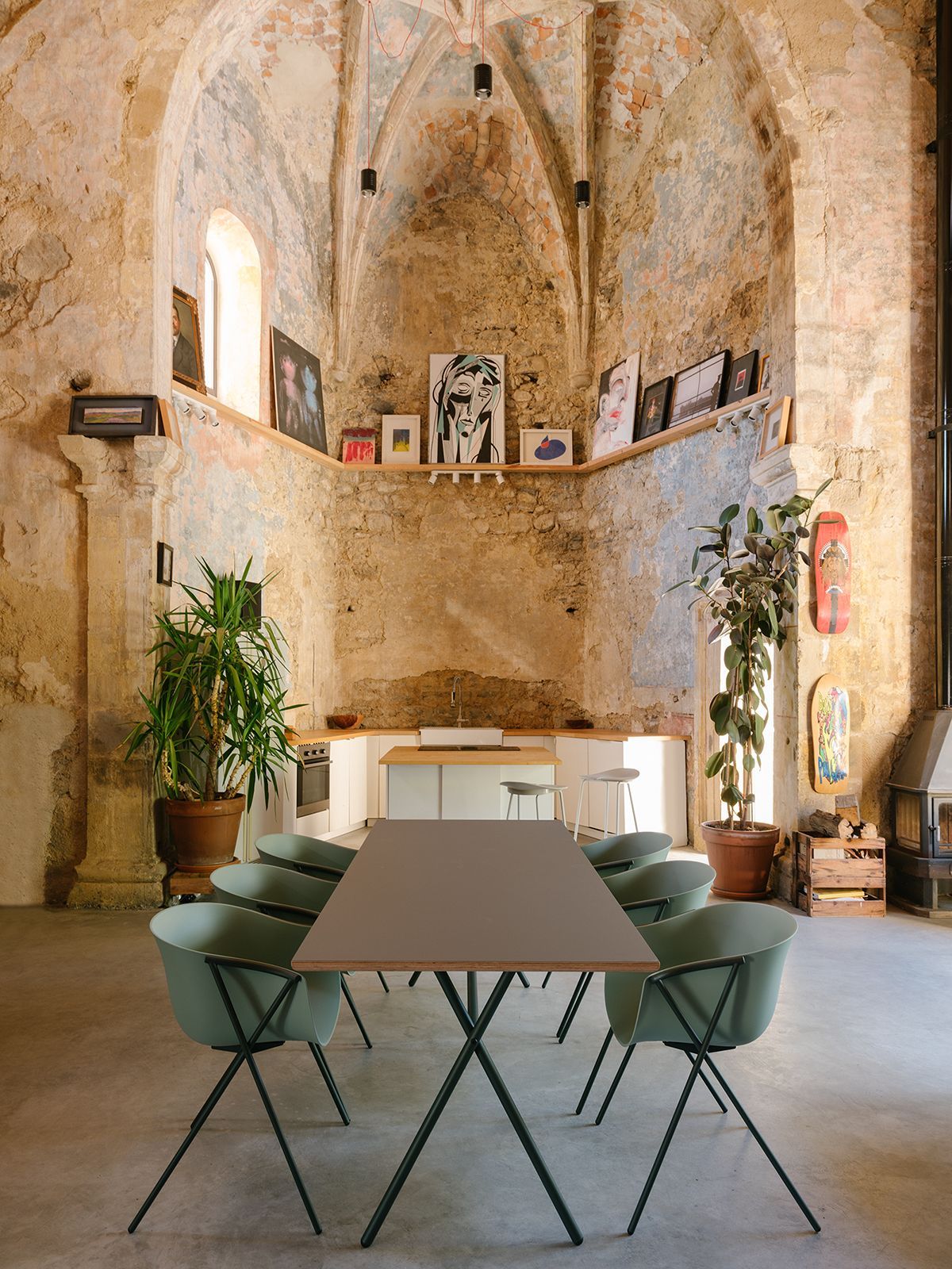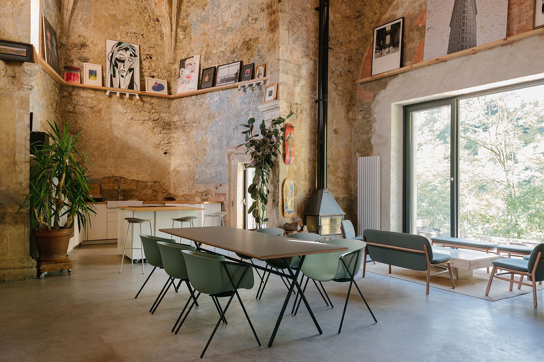 Una iglesia de pueblo, en una calle pequeña que bordea un valle. En su interior no hay fronteras, no hay división. En su interior, techos altos, un ábside, un transepto, una nave. Para los ojos de cualquier visitante, una escena medieval. Un hogar, en un antiguo pueblo, sobre una calle moderna bordeando el filo que cae a un profundo valle verde. En su interior, camas para dormir, espacios para leer, para oír música y dibujar, para compartir cenas con amigos queridos, para descansar. La antigua ruina vive de nuevo, vuelve a respirar.