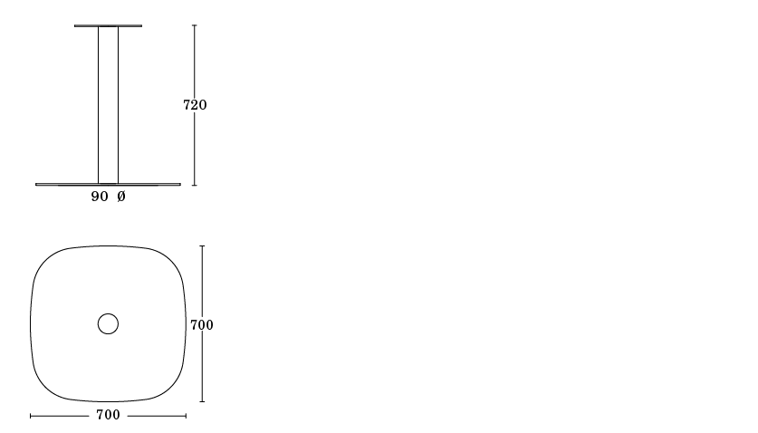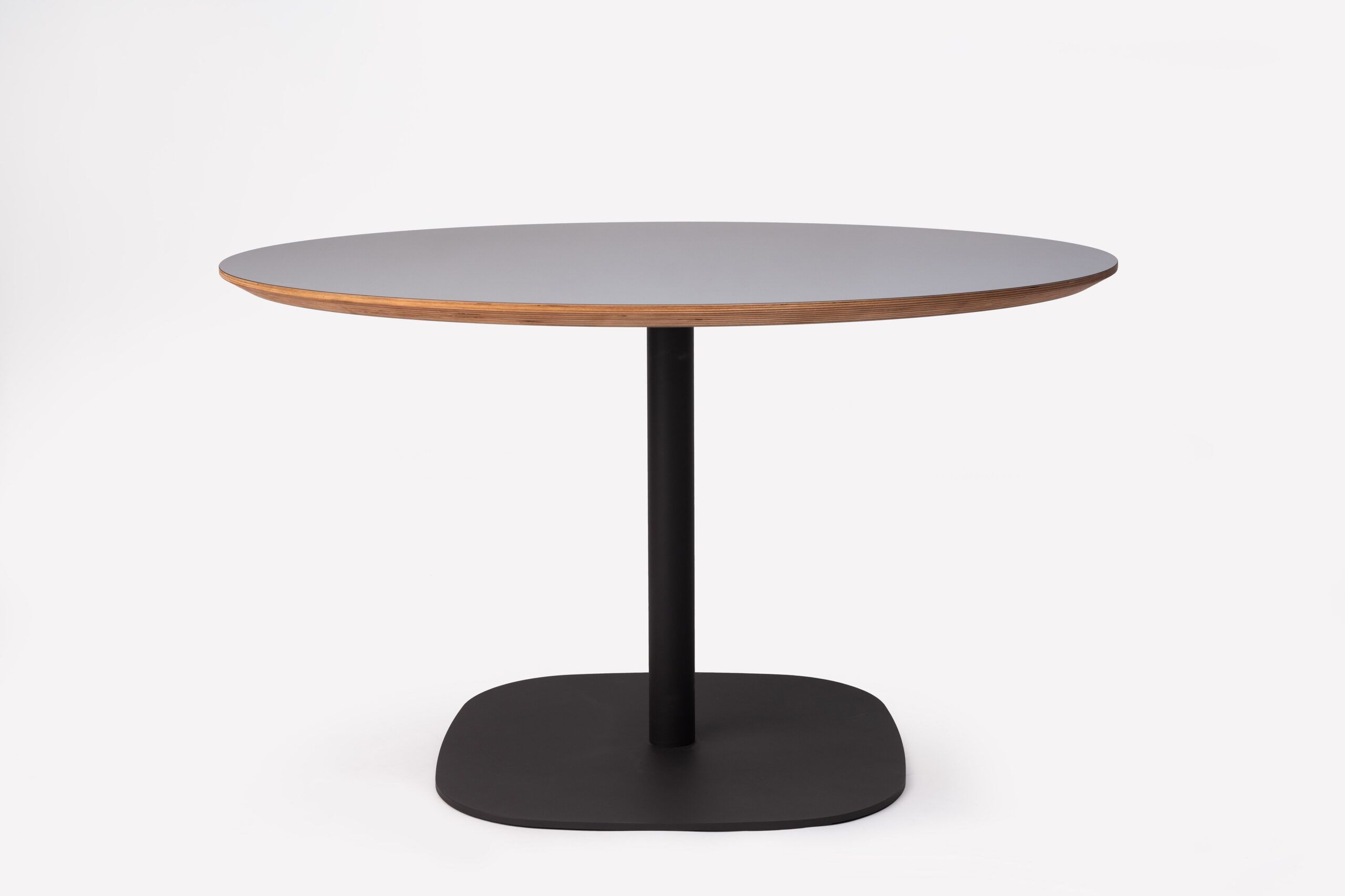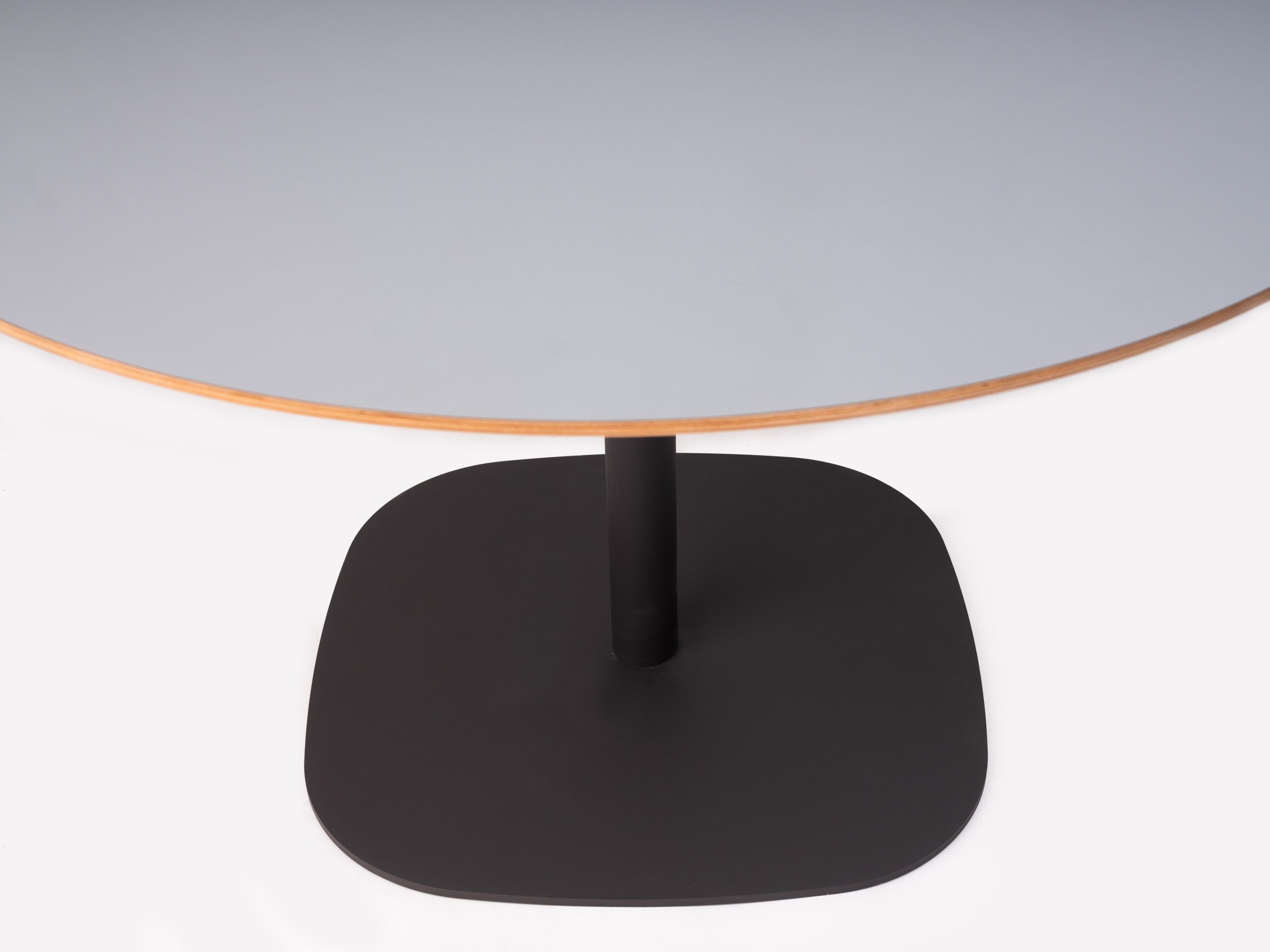 Tubo cilíndrico de 90 mm de diámetro y 2 mm de grosor en acero decapado. Encimeras variadas en madera de haya, roble, laminado, compacto, laminado + contrachapado de abedul, arpa y laminado + contrachapado de abedul.