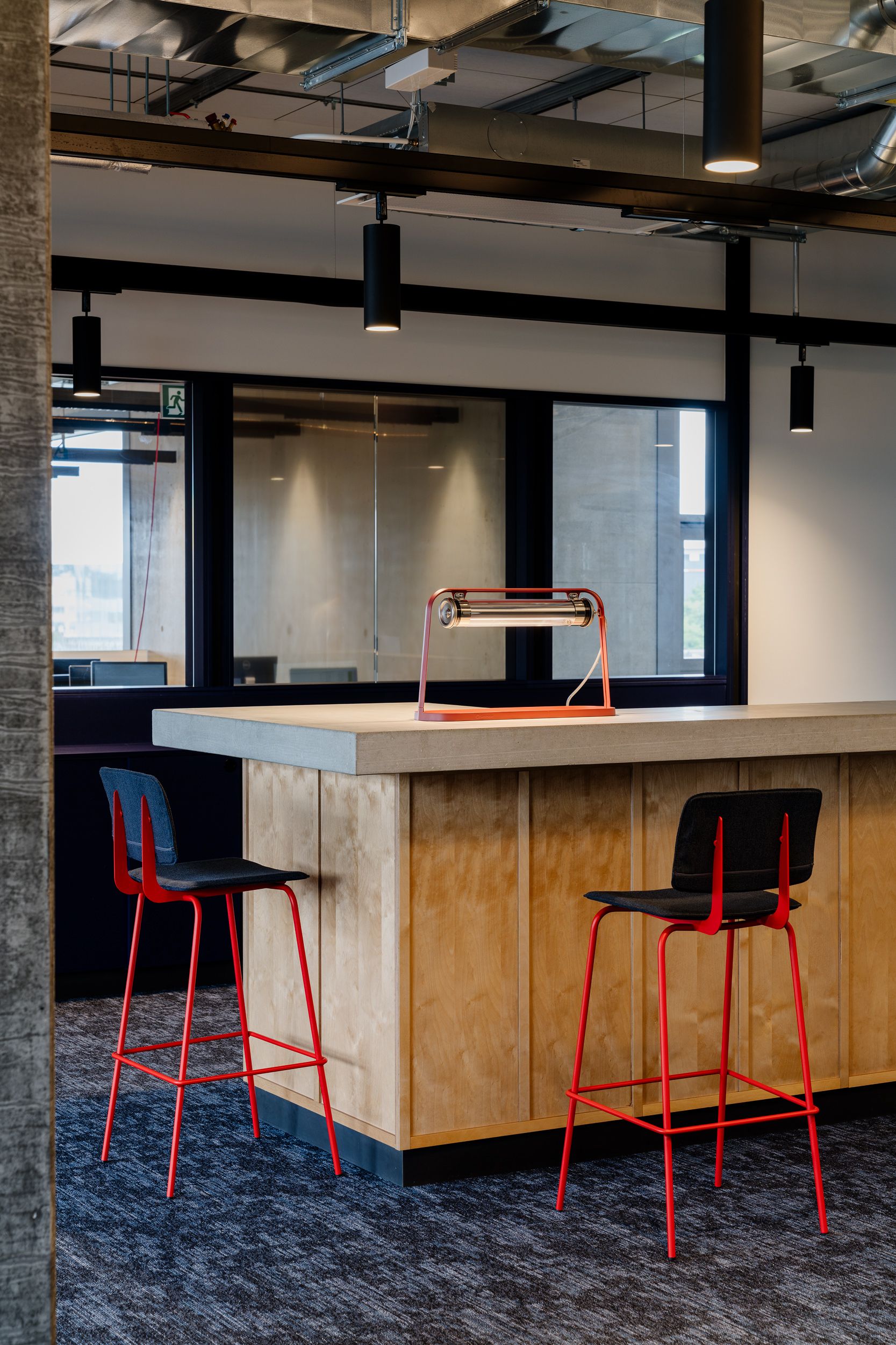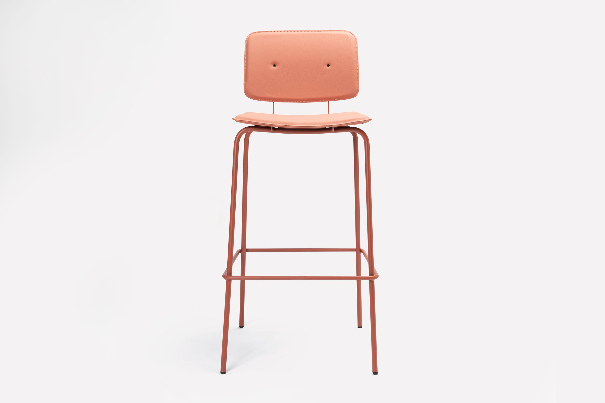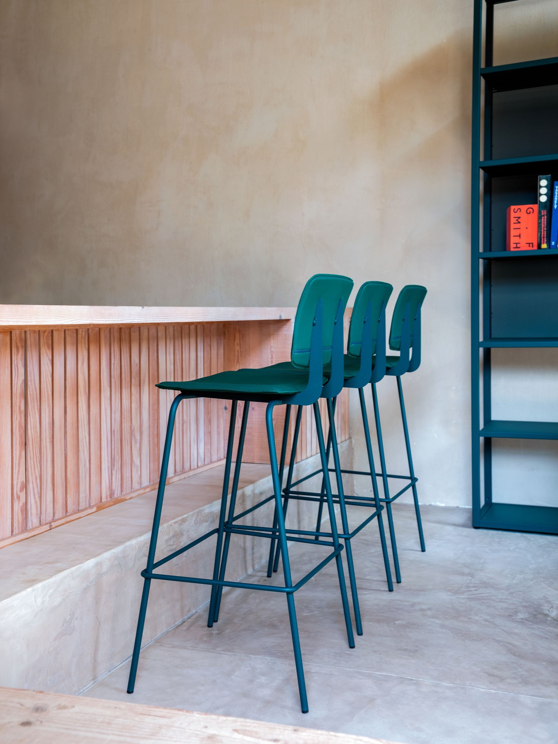 El taburete Don, estilo industrial contemporáneo, disponible en dos alturas 65 y 75. Con estructura de chapa metálica y los tornillos del respaldo a la vista, aportando ese toque retro y original a tu espacio de trabajo.