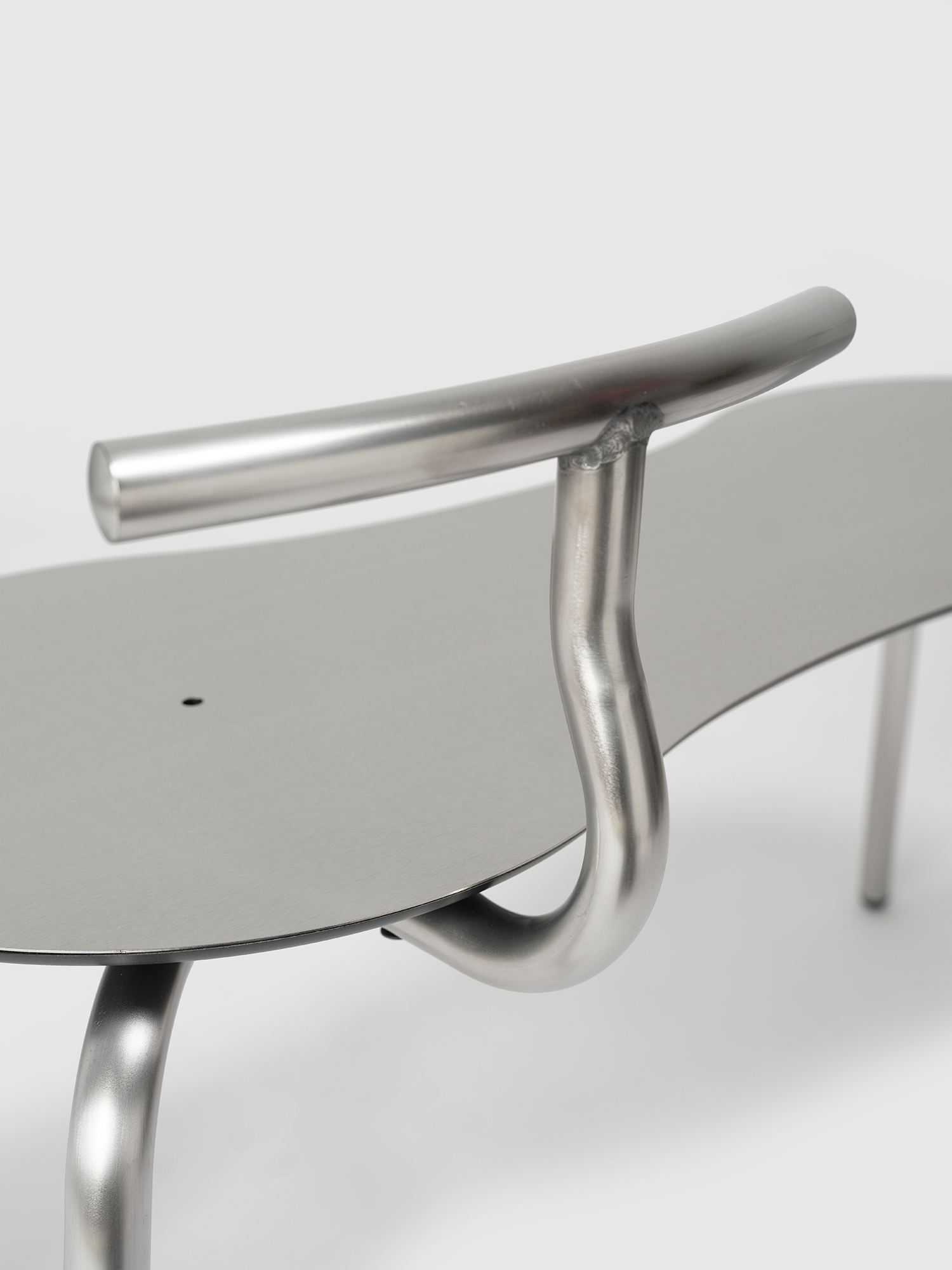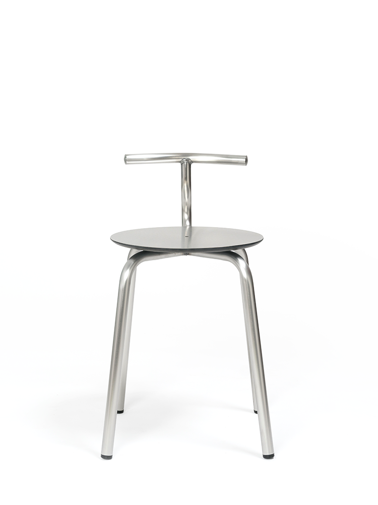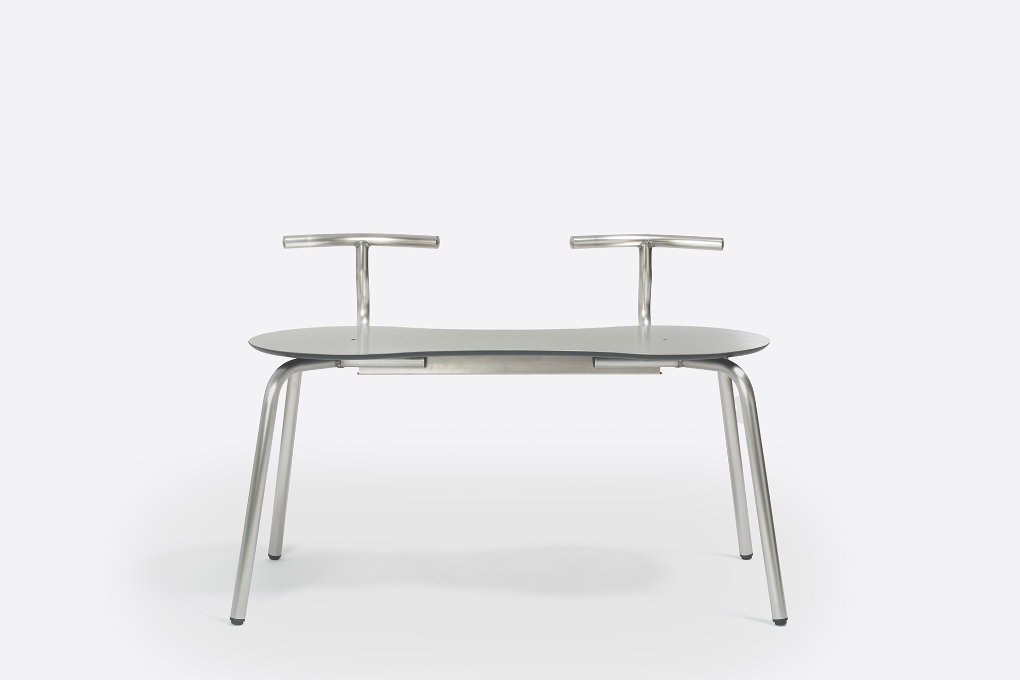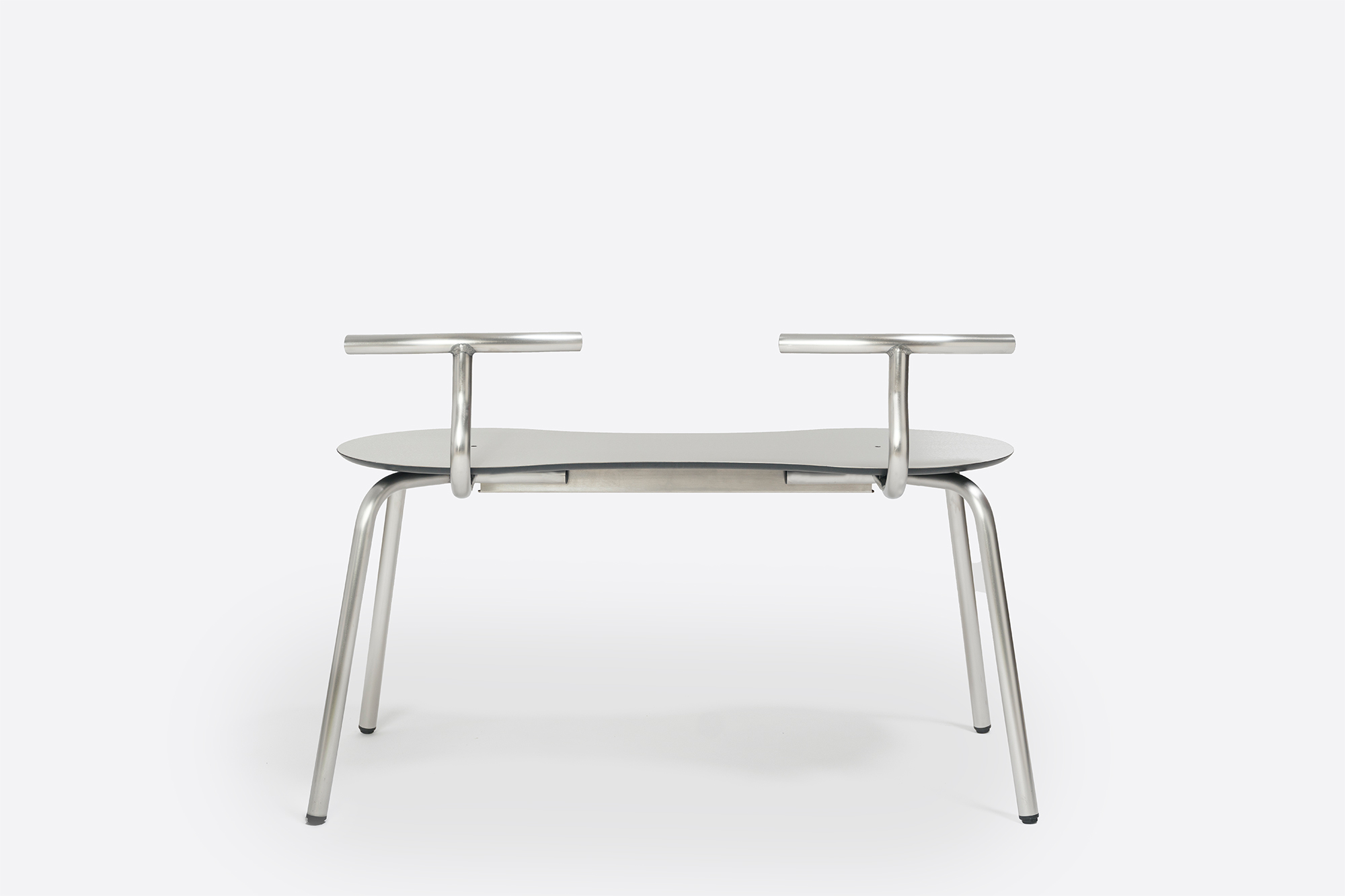 precisión de 2 mm de grosor en acero inoxidable. El asiento se presenta en acabado de acero inoxidable o con cojín opcional disponible como accesorio, confeccionado en tejidos Outdoor.
